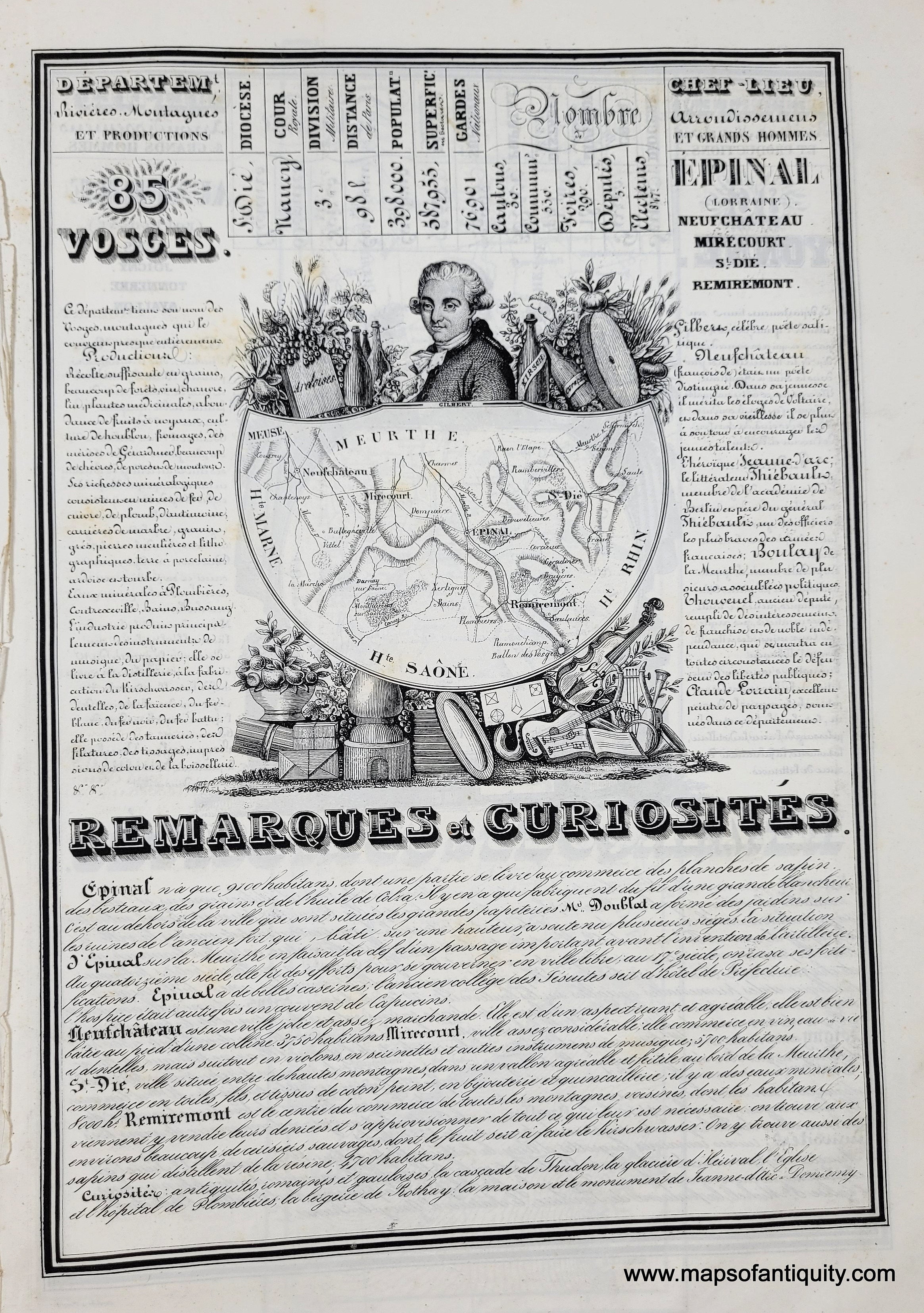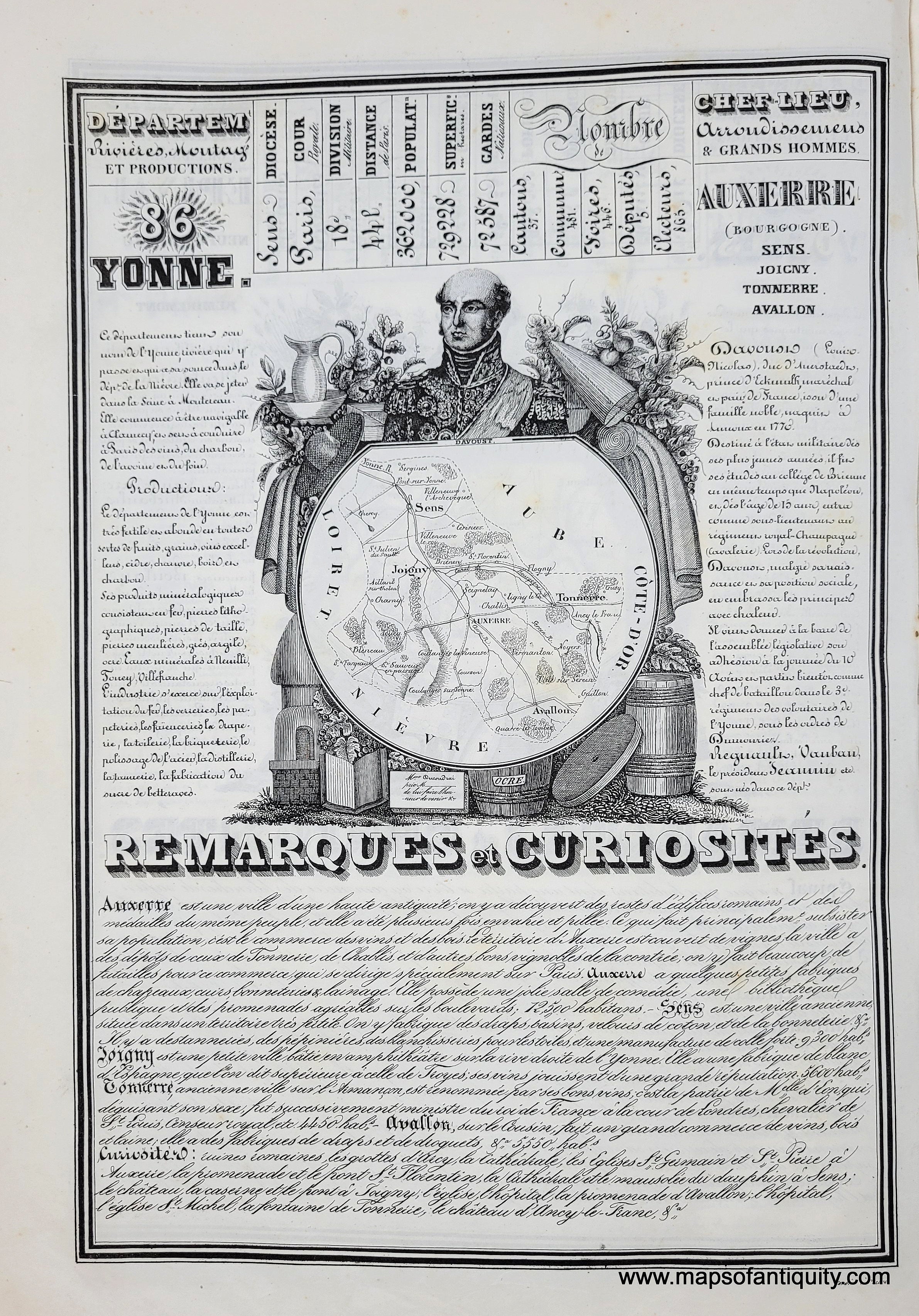 Antique double-sided page with maps of the Departments of Vosges and Yonne, France, published in the Nouvelle Geographie Et Statistique De La France, Alger Et La Belgique, Suivie D'Un Traite Sur Le Monde Entier... 1842 (5th edition) by Alexandre Corbin. This charming page features text relating to the statistics of the Department, including rivers, mountains, industries, notable residents, and "remarks & curiosities" as well as a small map of the region surrounded by illustrations of the local products and one notable/historical personage (Gilbert in Vosges and Davoust in Yonne). Very good antique condition with some minor stains in the margins. Paper is lightweight and the image/text on verso is slightly visible but this can be reduced by backing with a black backing when framing. Measures approx. 13.5 x 9.5 inches to the neatline.