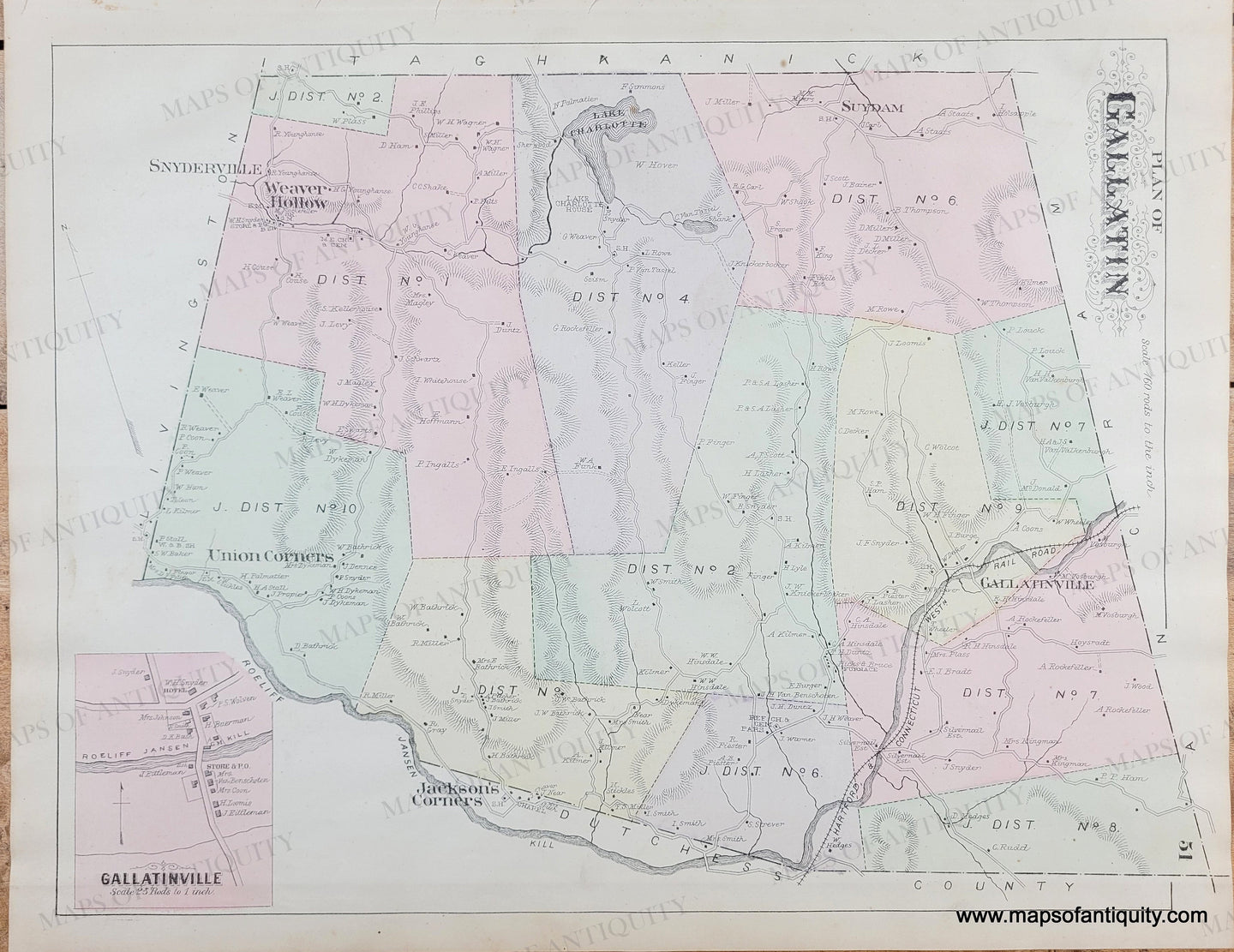 Antique hand-colored map of Gallatin, New York, from the Atlas of Columbia County, New York, by Beers, Ellis & Co. 1888. Includes an inset map of Gallatinville. Both maps are oriented in a different direction than the title. Shows names of property owners at the time of publication, railroads, topography, and some points of interest (e.g. store, chapel, etc.) Original hand-coloring by district, with labeled district numbers. Very good antique condition with mild toning overall, some very minor wrinkling of the paper, and some areas of minor soiling/staining. Measures approx. 15" x 11.5" to the neatline.
