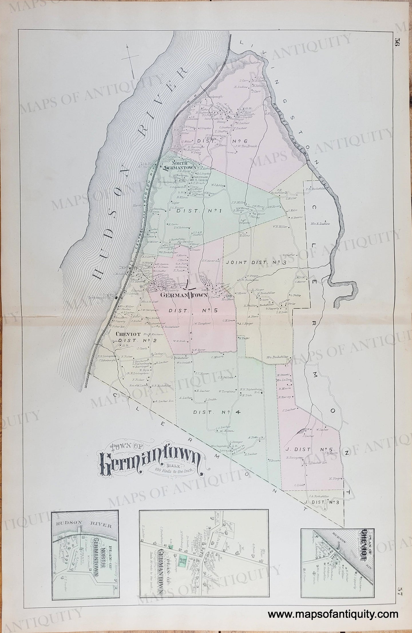 Antique hand-colored map of Germantown, New York, from the Atlas of Columbia County, New York, by Beers, Ellis & Co. 1888. Includes inset maps showing a plan of Cheviot, a plan of Germantown (a central portion of the town,) and a plan of North Germantown. Inset maps are oriented in a different direction on the page to the main map. Shows names of property owners at the time of publication, railroads, and some points of interest. Original hand-coloring by district, with labeled district numbers. Very good antique condition with mild toning overall, some very minor wrinkling of the paper, and areas of very minor spots/foxing. Center fold, as issued. Measures approx. 23" x 14.75" to the neatline.