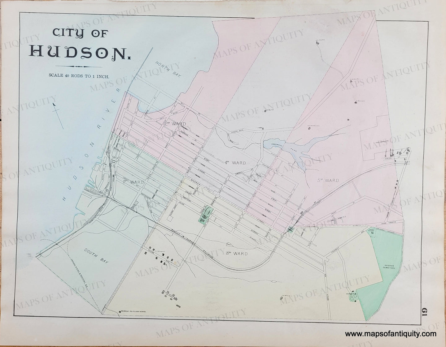 Antique hand-colored map of the city of Hudson, New York, from the Atlas of Columbia County, New York, by Beers, Ellis & Co. 1888. Shows names of property owners at the time of publication, railroads, and some points of interest (e.g. courthouse, armory, fairgrounds, Hudson Cemetery, Hudson Academy, Pearsons Fertilizer Works, House of Refuge for Women, etc.) Original hand-coloring by ward, with labeled ward numbers. Very good antique condition with mild toning overall, some very minor wrinkling of the paper, and areas of some soiling/staining. Measures approx. 11.25" x 15" to the neatline, with the map extending slightly beyond the neatline at the upper right.
