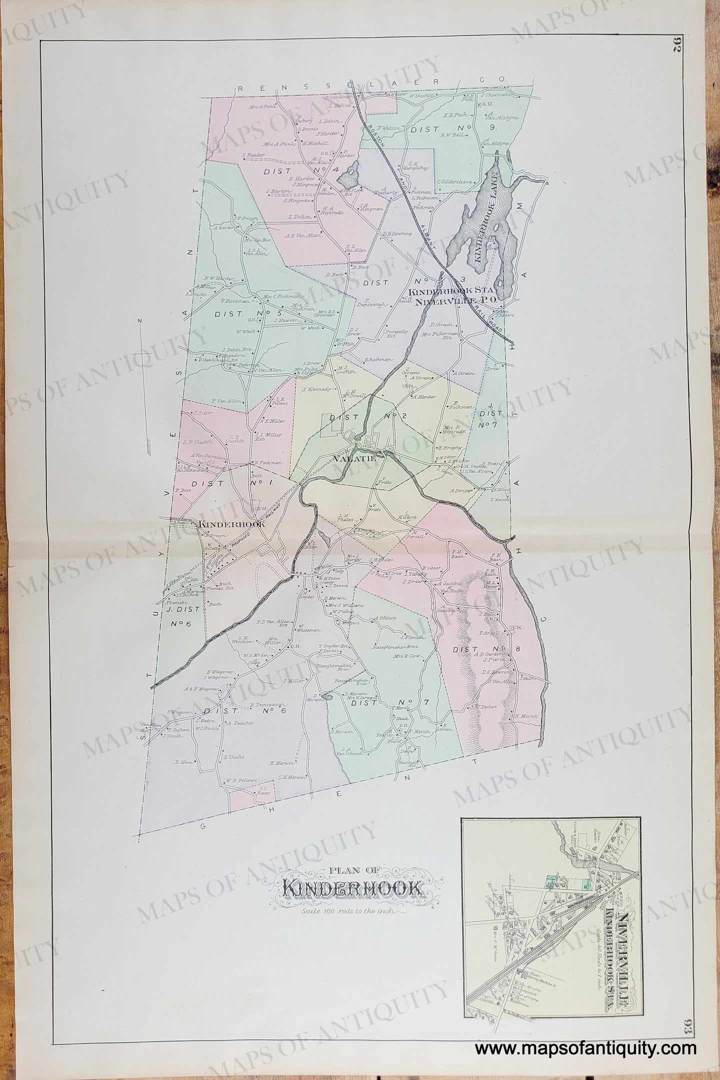 Antique hand-colored map of Kinderhook, New York, from the Atlas of Columbia County, New York, by Beers, Ellis & Co. 1888. Includes an inset map of the hamlet of Niverville, also titled Kinderhook Station. Inset map is oriented in a different direction on the page to the main map. Shows names of property owners at the time of publication, railroads, an at the time proposed railway, topography, and some points of interest. Original hand-coloring by district, with labeled district numbers. Very good antique condition with mild toning overall, some very minor wrinkling of the paper, a few spots of very minor foxing, and a very small tear at the bottom edge. Center fold, as issued. Measures approx. 23.25" x 15" to the neatline.