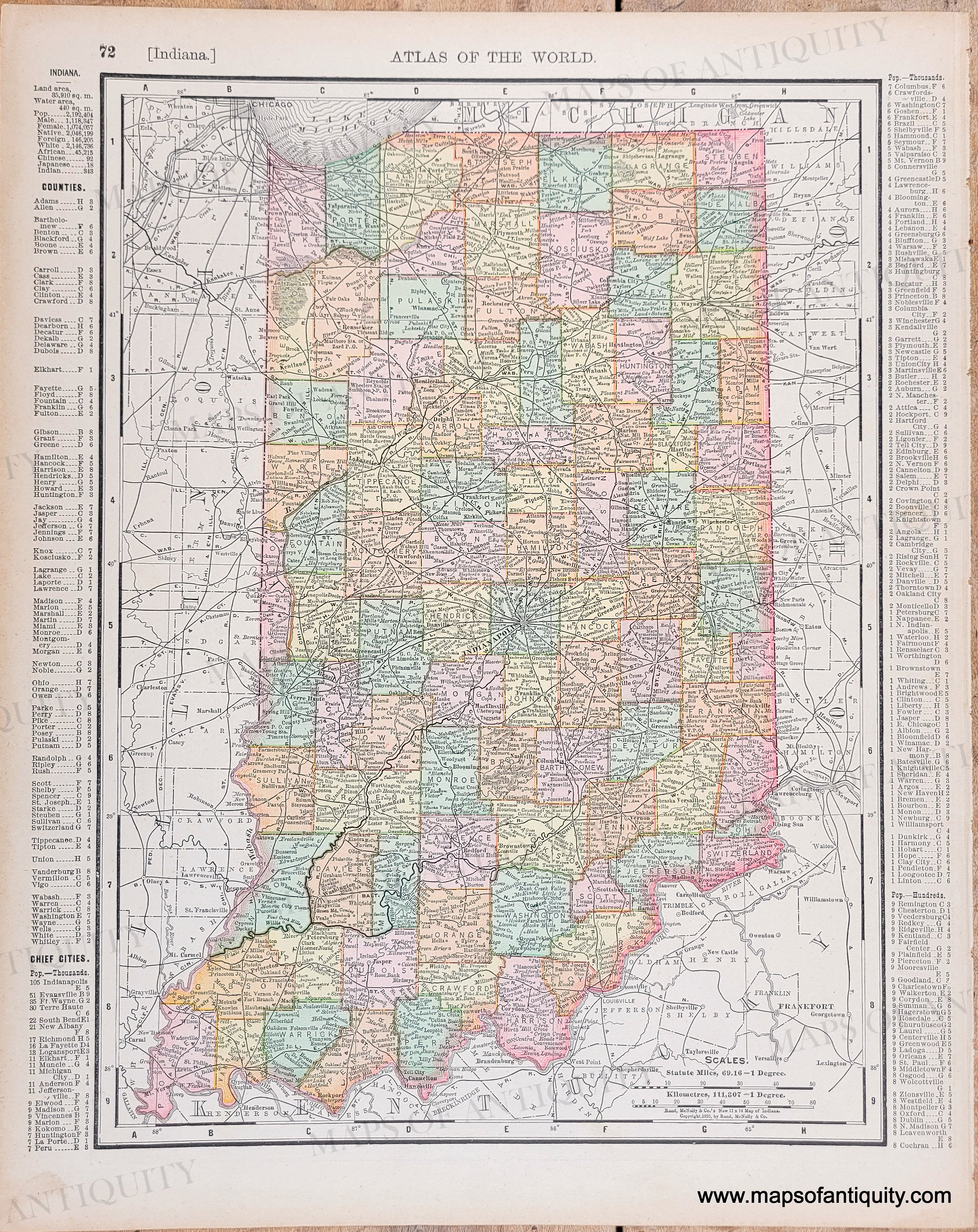 Antique printed color map of Cleveland, Ohio (Recto.) Cleveland map includes names of major streets, parks, cemeteries, etc. Inset map of the greater Cleveland area. Text in margins is a key to the points of interest and streets. On Verso: Map of Indiana. Indiana map is colored by county and shows cities, towns, railroads, etc. Text in margins is a key to the counties, cities, and populations. Very good antique condition with minor toning throughout, which is darker along the outer edges of the paper, and a crease at one corner of the page. By Rand McNally, 1895. Recto map (Cleveland, OH) measures approximately 9.25" x 12.5" (H x W) to the neatline. Verso map (Indiana) measures approx. 12.25" x 9" to the neatline.