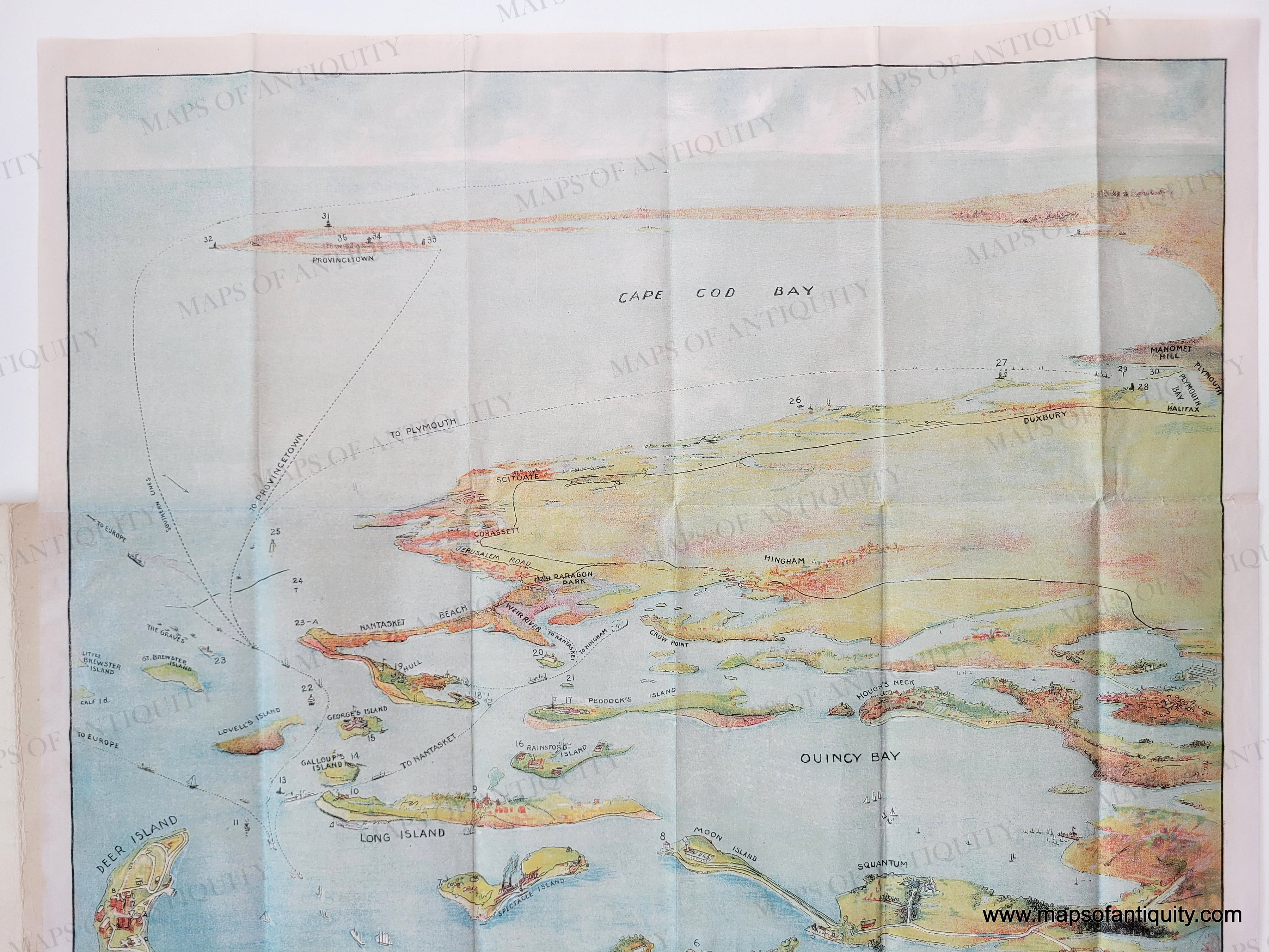 Antique map showing bird's eye view of Boston Harbor, looking east over Quincy Bay and Cape Cod Bay, with Provincetown in the distance. This was published as a tourist map in 1905 by Federal Engraving and Publishing Co./Murphy. Includes small illustrations of points of interest, ships, etc., and numbered identifications of points of interest. Vibrant original chromolithograph printed-color. Good overall antique condition. Folds as issued, with wear along the folds and some wrinkles at the fold intersections. Measures approximately 17.5 x 21 inches.