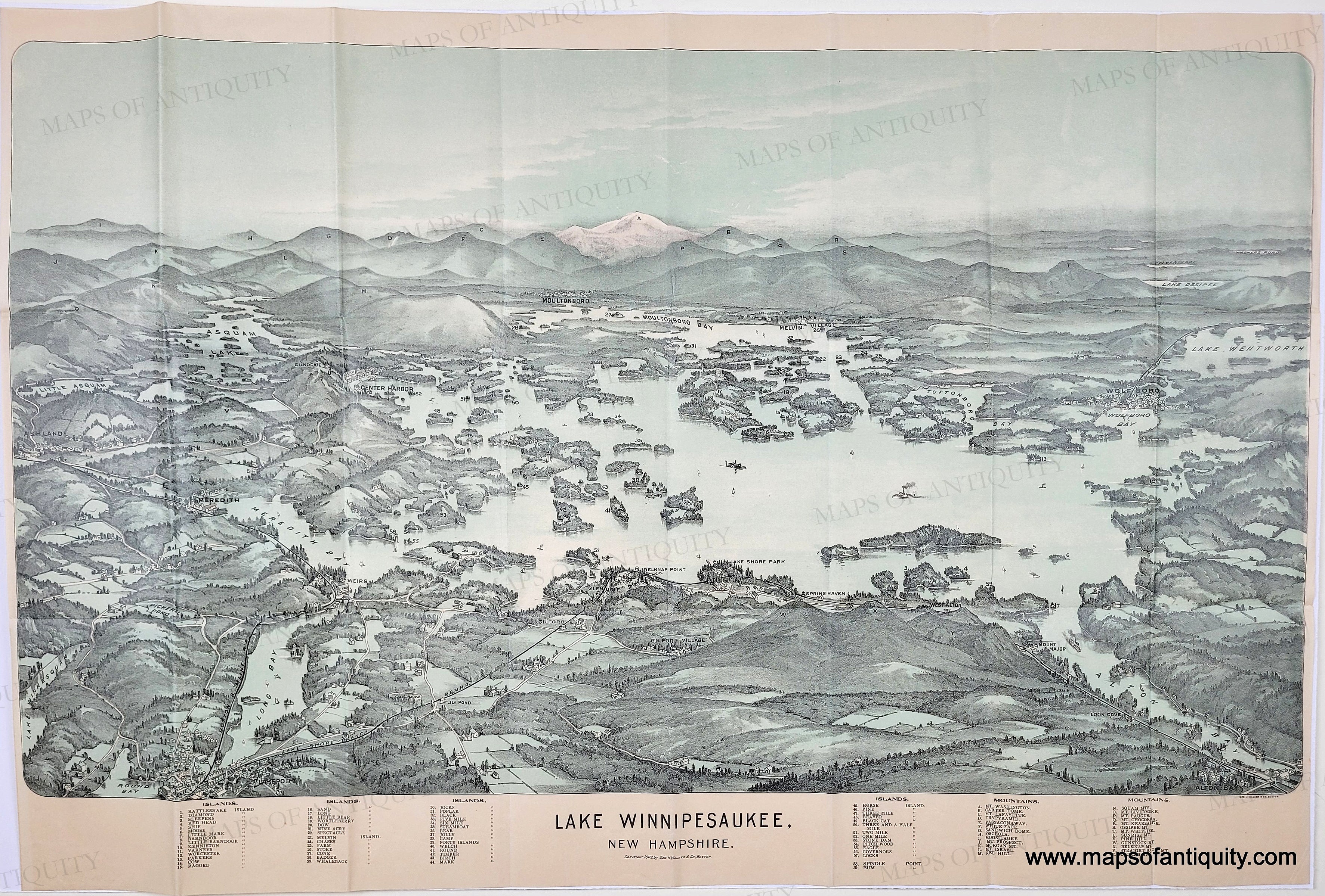 Antique view map of Lake Winnipesaukee, New Hampshire. Genuine-Antique-Bird's-Eye-View-Map-Lake-Winnipesaukee-Mount-Washington-New-Hampshire-NH-United-States-Northeast-1909-Walker-Maps-Of-Antiquity