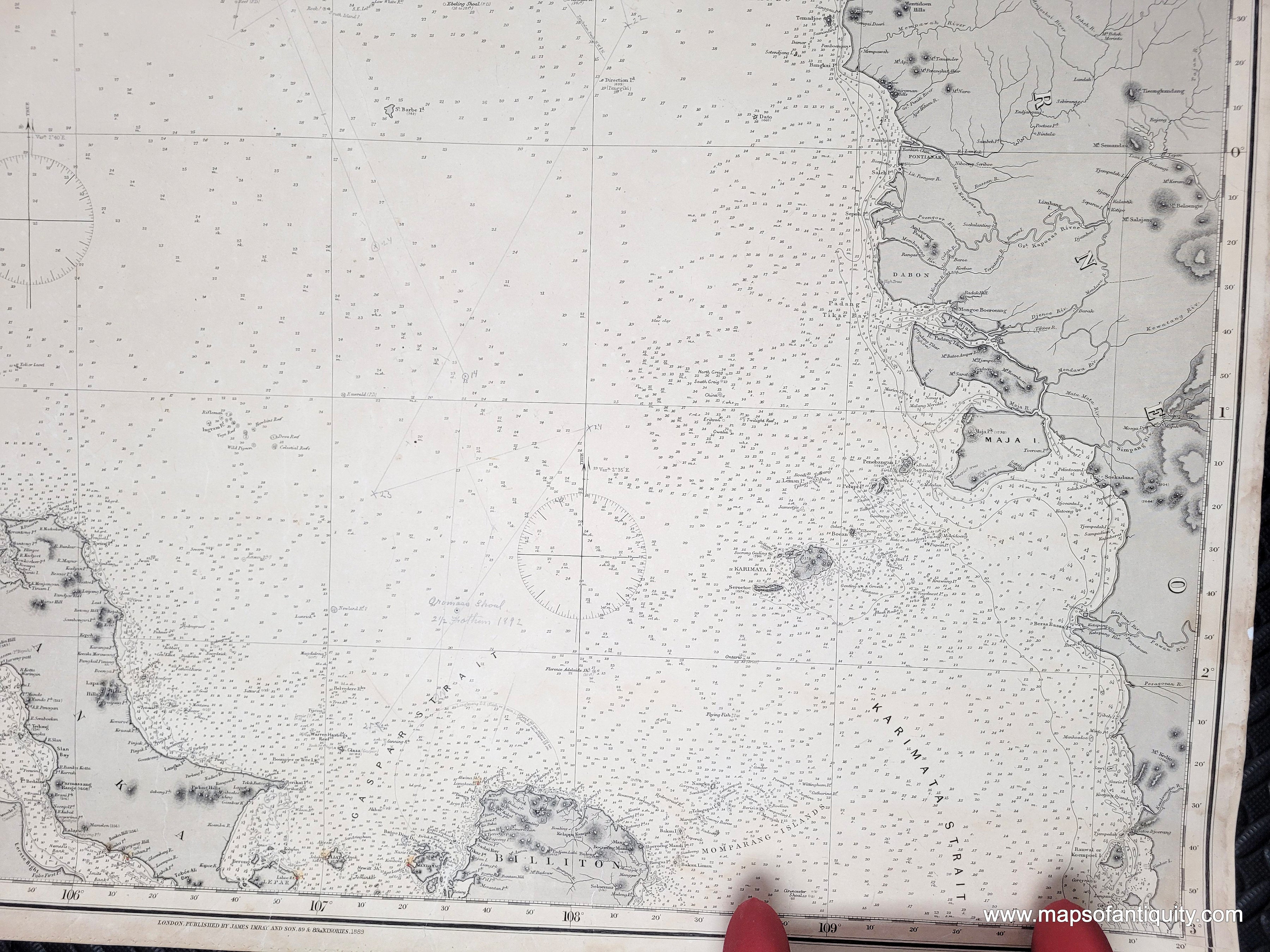 Antique black and white nautical chart published by James Imray & Son in 1889 and corrected to 1890. This chart is part of a series of charts used to navigate the western route to China as part of the China Trade. It shows the area between Malaysia and Borneo, with Singapore, part of Sumatra, and the Riau Archipelago Islands with detailed bathymetric data. A previous owner who used the chart has plotted some courses in pencil. Very good condition, with mild toning, slight stains and signs of age. Tightly rolled. This chart appears to have been professionally restored. Measures approximately 48" x 40" to the neat lines. Blue back chart. It will frame beautifully but may require some flattening.