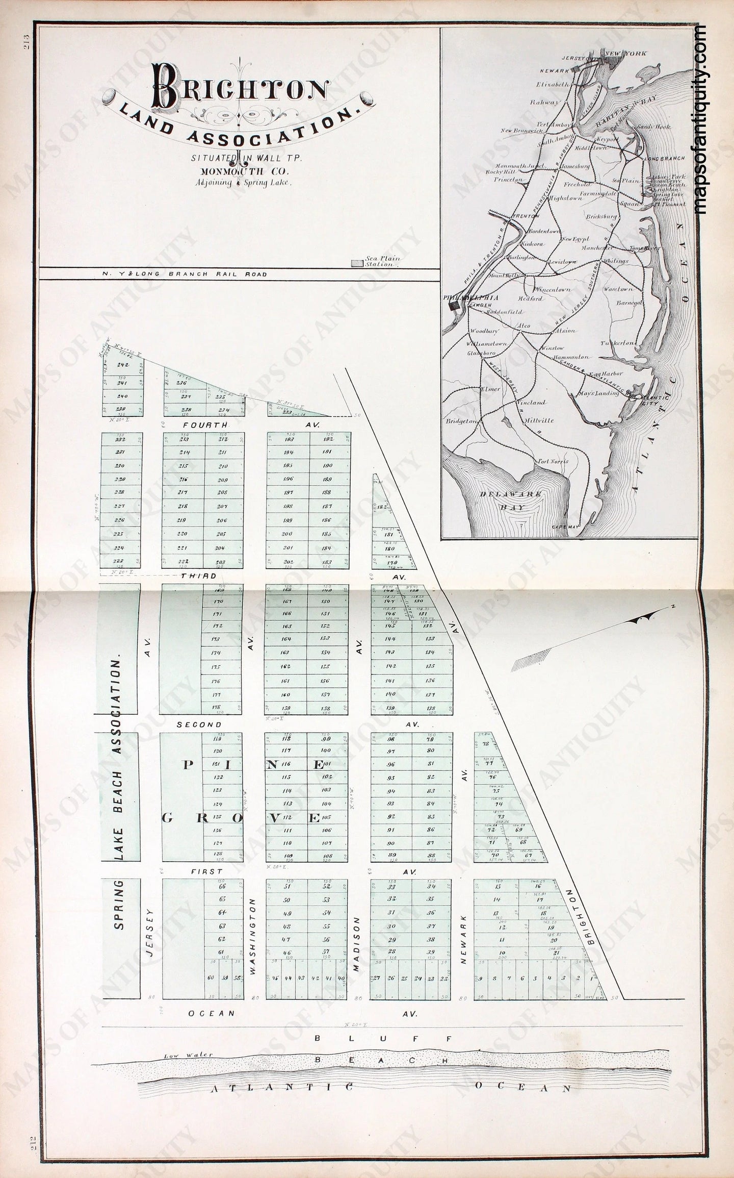 New Jersey Coast Atlas hand colored Land Association map, situated in Wall TP, Monmouth County, showing new subdivision of properties of Spring Lake just north of the Spring Lake Bath & Tennis Club and including the location of the modern hotel The Breakers on the Ocean, with adjoining edge of Spring Lake Beach Association and inset map of New Jersey. Spring Lake was established in the 1890s, so this map predates the creation of the town. Measures approximately 12" x 21", very good condition with one smudge spot on lower left side.