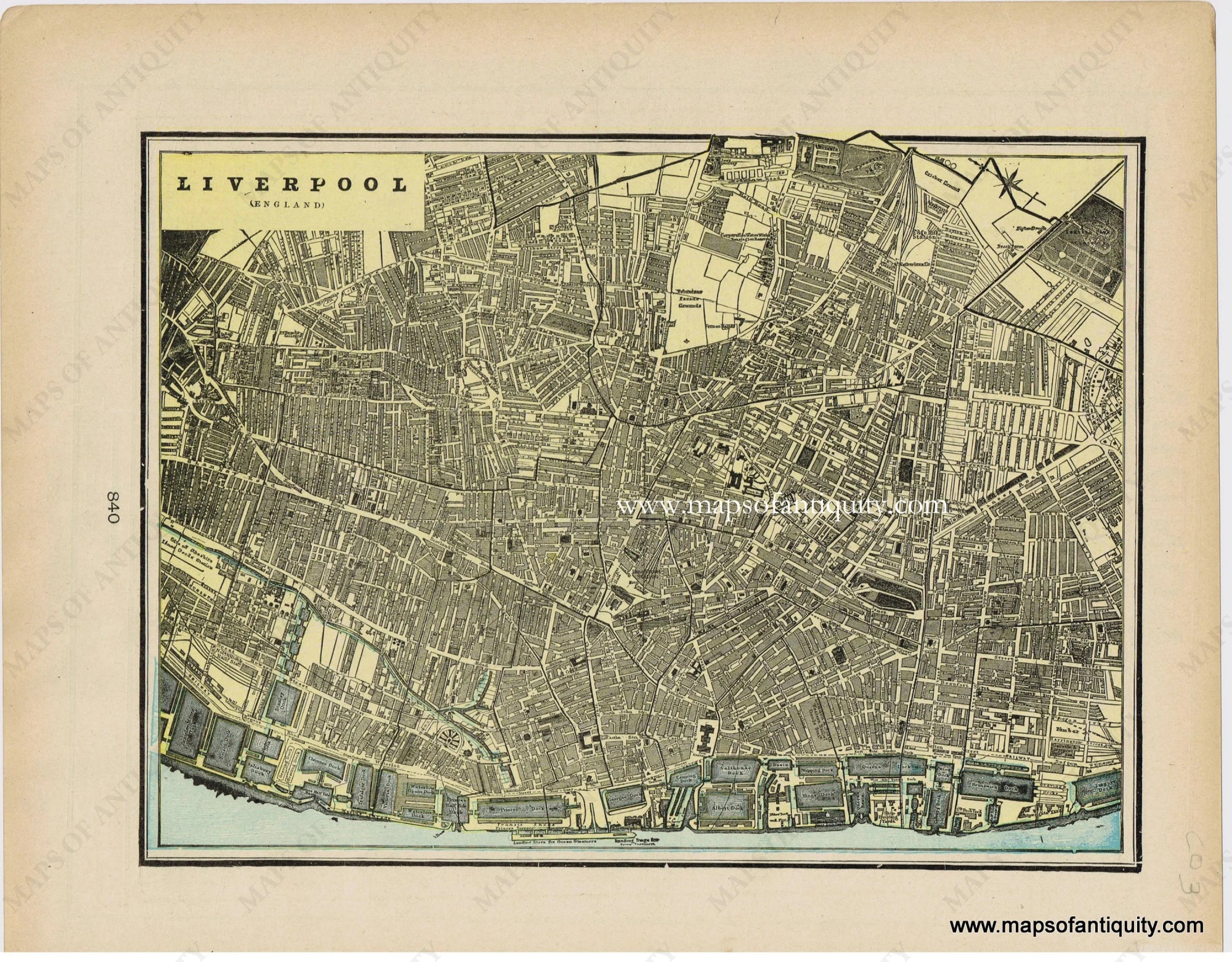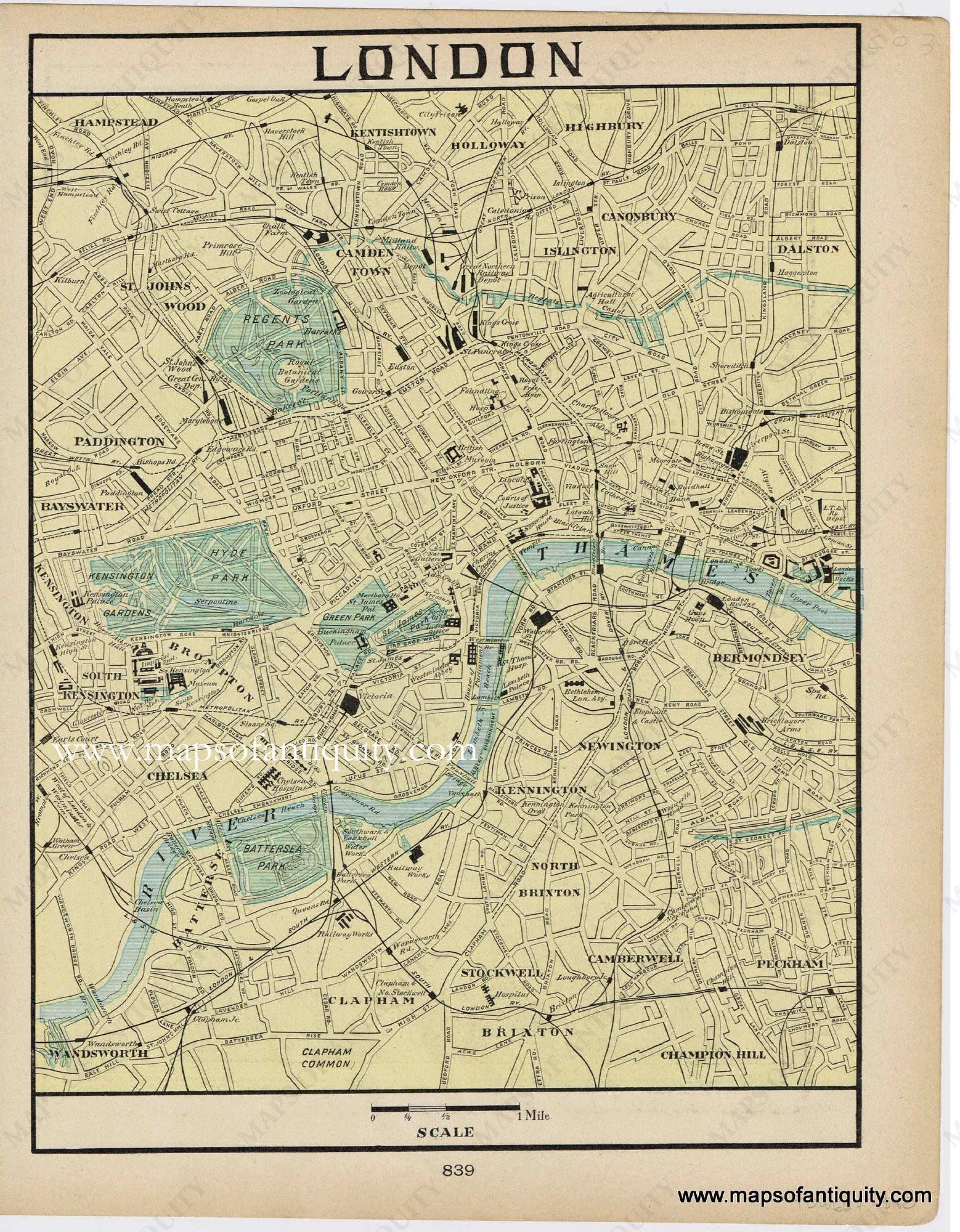 Antique printed color map published in Cram's 1903 atlas. A unique antique map of London, England, that shows roads, railroads, parks, notable buildings and institutions. Slight art deco style. On back is a map of Liverpool. Good to very good antique condition with mild toning . The printed color is slightly offset. Measures approx. 13.5 x 10 inches to the neatline.