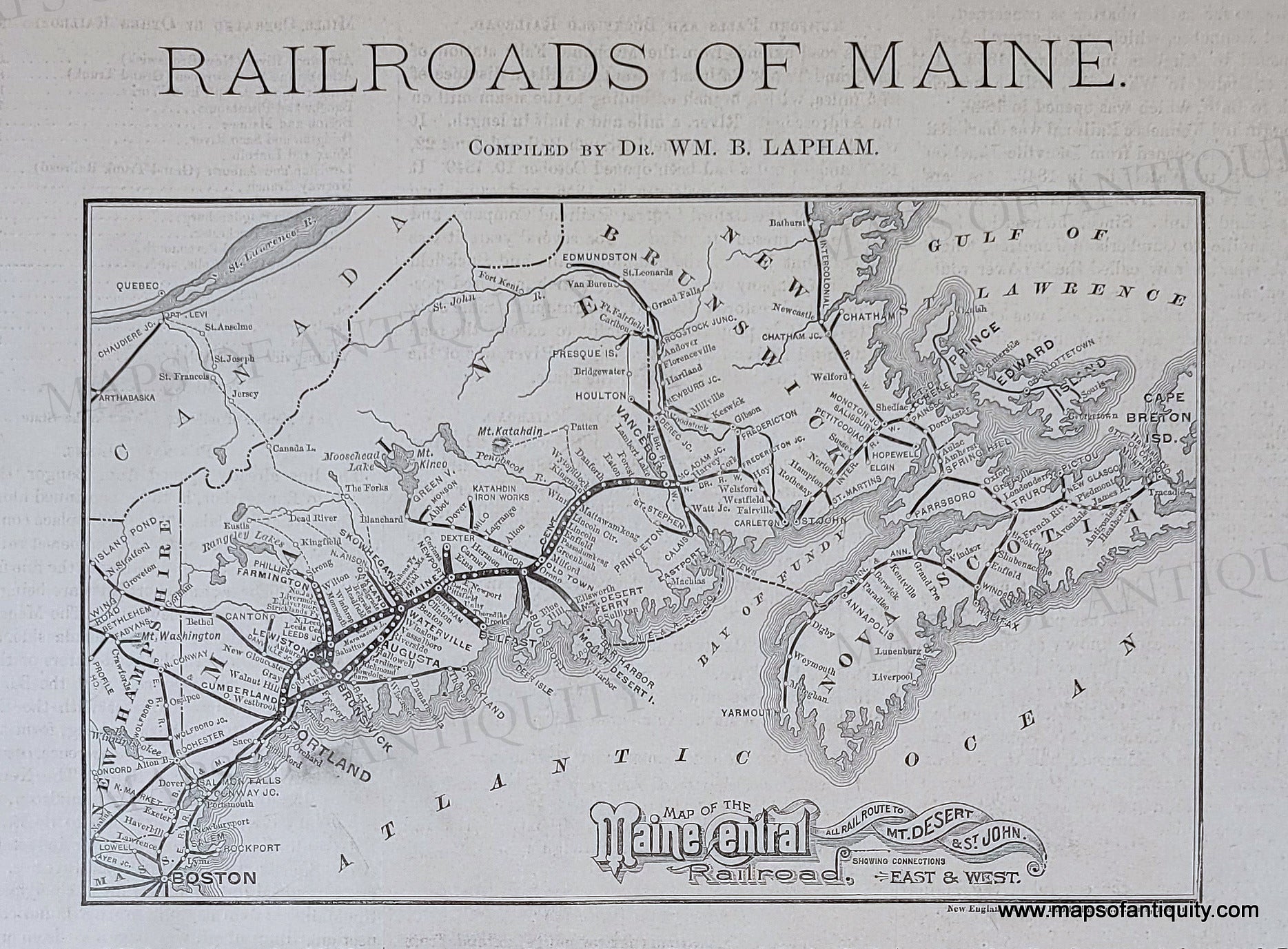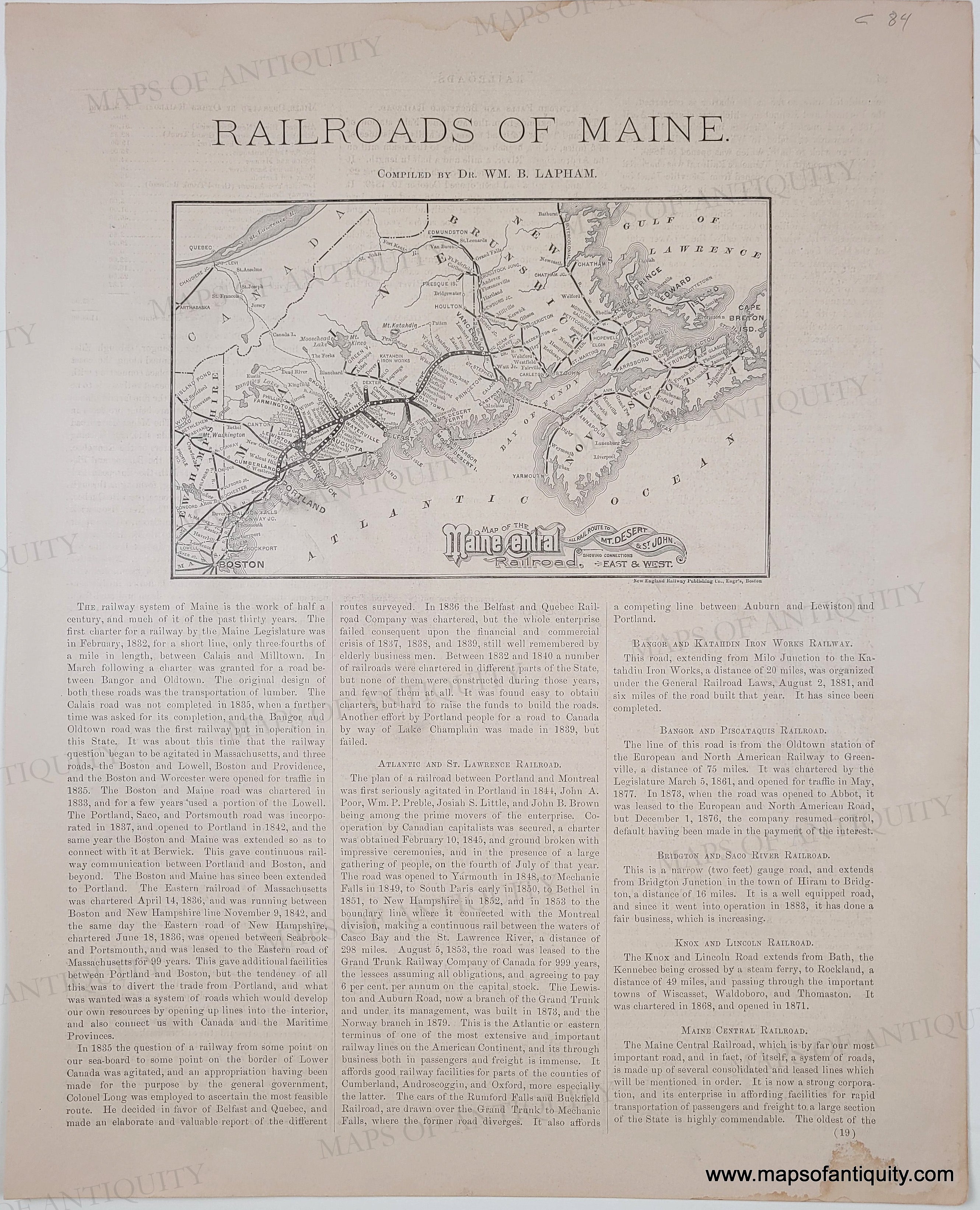 Black and white antique map of the Maine Central Railroad, with connections east and west, including Mt. Desert and St. John, Nova Scotia, on a larger page from the Colby Atlas of Maine, 1884, with narrative history of Maine's railroad history. Very good condition, map area measures 5.25 x 8.5 inches, full page is 17 x 14 inches, text on both sides.