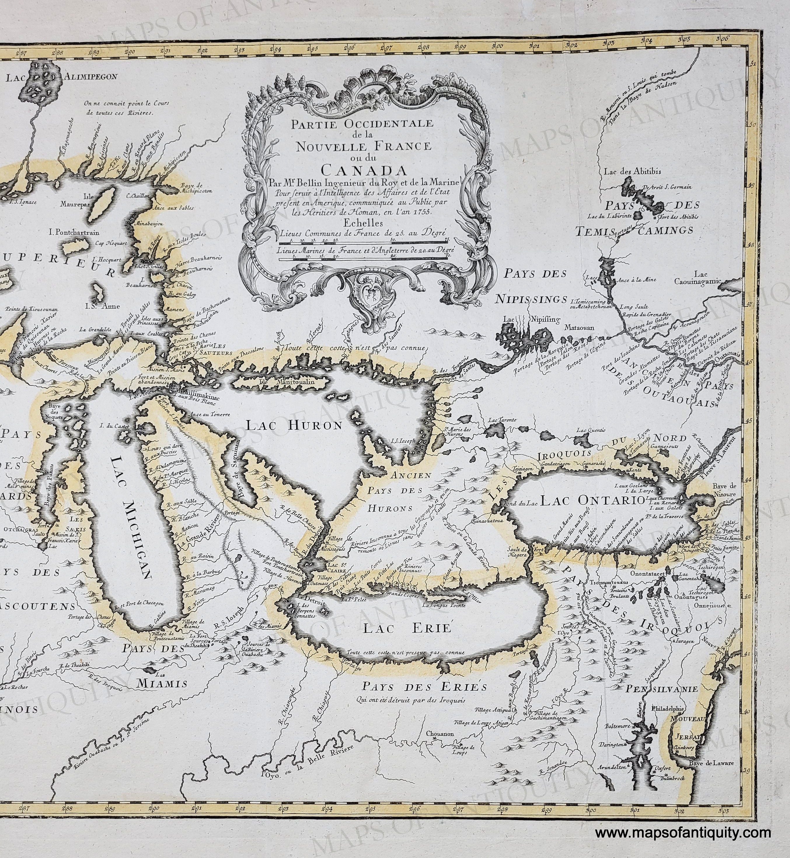 Antique map of North America with the Great Lakes, labeled territories and bodies of water. Genuine-Antique-Map-Great-Lakes-Partie-Occidentale-de-la-Nouvelle-France-ou-du-Canada-1755-Bellin-Homann-Heirs-Maps-Of-Antiquity
