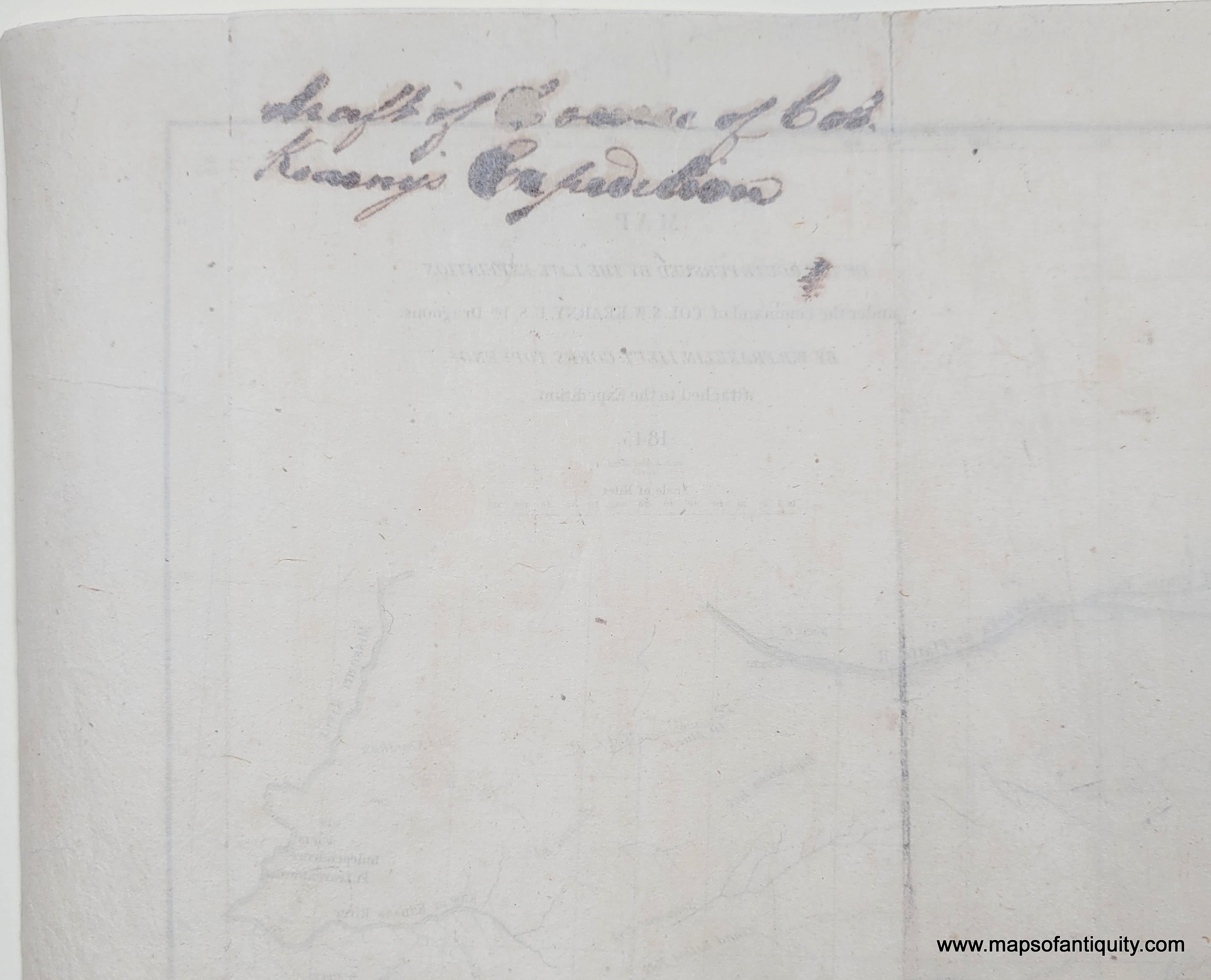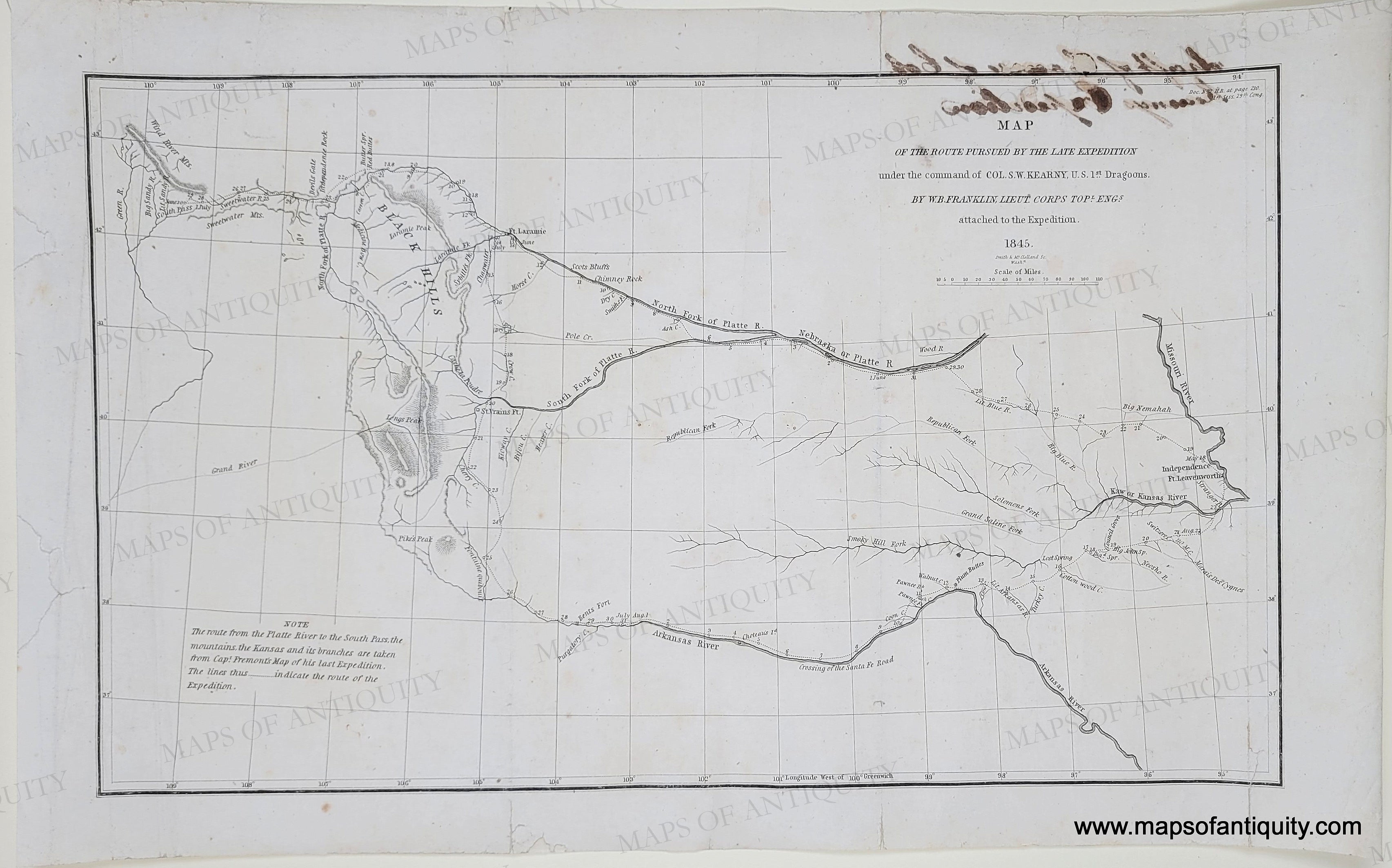Antique map of part of the United States between the Missouri River and the Green River, with the Black Hills and Pike's Peak. This is an early and historical map of the region, and part of this map is based on Fremont's map of 1843. It covers the area between the Arkansas and Platte Rivers, and extends westward to South Pass and the Green River. The dragoons departed Ft. Leavenworth and marched to South Pass via the Oregon Trail and returned 99 days later via the Arkansas River route, a distance of 2,200 miles over the tough western terrain. The route is shown on the map with the dates of their journey, from May 18th to August 24th. Engraved by the firm of Smith & McClelland. The path goes through Kansas, Nebraska, Wyoming, and Colorado. This map is in fair to good condition and has been professionally restored. A previous owner wrote on the back of the map in pen and it has bled through at the top. The ink also ate through the paper leaving some small holes that have been closed. Measures approx. 8 x 13 inches to the neatline.