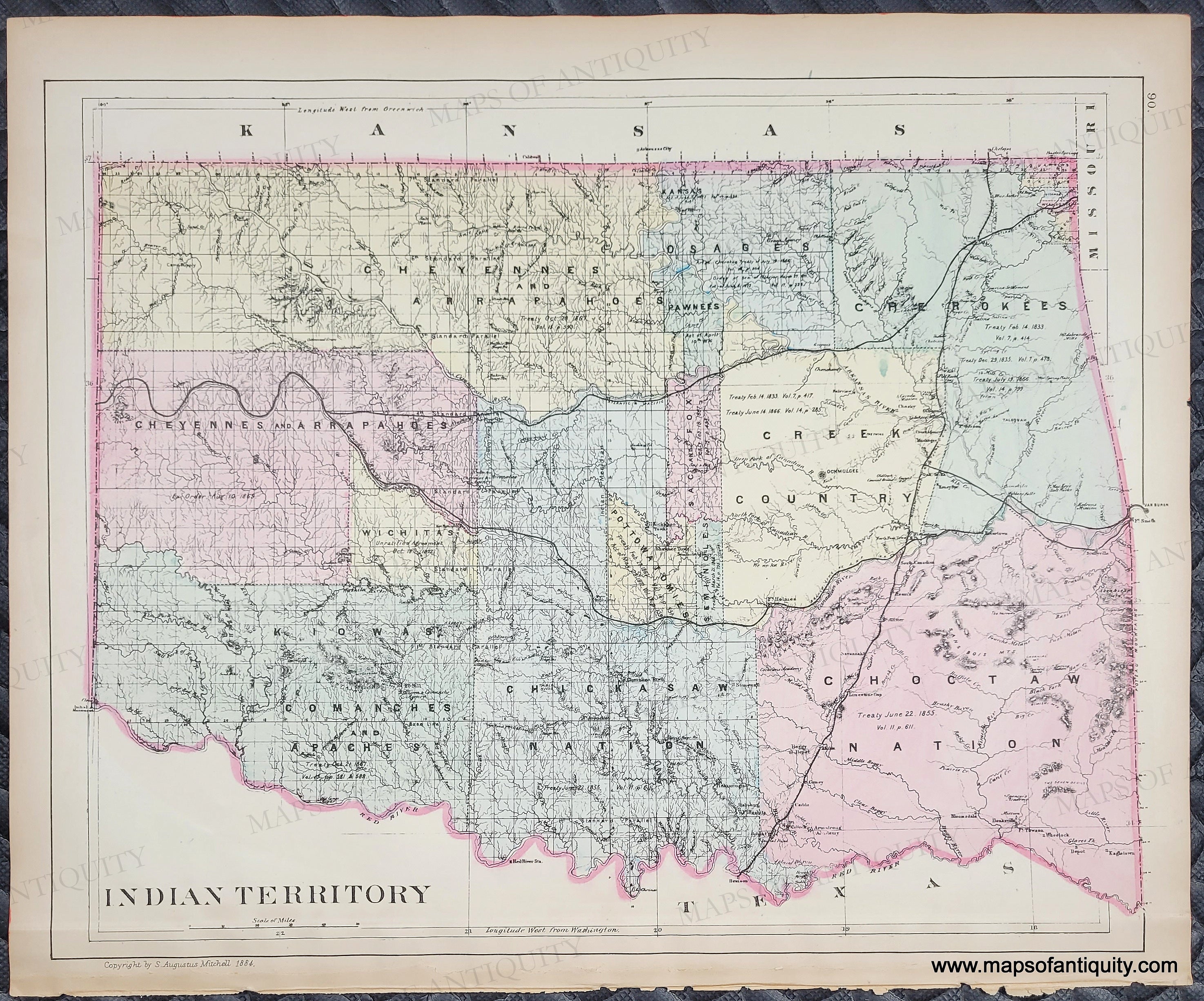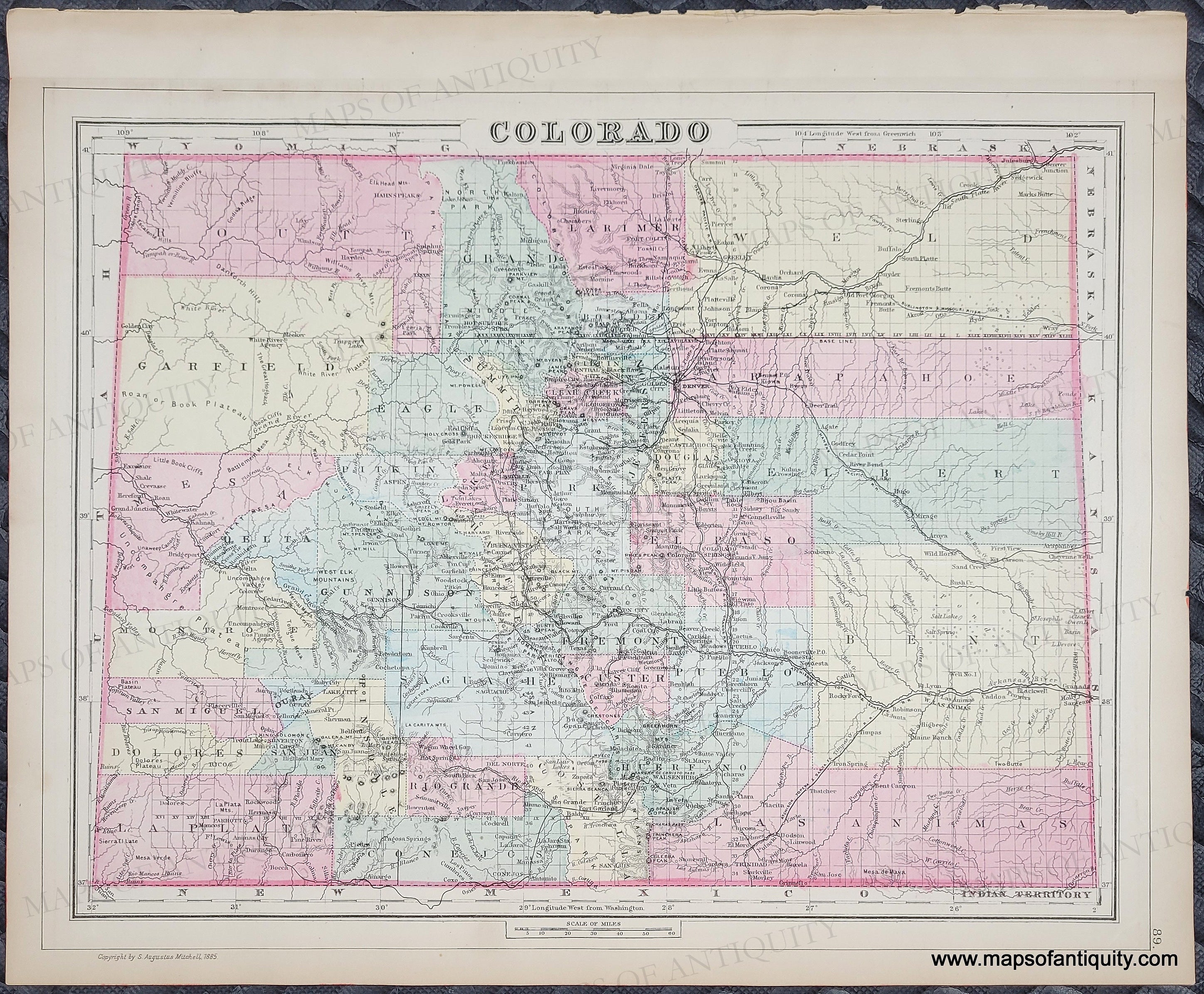 Antique hand-colored maps from Mitchell's 1885 New General Atlas. On one side of this page is a map of Colorado, on the other side is a map of Oklahoma. Shows railways, political boundaries, cities, water bodies, as well as land features. Includes towns with names. Colored by county with some early county lines. Indian Territory map outlines the territories of each tribe in Oklahoma. This map is in very good antique condition with minor overall toning. Some wear at the paper edges. Paper is a bit fragile. Page measures approximately 15 x 12 inches.