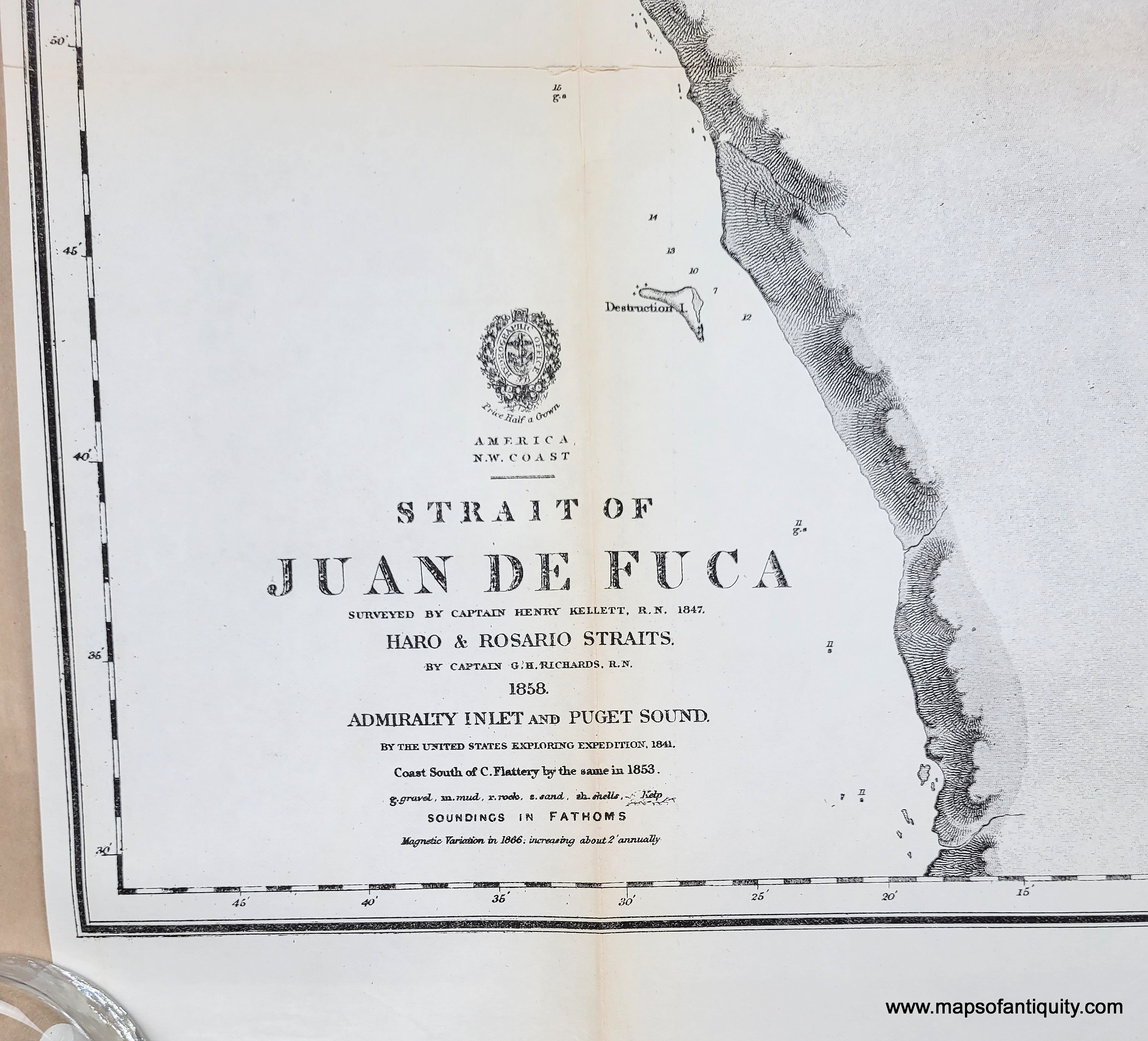 Antique chart of the Juan de Fuca Strait and Salish Sea in Washington, by the Hydrographic Office of the US Navy, c. 1866. Shows the area from Cape Classet or Flattery to Puget Sound and includes part of Vancouver Island near Victoria. A large inset is a continuation of Admiralty Inlet and Puget Sound. This map shows the area of Seattle around the time of its incorporation and long before the massive fill projects of the 1890s-1930s, which transformed the city. Seattle was incorporated as a town January 14, 1865. That charter was voided January 18, 1867, in response to questionable activities of the town's elected leaders. Seattle was re-incorporated December 2, 1869. What is labeled on the map as Duwamish Bay was largely filled in and built upon, and what was not filled in is now known as Elliot Bay. With soundings, topography, and many named bays, harbors, and points. One recognition profile at top shows Cape Flattery. Good to very good antique condition with toning that is darker along the folds and some separation at the fold intersections. Early electrotype print. Measures approx. 33.75" W x 22.25" H to the neatline. This chart could be colored by our professional colorist for an additional cost. Note: any "rainbows" or strange patterns in the image are called moire pattern- caused by taking a digital photo or scan of the many parallel lines in the print- these are not in the print and we can try to take more photos if you are concerned.