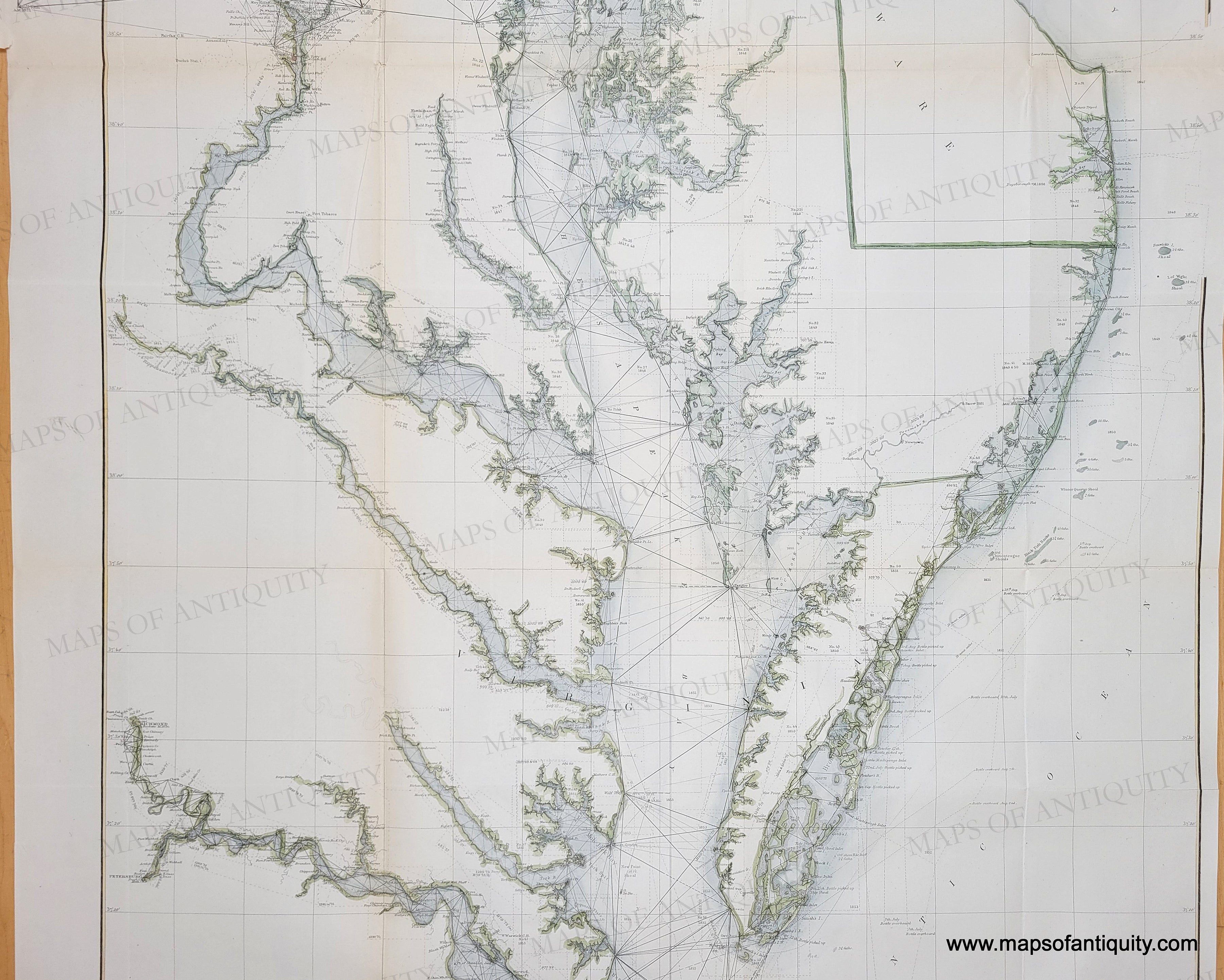 Antique Coast Survey report chart of the Chesapeake Bay, with Virginia, Delaware, part of Maryland, and Delaware Bay. Published in the Annual Report of the US Coast Survey in 1879. Triangulation lines throughout. Triangulation is the process of determining the location of a point by measuring only angles to it from known points at either end of a fixed baseline. Hand-colored by our professional colorist. Very good overall antique condition, some toning along folds. Measures approx. 34 x 23 inches to the neatline.