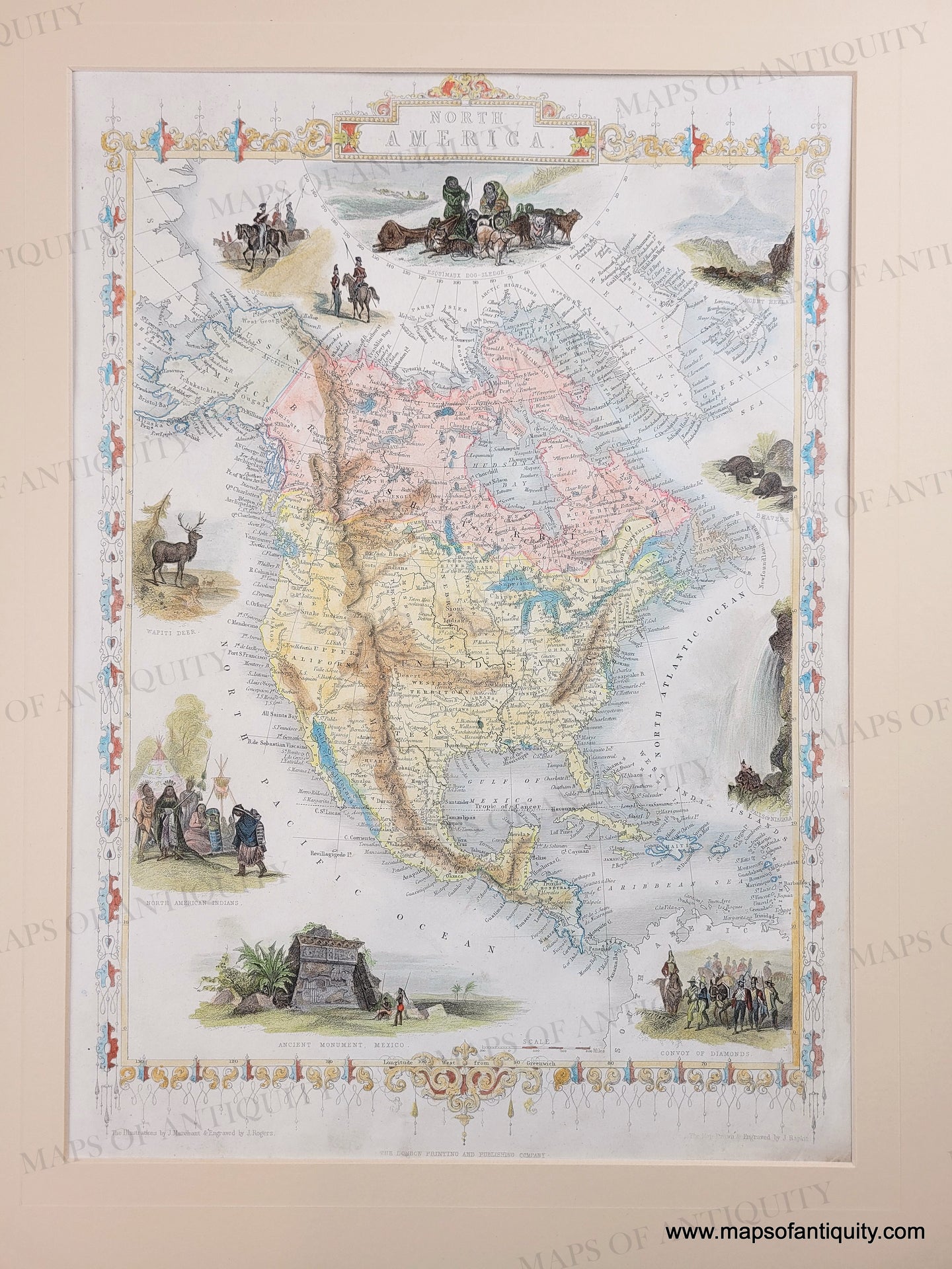 Antique map of North America from 1851. This map was originally colored with just outline color, some of which is still visible, but most of the color was added later . Surrounded by the vignettes characteristic of Tallis, Ancient Monument, Mexico, North American Indians, Wapiti Deer, Cossacks, Esquimaux Dog-Sledge, Mount Hekla, Beavers, Falls of Niagara, Convoy of Diamonds, with ornate decorative border. Very good condition, with some minor signs of age in the margins including mild stains and a crease in the lower right corner. Measures approx. 14 x 9.5 inches. Matted.