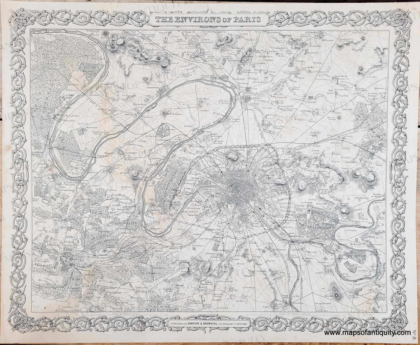 Extraordinarily detailed map of Paris, France and environs, shows landforms, water bodies, vegetation and wooded areas, roads and routes, villages and towns, fortifications, Versailles and other regional points of interest. This map was published in the only atlas that represents the collaboration of the two well-known firms of Johnson & Browning and Colton. From Colton's Atlas of America Illustrating the Physical and Political Geography of North and South America and the West India Islands by George W. Colton, 1859. The atlas title page indicates the atlas was published by J.H. Colton and Company, but each map in the atlas says it was published by Johnson & Browning (the addresses for both Colton/Johnson & Browning are the same). The Colton firm refused to compromise quality, choosing to compete for sales in the finer quality international market rather than the inexpensive domestic one. Because of this, all maps were engraved by steel plates rather than by wax engraving which became the most common method used in the US. Good condition with some mild stains/soiling overall, some small tears at the paper edges into the decorative border, tight margin. Measures approx. 12.75 x 15.75 inches to the outer edge of the distinctive Colton border.