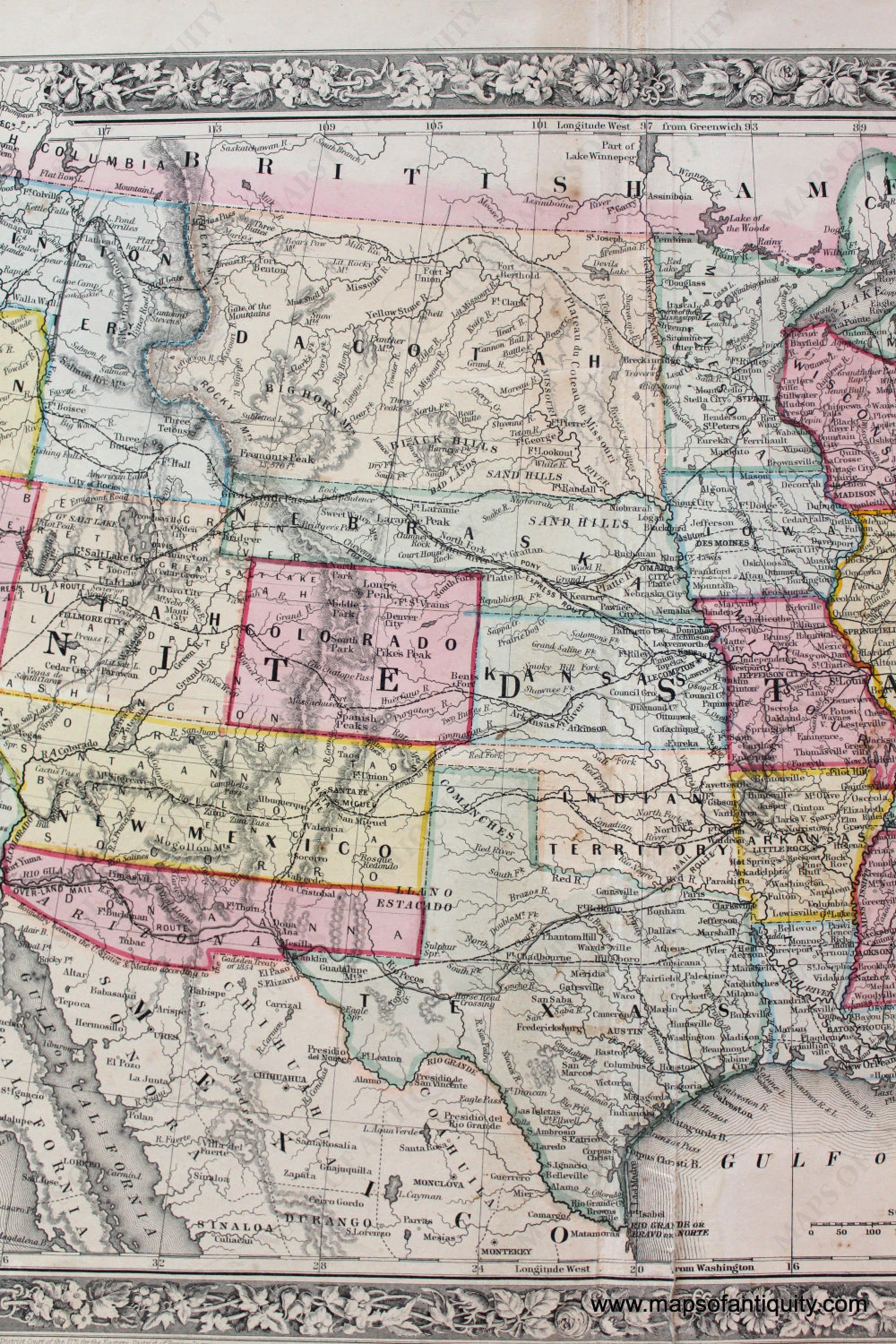 Antique hand colored map of the United States, with states and territories delineated by color, and with insets of Pensacola Bay and Hampton Roads and Norfolk Harbor. This map was published in 1862, during the Civil War. With detail of cities and towns, water bodies, and roads. Shows routes of Pony Express, and mail route to the west. Of particular interest: The government had been dividing the west into territories but halted doing so when it became clear that there was a divide between north and south- they did not want to create more states that would choose the Confederacy- so Dacotah is a large territory that encompasses modern Montana, Wyoming, both Dakotas, and Idaho. Washington territory has much of modern Idaho, Nevada is smaller, Utah is larger, and New Mexico and Arizona are shown as horizontal, which they never were except according to the settlers in the early 1860s- when the US government separated Arizona from New Mexico in 1863 they were divided vertically. Good to very good condition with slight seam separation at top and bottom center fold (archivally repaired), and some other minor signs of age including a small tear at bottom and some small spots in the margin. Measures approx. 13.25 x 21.5 inches.