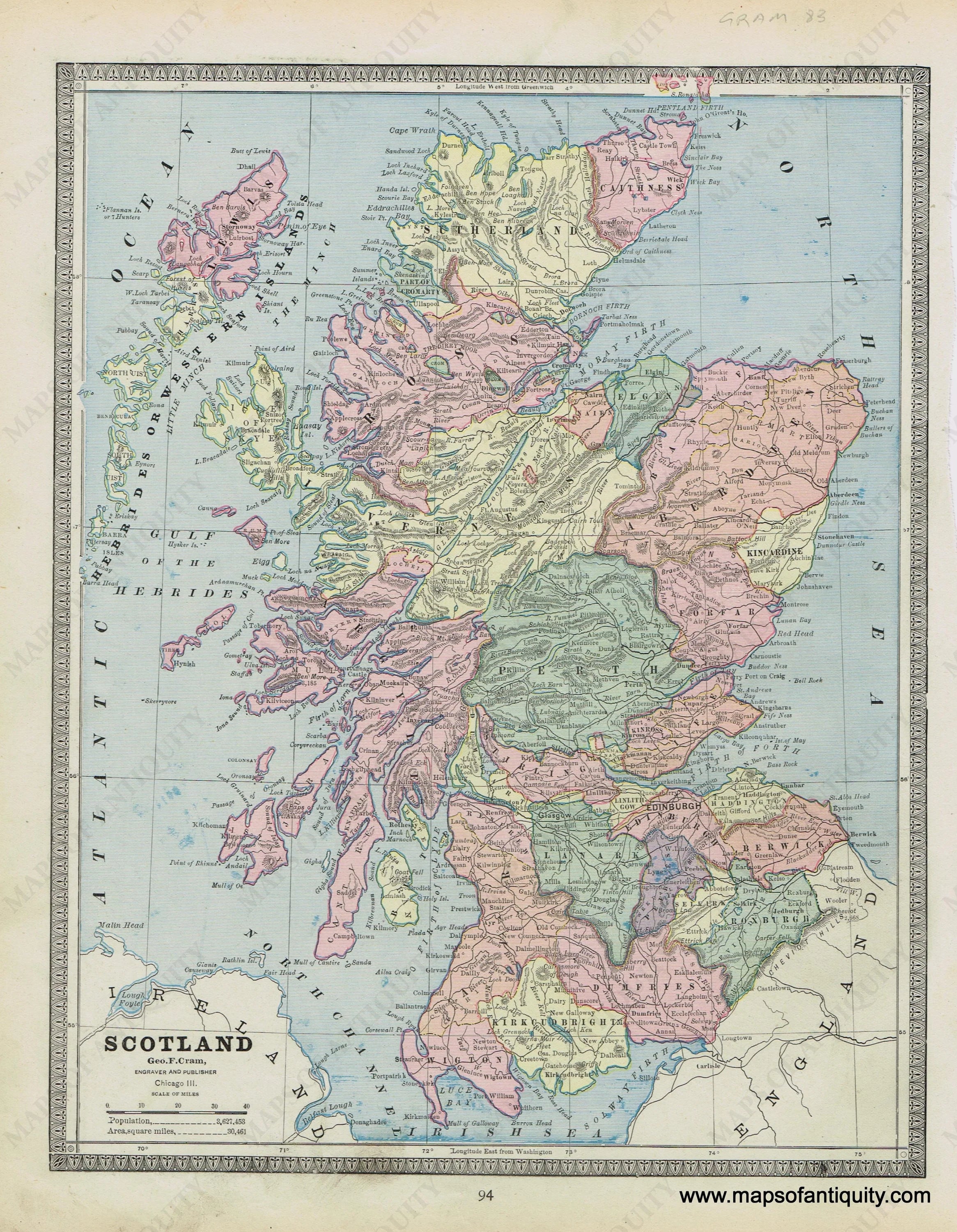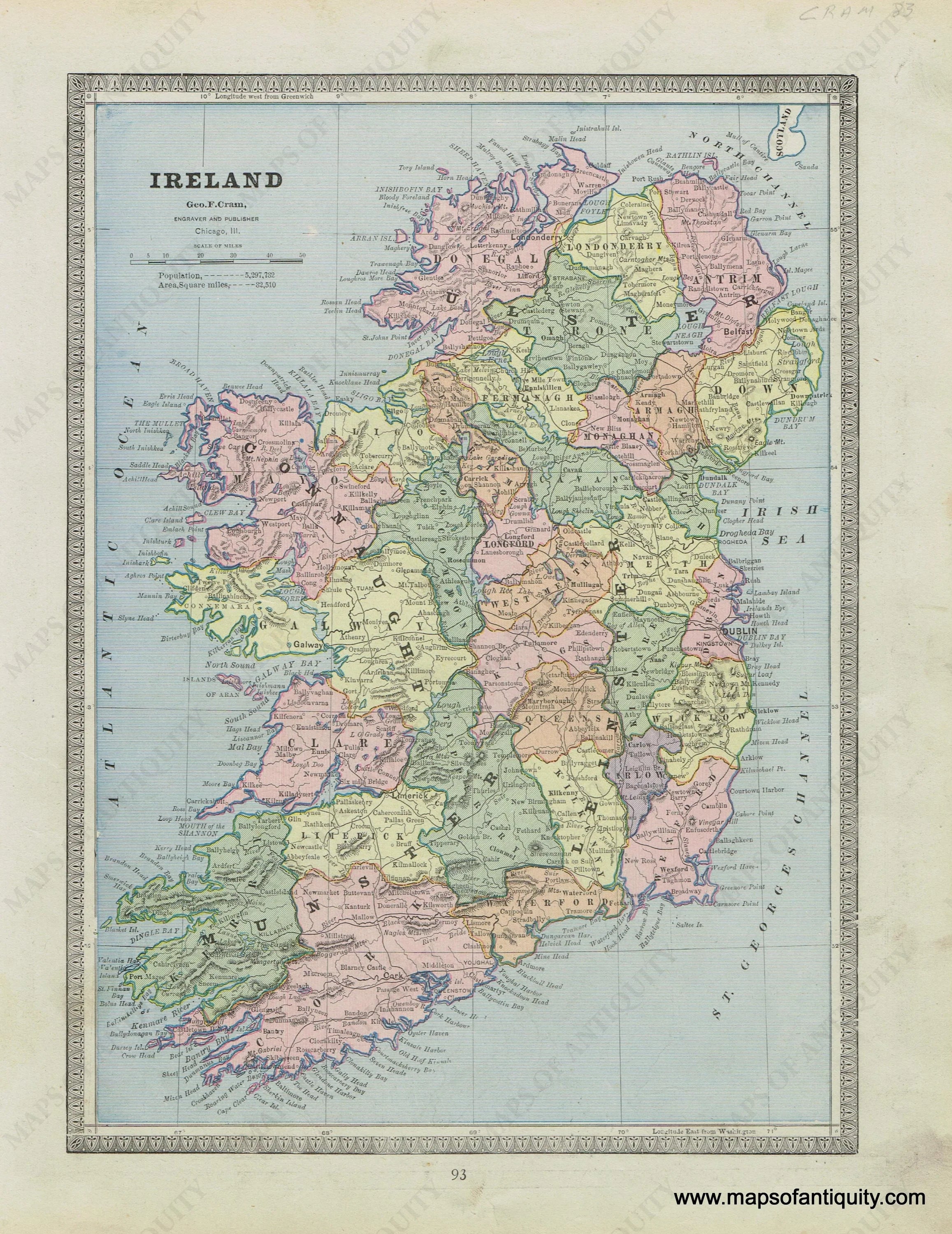 Antique printed color map of Ireland with a map of Scotland on reverse. Both maps include area and population. Good to very good condition with some stains mostly at the edges of the page. By Cram, in Cram's Unrivaled Family Atlas of the World, 1883. Ireland map measures approximately 13.5" x 10.5" to the neatline. Scotland map measures approx. 13.5" x 10.5" to the neatline.