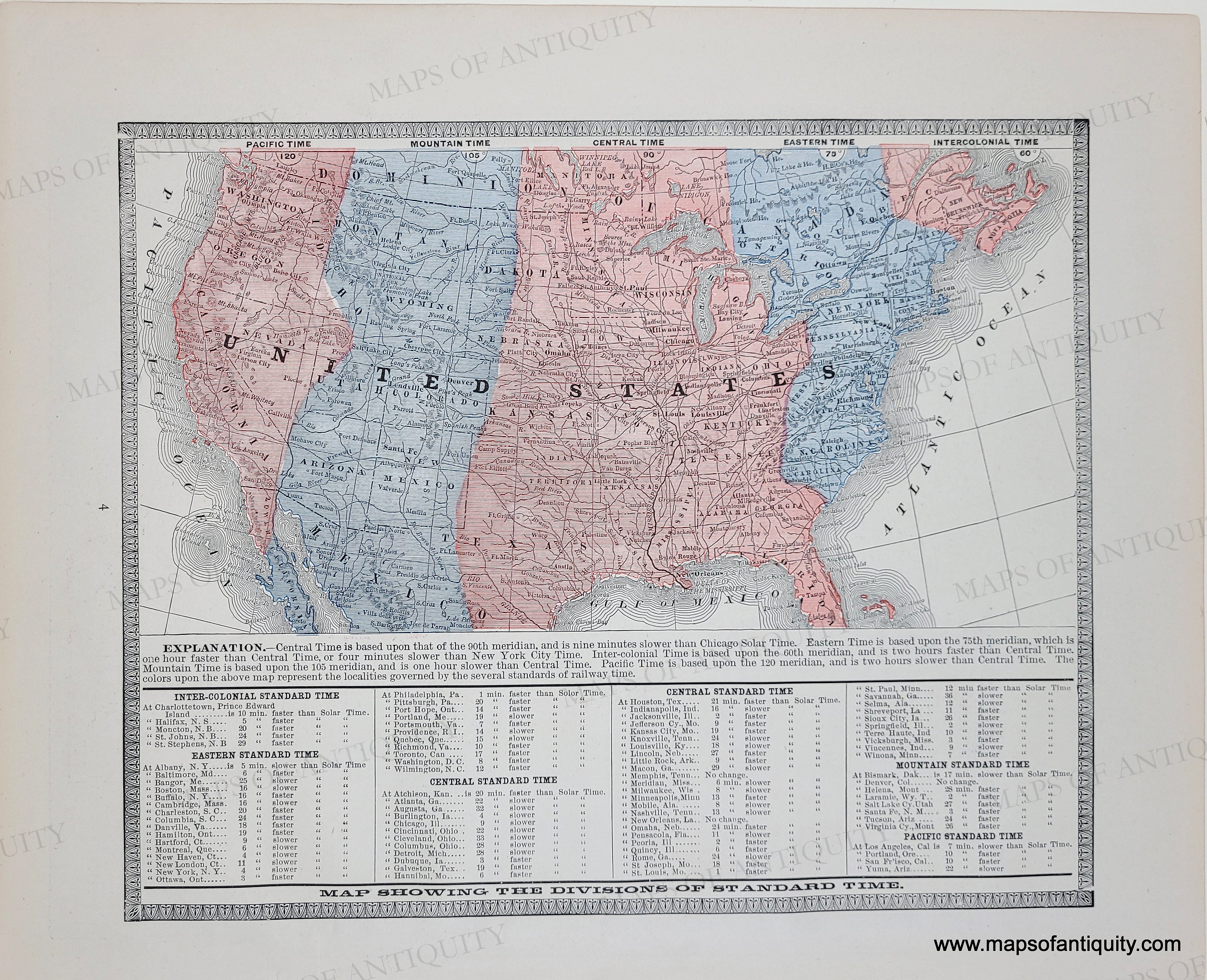 Antique printed color comparative illustration of the heights of buildings "of the Old World." Includes a key at the bottom of the map to identify each building. Printed color of each building represents its building materials (e.g. Red indicates Brick, Yellow indicates gold, etc.). At this time, the Cologne Cathedral was the tallest man-made structure in the world. Back side has map of the time zones, which were brand new in 1883 and created by the railroad companies (It wasn't until 1918 that Congress made it official). Very good antique condition with very mild toning of the paper, and a few spots of minor foxing outside the border. Published by Cram, c. 1883. Measures approximately 9.5" x 12.5" to the neatline.