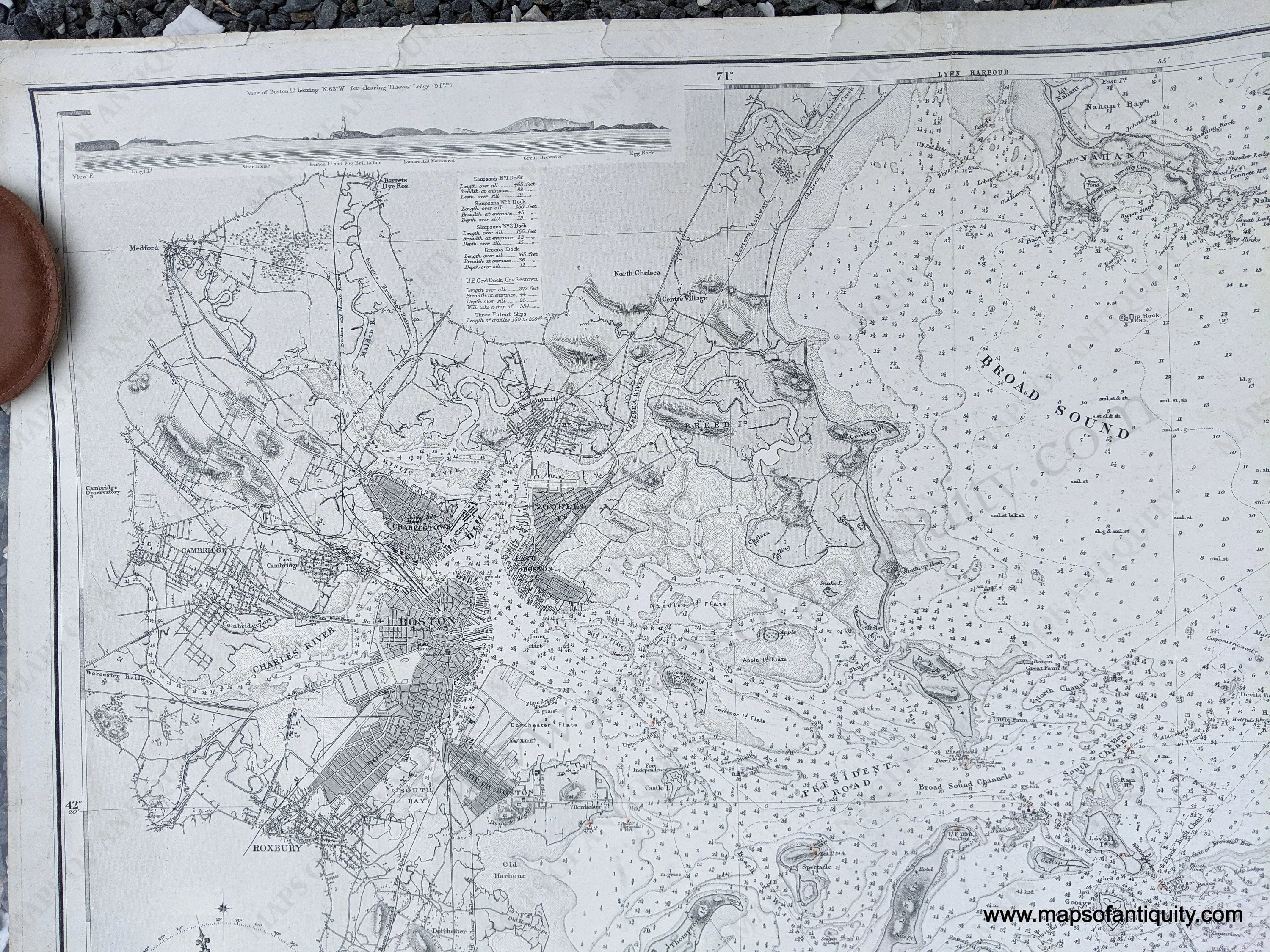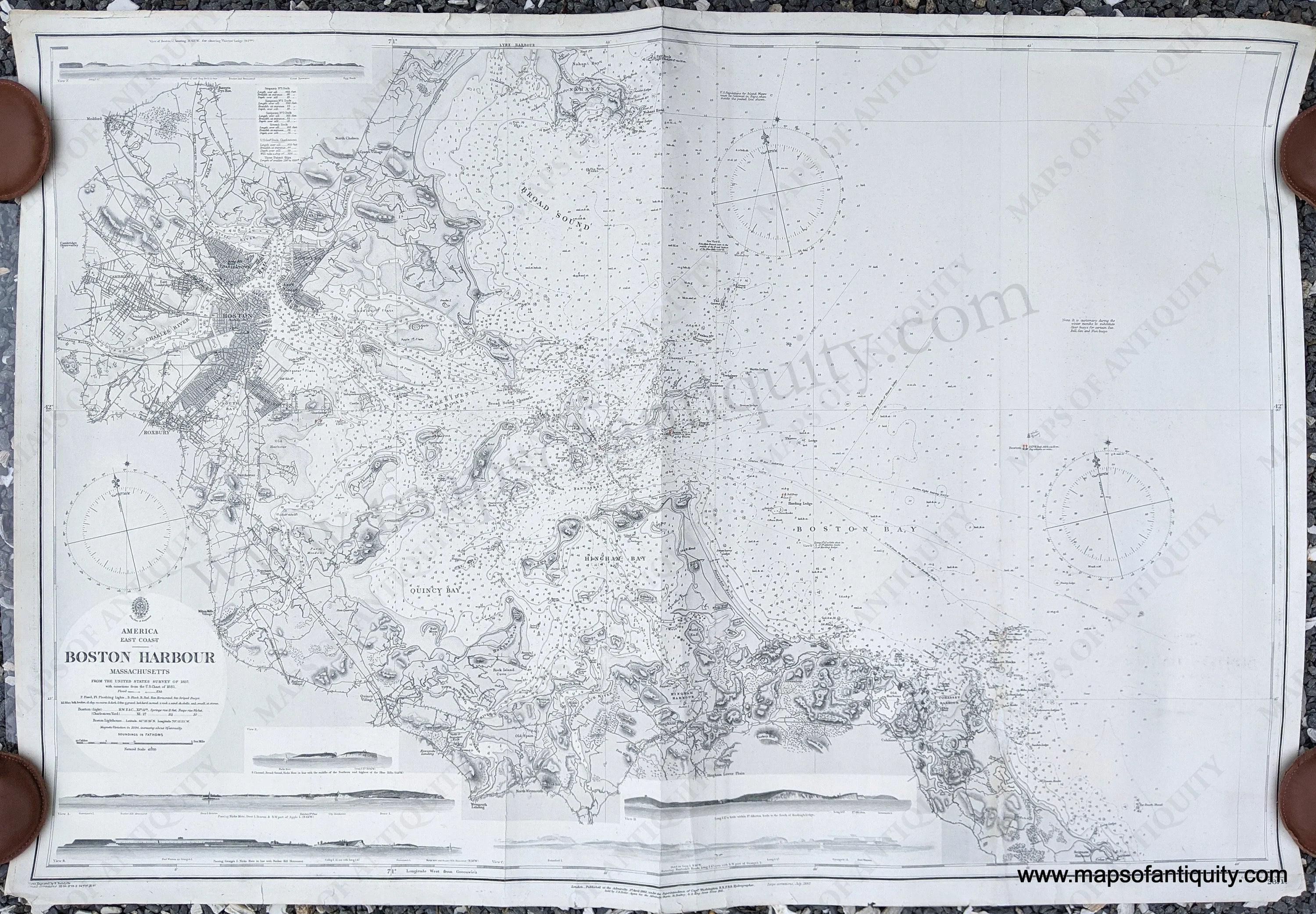 Antique nautical chart of Boston Harbour Massachusetts from the United States Survey, 1857 with large corrections to 1882 and small corrections to 1897 by the Hydrographic Office of the British Admiralty. This unusual Boston Harbor chart shows the neck with the fill recently added, includes 6 recognition profiles, good coastline topographic detail along with navigational depth information. It covers the area from Nahant to Cohasset and Scituate Harbors, and includes nice representation of Charlestown, East Boston, Cambridge, and Roxbury. Has minor annotations from use. Measures about 26" x 39" to the neatline. Very good condition with some repaired tears at the paper edges and some vertical folds with the center fold being quite strong. Should flatten nicely. **NOTE- because this map requires extra insurance for shipping, an additional charge will appear on your card after your original purchase. If you would like to know what that charge will be, please contact us.**