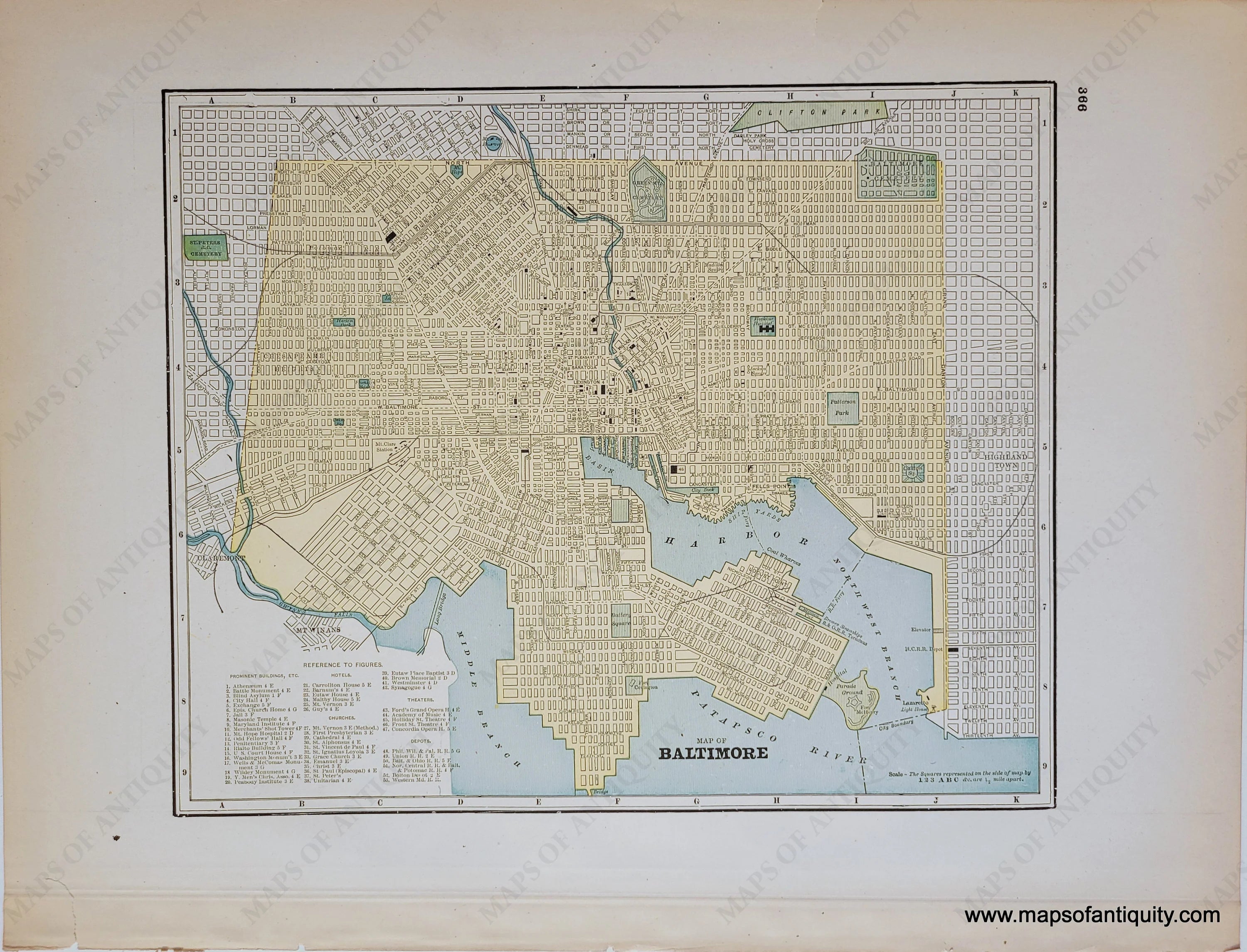 Antique double-sided printed color city plan, by Geo. Cram, circa 1900. Map of Brooklyn NY on one side and map of Baltimore MD on the reverse. Very good overall antique condition with toning at edges and some minor stains mostly in margins. Brooklyn map measures 10 x 11 inches to the neatline. Text on the right side lists elevated railroad stations and the various districts. Baltimore map measures approx. 10 x 12.5 inches