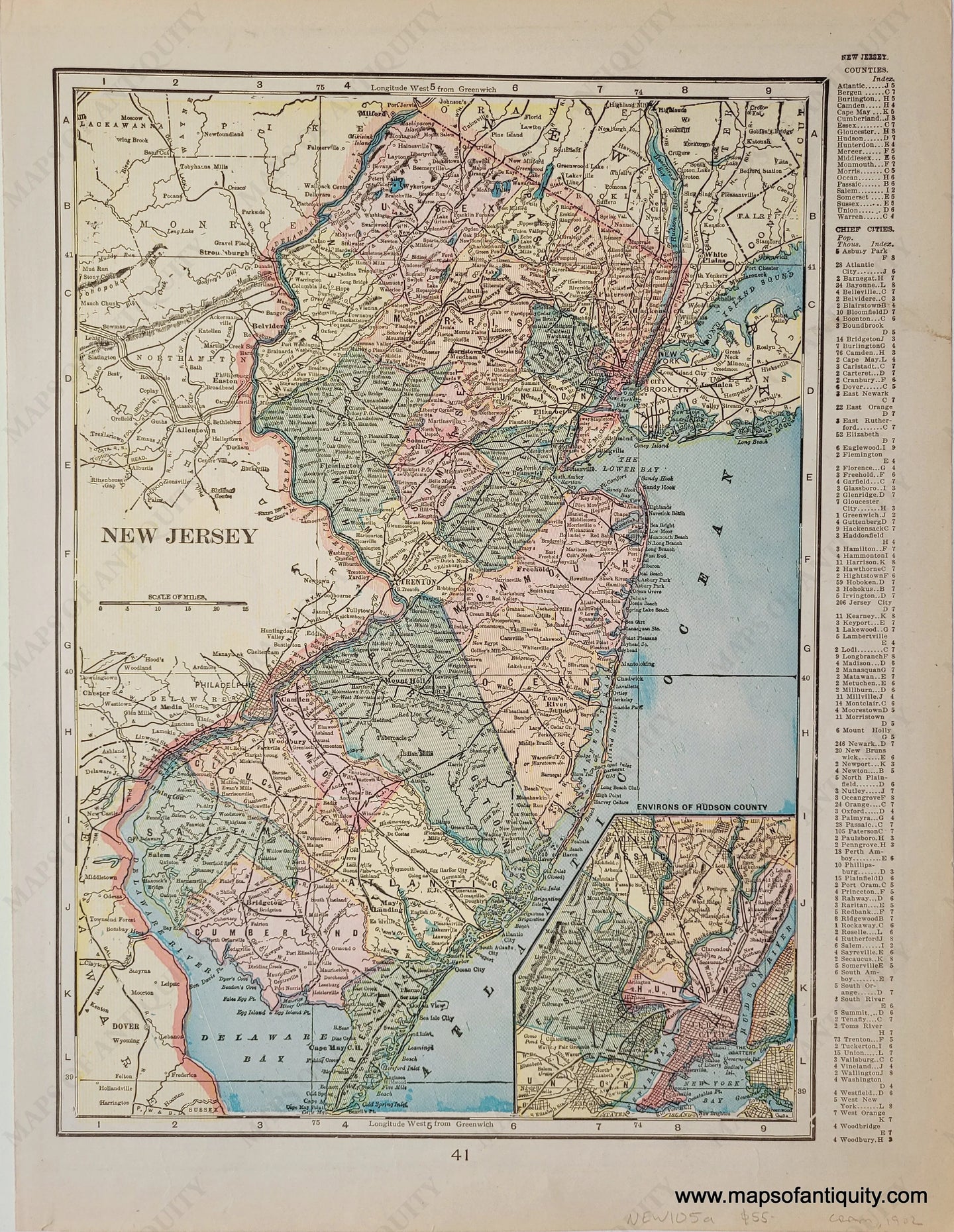Antique printed-color map of New Jersey. Inset map of the Environs of Hudson County with Jersey City. Very good condition with some slight toning at the edges, as well as some charming imperfections in the printed color. By Cram, from Cram's Universal Atlas, Geographical, Astronomical, and Historical. Approximately 12.75" x 9.25" to the neatline.