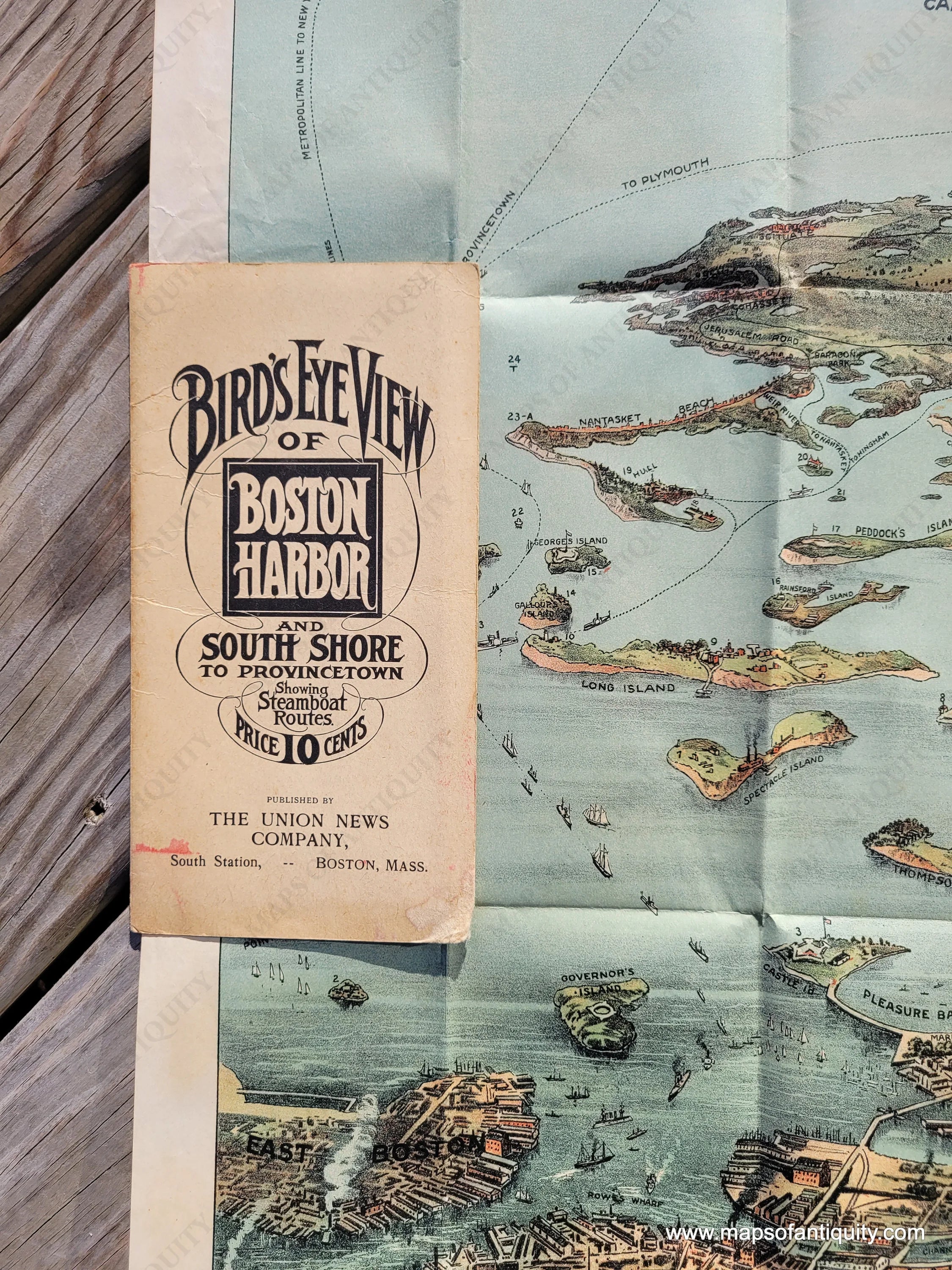 Antique map showing bird's eye view of Boston Harbor, looking east over Quincy Bay and Cape Cod Bay, with Provincetown in the distance. This was published as a tourist map in 1905 by Federal Engraving and Publishing Co./Murphy. Includes small illustrations of points of interest, ships, etc., and numbered identifications of points of interest. Vibrant original chromolithograph printed-color. Good overall antique condition. Folds as issued, with wear along the folds and some wrinkles at the fold intersections. Measures approximately 17.5 x 21 inches.