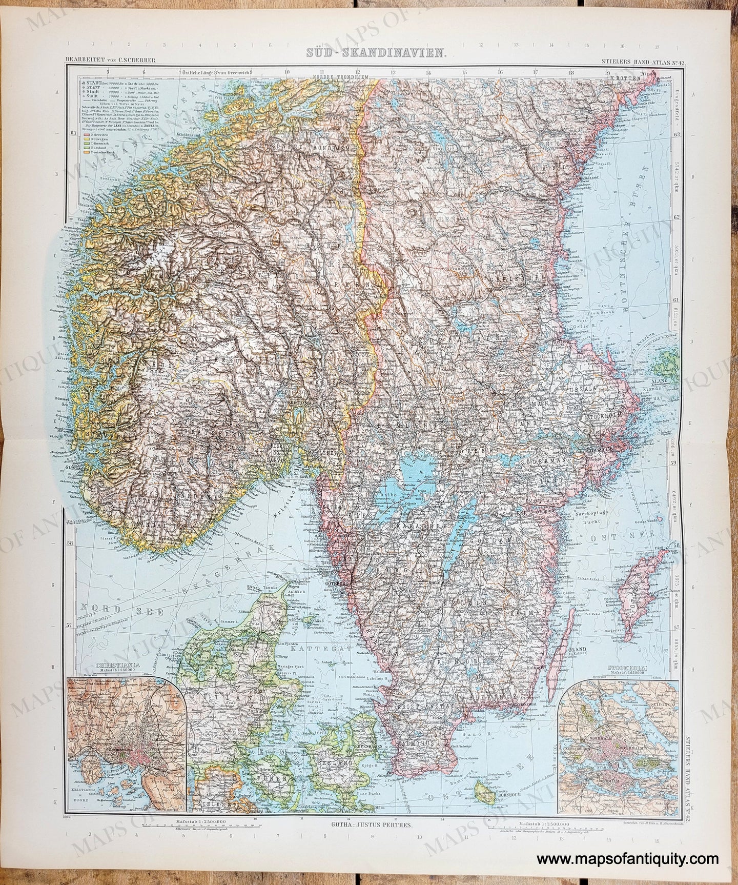 Antique map of the southern portions of Norway and Sweden, with much of Denmark, from Stieler's Hand-Atlas, 1905. With inset maps of Christiania (Oslo, Norway) and Stockholm, Sweden. Shows cities, railroads, underwater telegraph cables, political divisions at that time. Highly detailed. Original printed color. Text in German. Very good overall antique condition with mild toning at paper edges and slight darkening at the center fold. Approx. 16 x 13.25 inches to the neatline.