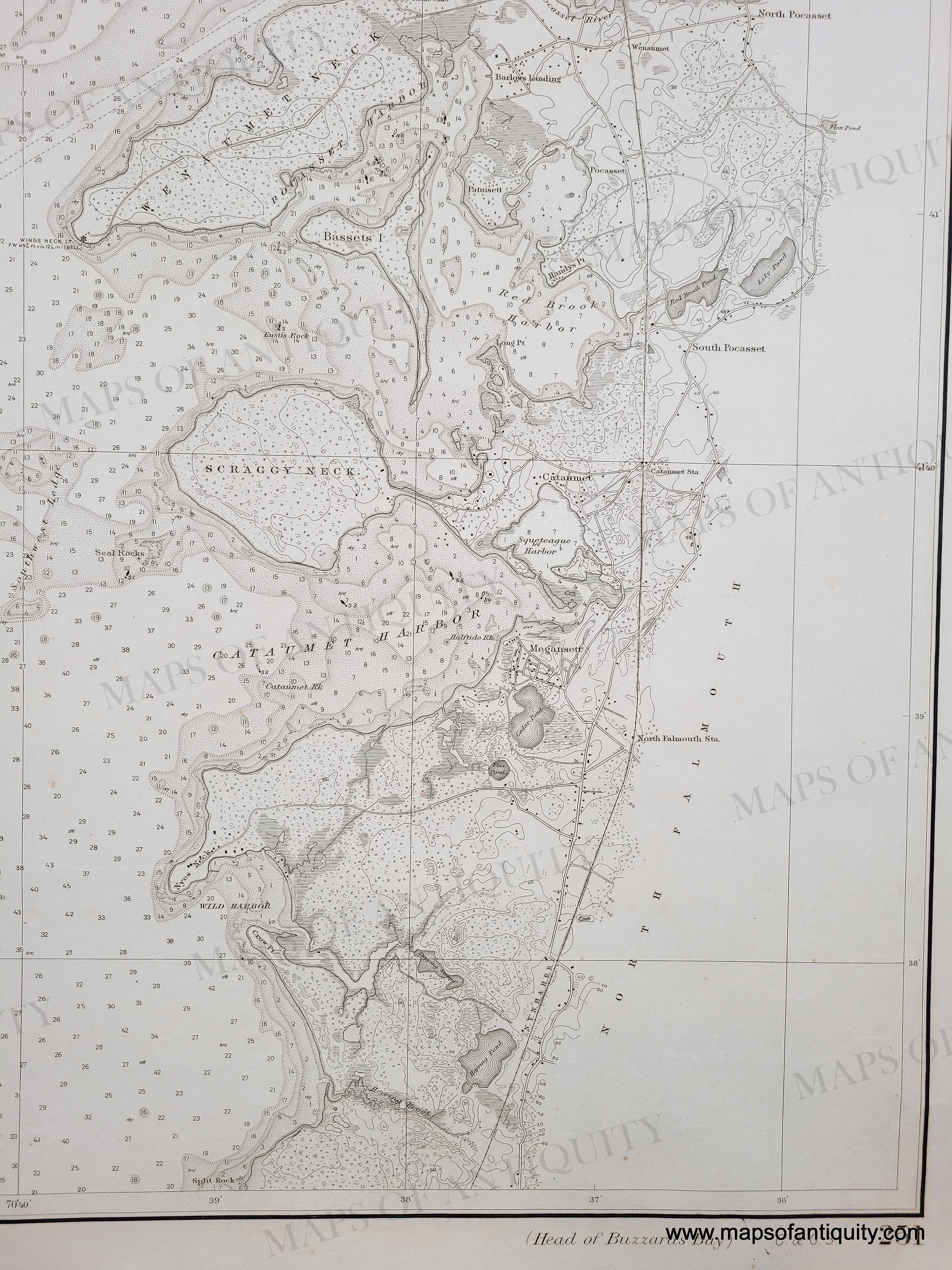 Falmouth Islands detail. Black and white chart showing Buzzards Bay with the beginnings of the Cape Cod Canal. Includes some topographic details along the coast.