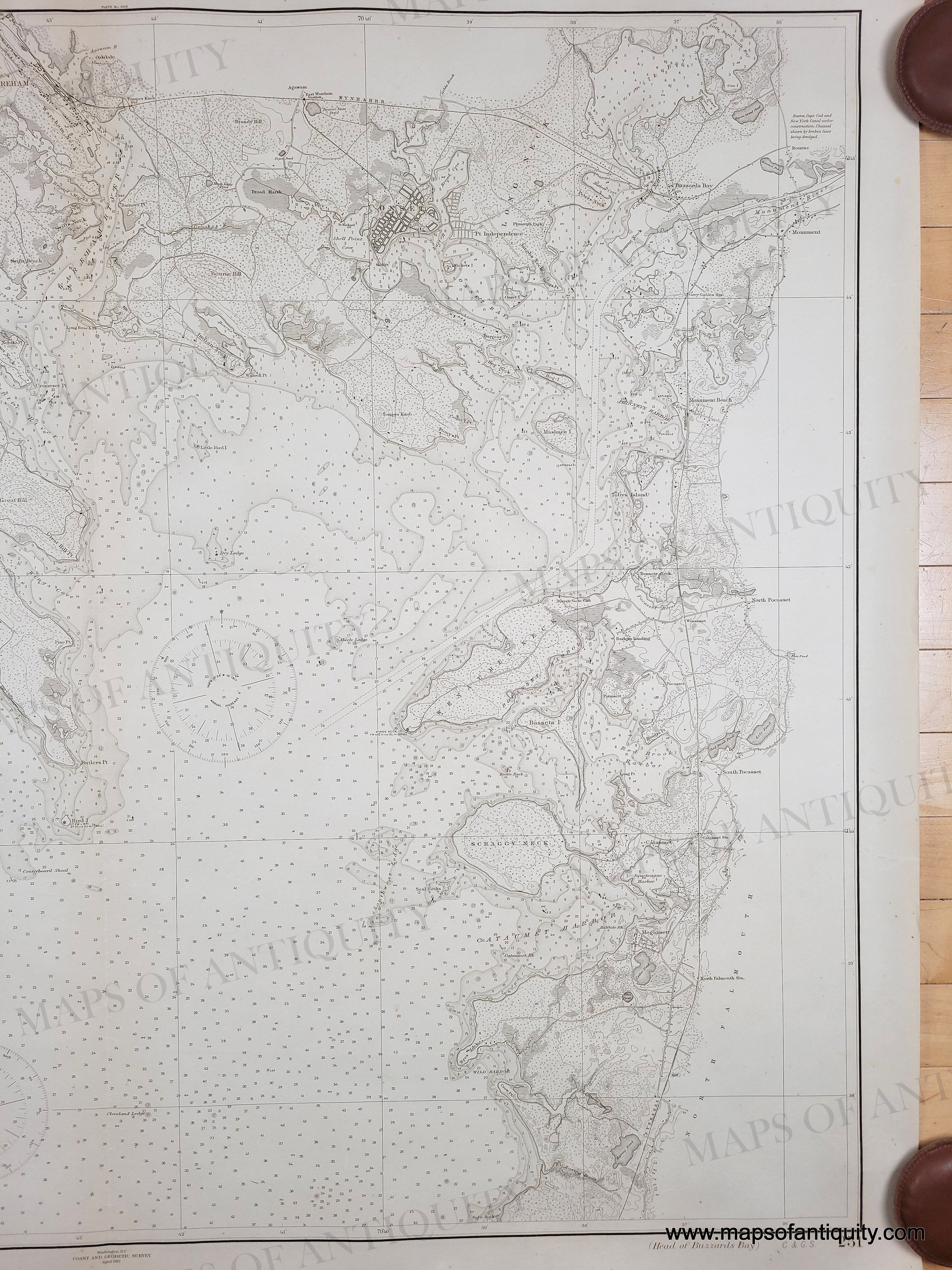 Antique chart of the head of Buzzards Bay published in 1912 by the US Coast and Geodetic Survey (USCGS). Includes Falmouth, Wareham, Marion, Mattapoisett, Buzzards Bay, Scraggy Neck, etc. This chart was published during the creation of the Cape Cod Canal (it opened in 1914) and you can see the path ships were told to take to approach the Canal and the narrow first iteration of the Canal, which many mariners avoided because the convenience did not outweigh the danger. The Cape Cod Canal was taken over by the US government by presidential proclamation after a German U-boat shelled a tugboat in Orleans in 1918. In 1928, the government purchased the canal as a free public waterway, and between 1935 and 1940 the canal's width and depth were increased. As a result, it became the widest sea-level canal of its time. With water depths and navigational information. Very good antique condition with a vertical fold at center, some mild toning, some tiny spots/foxing, and minor wear at the paper edges. Measures approx. 32.5 x 40.5 inches to the neatline.