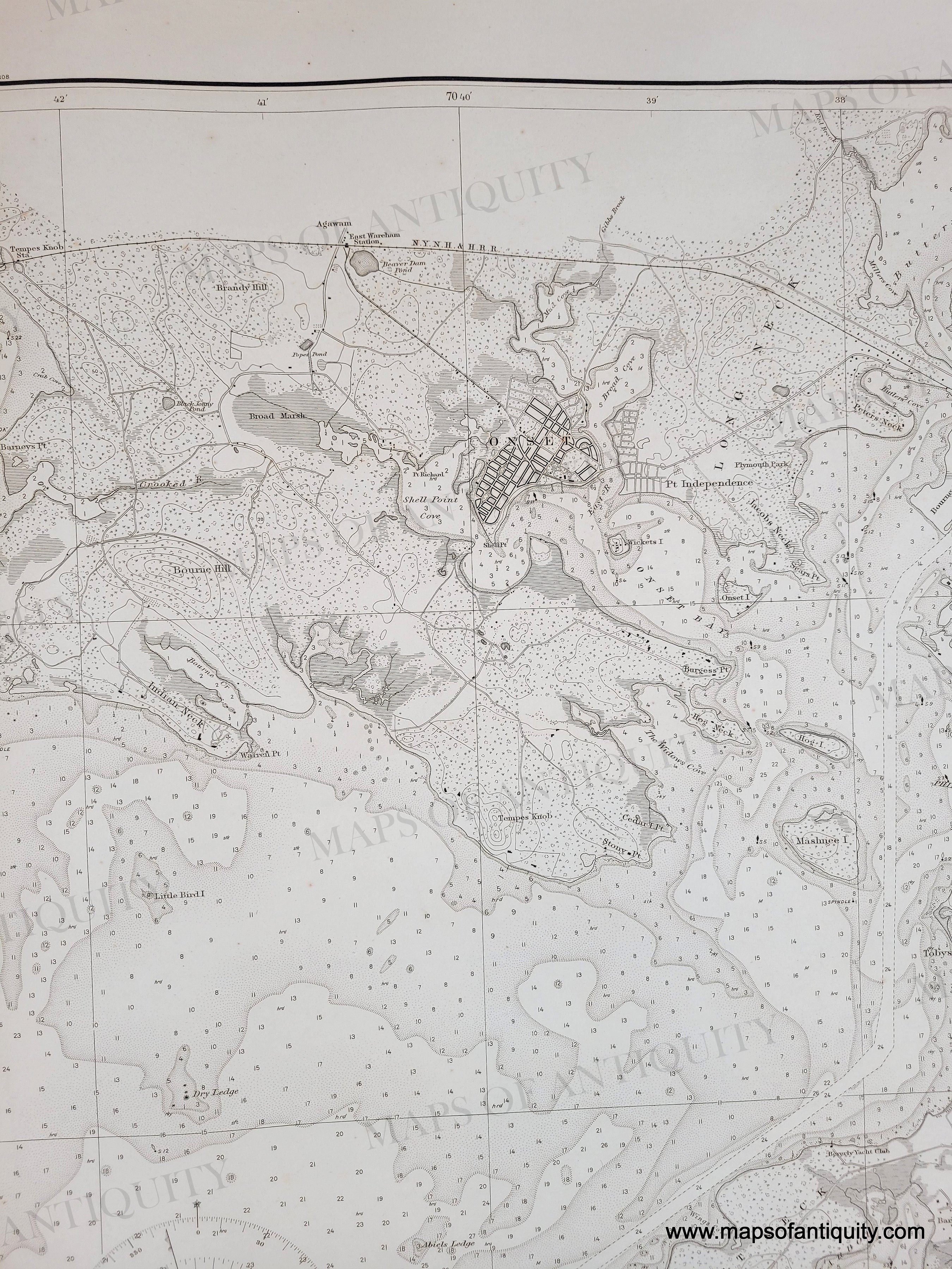 Onset, Massachusetts detail. Black and white chart showing Buzzards Bay with the beginnings of the Cape Cod Canal. Includes some topographic details along the coast.