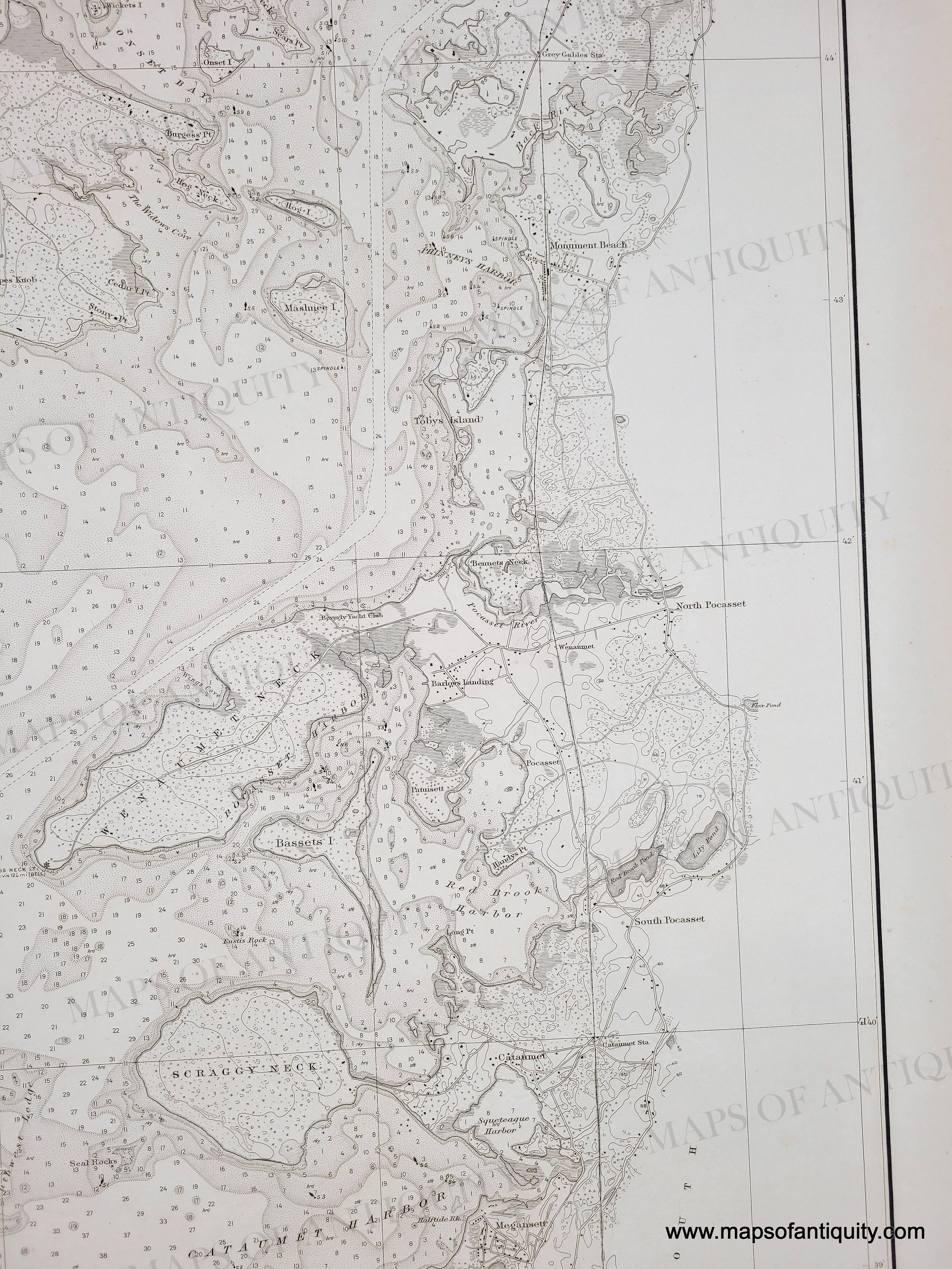 Marion Massachusetts detail. Black and white chart showing Buzzards Bay with the beginnings of the Cape Cod Canal. Includes some topographic details along the coast.