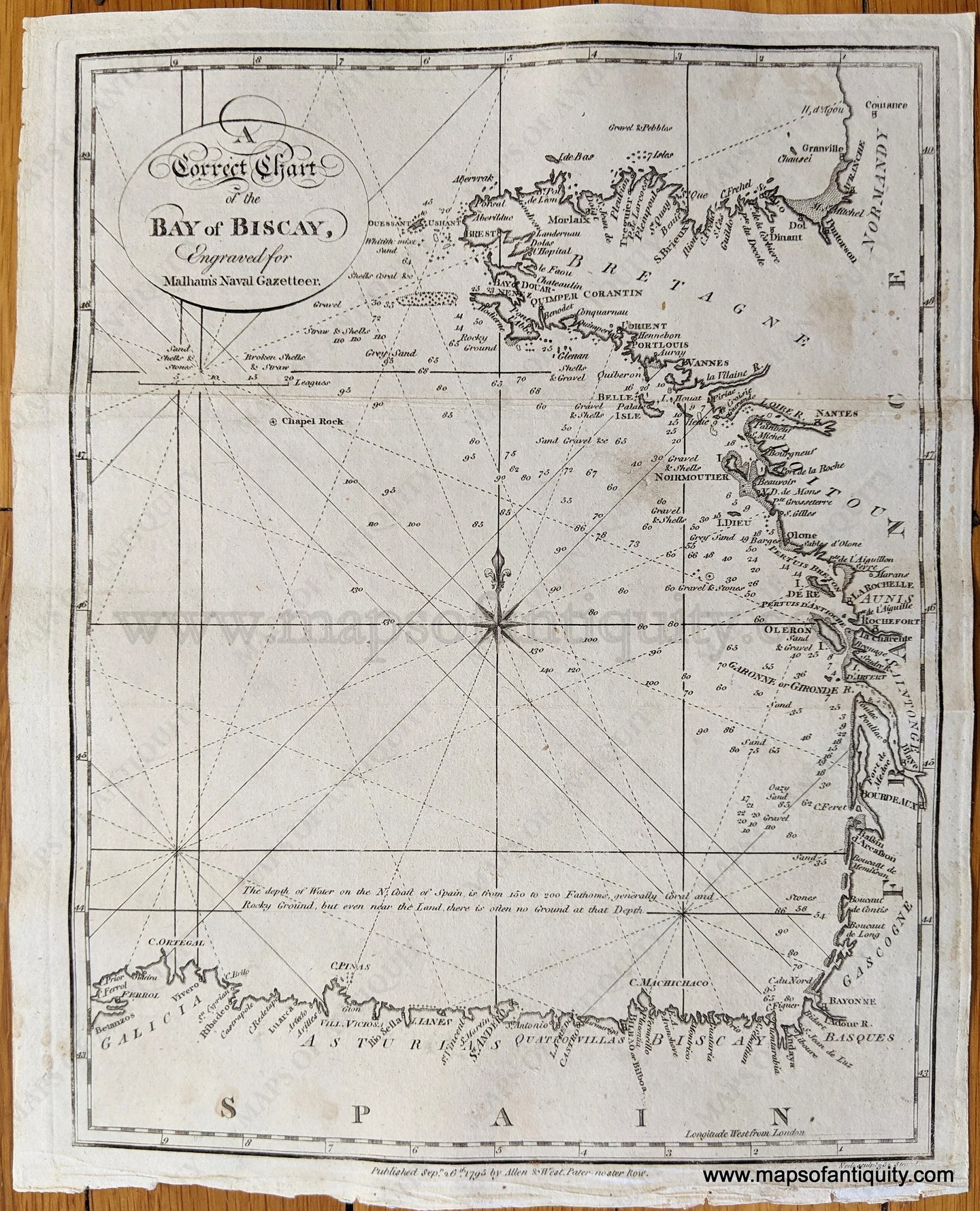 Antique map showing the Bay of Biscay, engraved for Malham's Naval Gazetteer, published by Allen & West, 1795. Features the west coast of France from Brest to Bayonne on the Spanish border, including a section of Normandy from Avranche to Brest and southward to Quimper, Nantes, Isles Noirmoutier, La Rochelle, the Garonne or Gironde River, Bordeaux & Cap du Nord. Also includes the north coast of Spain. Depth soundings appear offshore with a decorative compass at the center of the rhumb lines in the bay. Measures approximately 9.5 x 7.5 inches. Very good overall antique condition- restored, cleaned. Water staining is still slightly visible. Some slight image fading. Paper has a waviness.