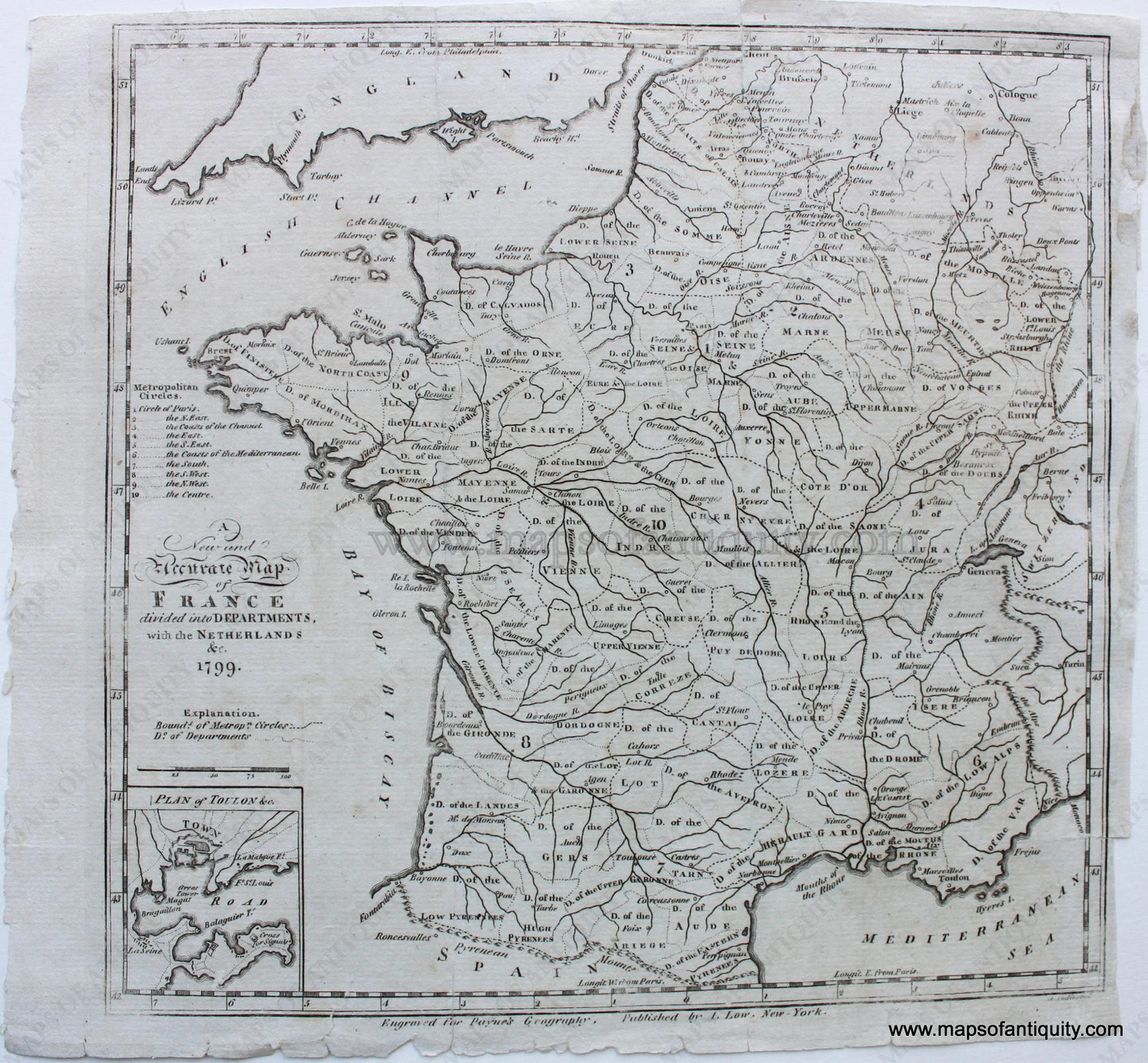 Antique-Black-and-White-Map-A-New-and-Accurate-Map-of-France-divided-into-Departments,-with-the-Netherlands,-&c.-1799-1799-Payne/Low-France-1800s-19th-century-Maps-of-Antiquity