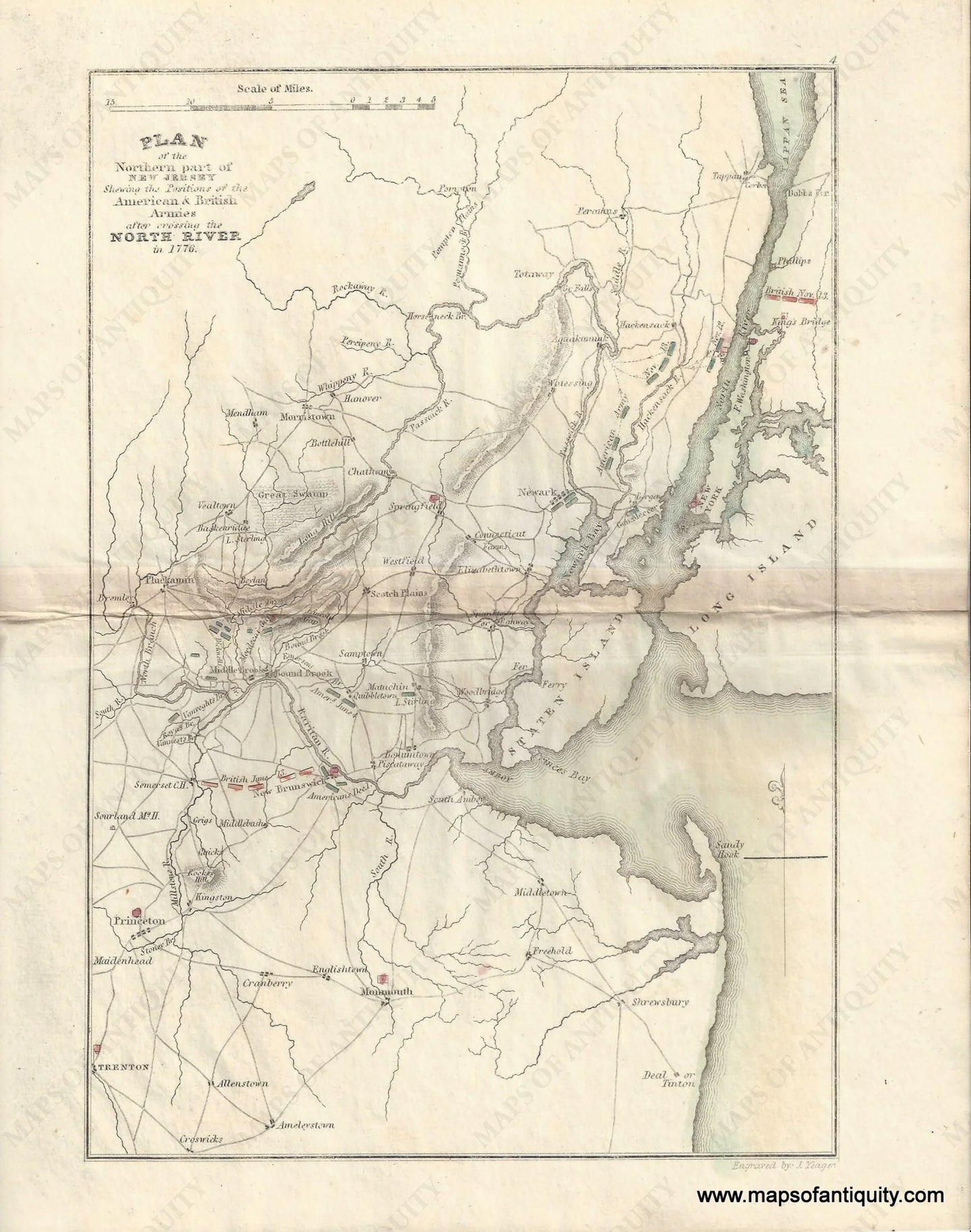 Antique hand colored map of the Revolutionary War situation in Northern New Jersey, from the atlas to accompany John Marshall's "The Life of George Washington Commander in Chief of the American Forces during the war which established the Independence of his Country, and First President of the United States: compiled under the inspection of The Honourable Bushrod Washington, From Original Papers bequeathed to him by his deceased Relative." This map includes Bergen, Hudson, Essex, Union, Middlesex, and Monmouth counties and the locations of British and American armies. Good to very good condition with slight discoloration at the center fold. Measures approx. 9.25 x 6.5 inches.