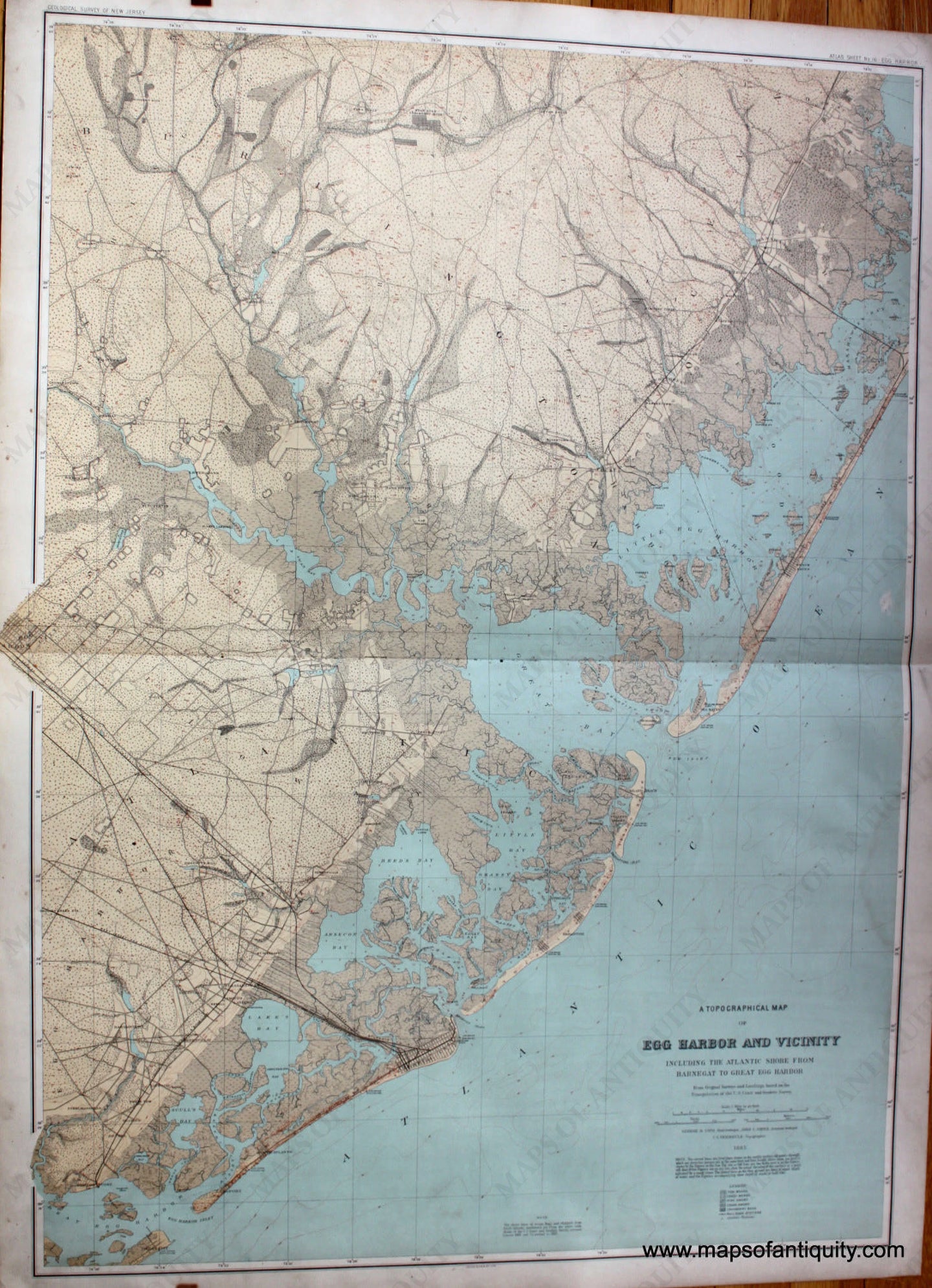 Antique printed color map, Atlas Sheet No. 16 showing a topographical map of Egg Harbor including Little Egg Harbor, Great Bay, Atlantic City, Brigantine Beach and the tip of Ocean City. From Original Surveys and Levelings based on the Triangulation of the U.S. Coast and Geodetic Survey. Good condition, 25 x 34.5" Some surface soiling