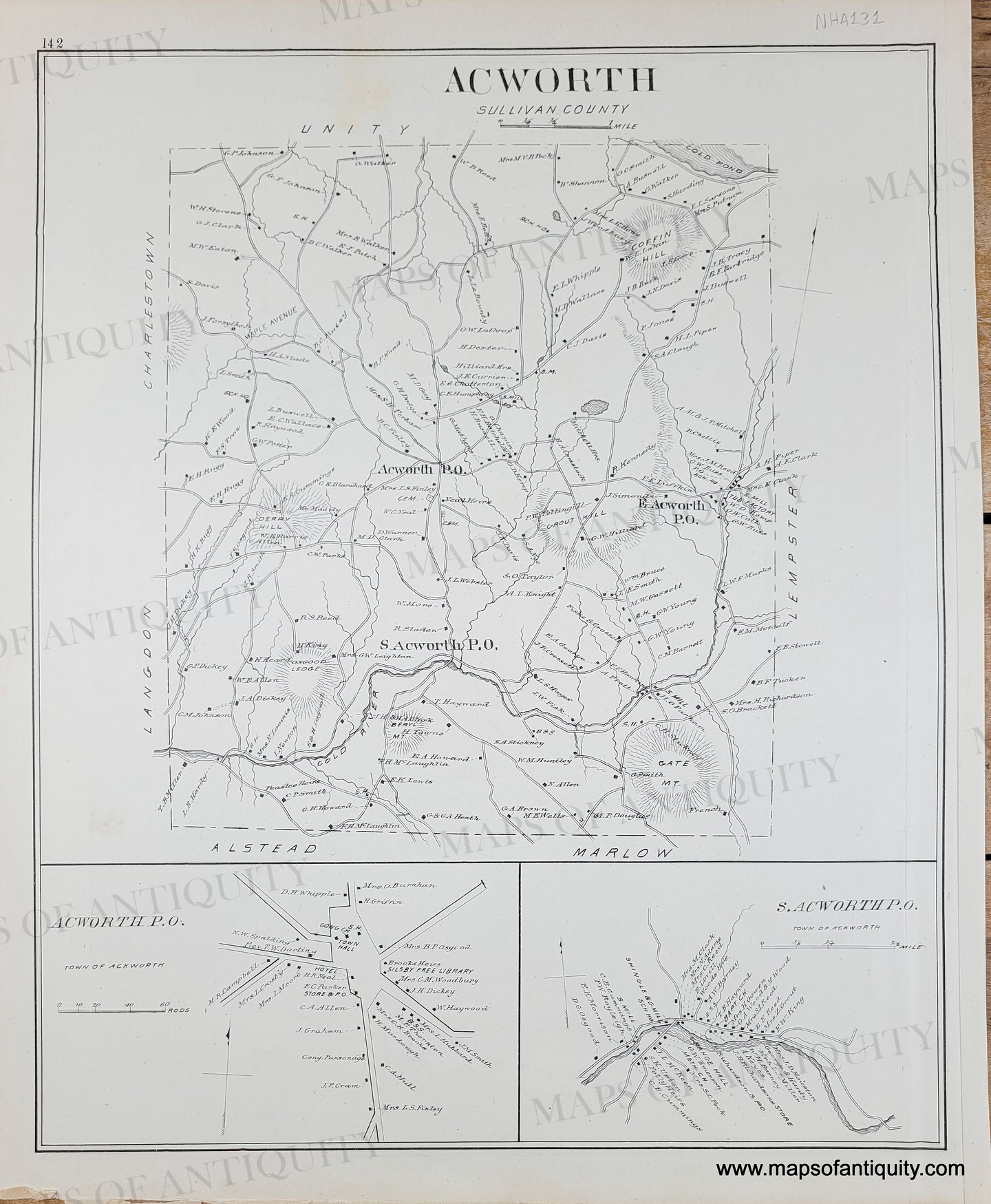 Antique black and white page with a map of Acworth, New Hampshire, and additional maps of the vicinities of the Acworth Post Office, and the South Acworth Post Office. From the Town and City Atlas of the State of New Hampshire, by D.H. Hurd, 1892. Includes the names of property owners at the time of publication. Good to Very good antique condition with mild toning of the paper and a few areas of minor foxing/soiling, as well as a crease along the right side and edge wear at the bottom of the page. Measures approx. 13 x 17.25 inches.