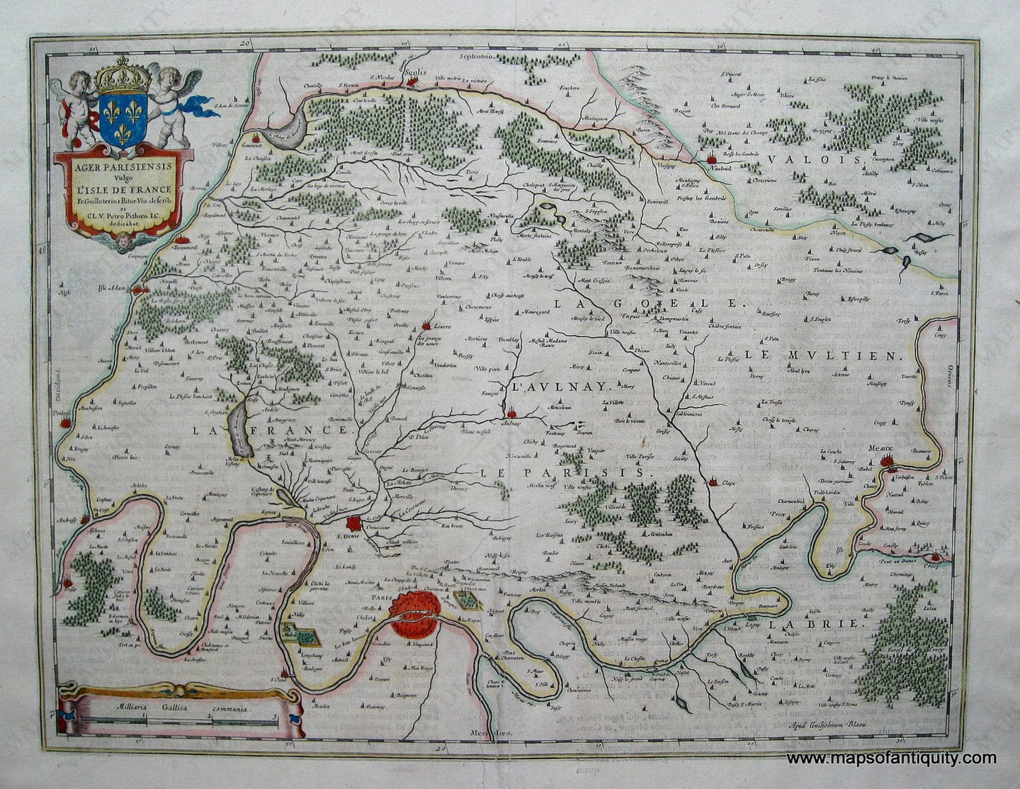 Antique hand colored map of the Isle de France, by Blaeu, 1645, restored, repaired tears in center, text on reverse, condition overall is good. Approx. 15 x 19.5 inches.*****SOLD*****