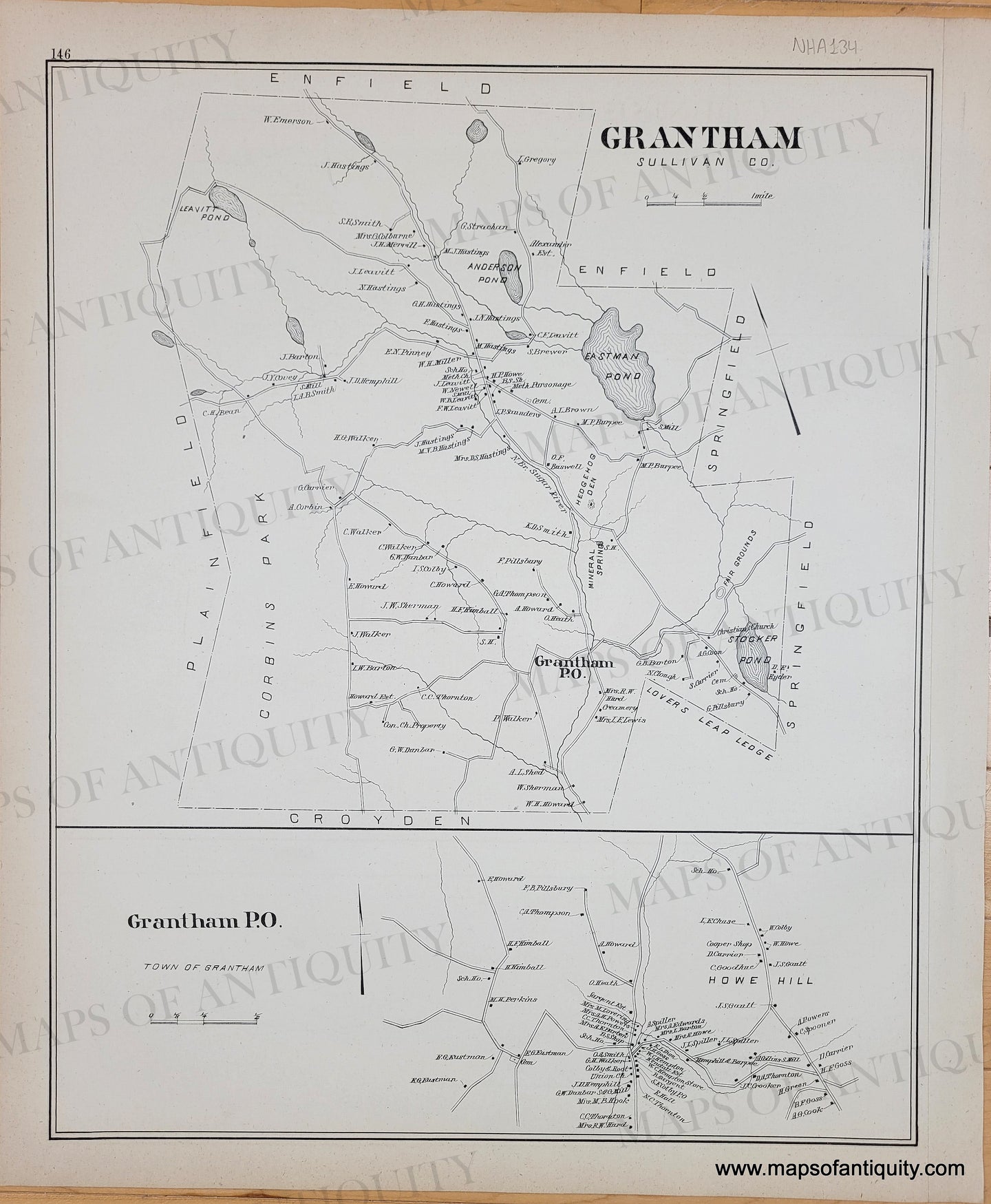Antique black and white map of Grantham, New Hampshire, with an additional map of the vicinity of the Grantham Post Office. From the Town and City Atlas of the State of New Hampshire, by D.H. Hurd, 1892. Includes the names of property owners at the time of publication. Very good antique condition with some toning of the paper, a couple spots of very minor foxing/soiling, and some paper damage along the border at the top right of the map. Measures approx. 13 x 17.25 inches.