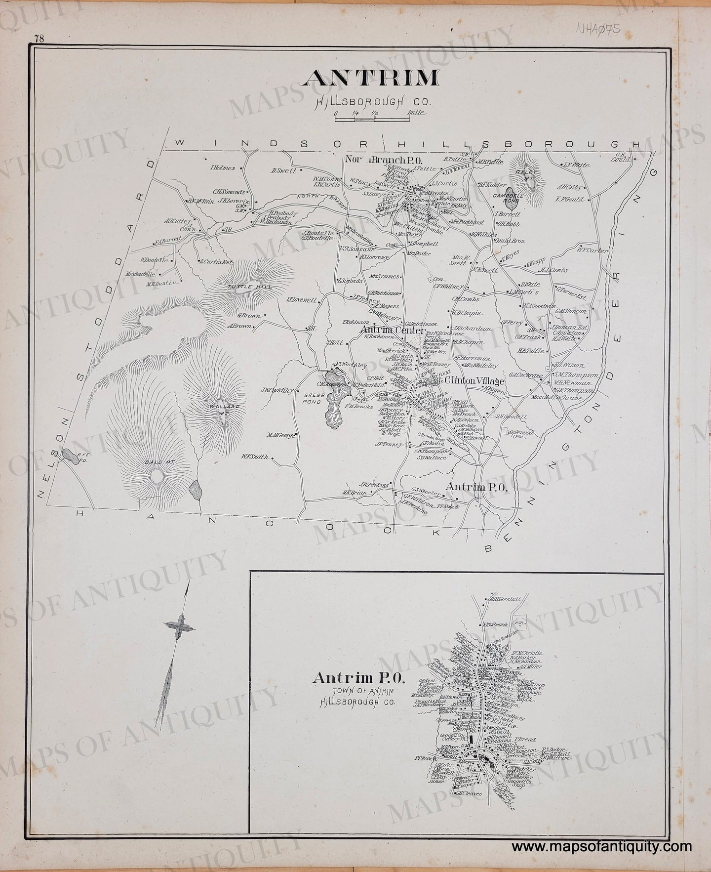 Antique black and white map of Antrim, New Hampshire, with an additional maps of the vicinity of the Antrim Post Office. From the Town and City Atlas of the State of New Hampshire, by D.H. Hurd, 1892. Includes the names of property owners at the time of publication. Good antique condition with toning of the paper, some minor wrinkling, and a few spots of notable foxing, which is more prevalent outside the neatline. Measures approx. 13 x 17.25 inches.