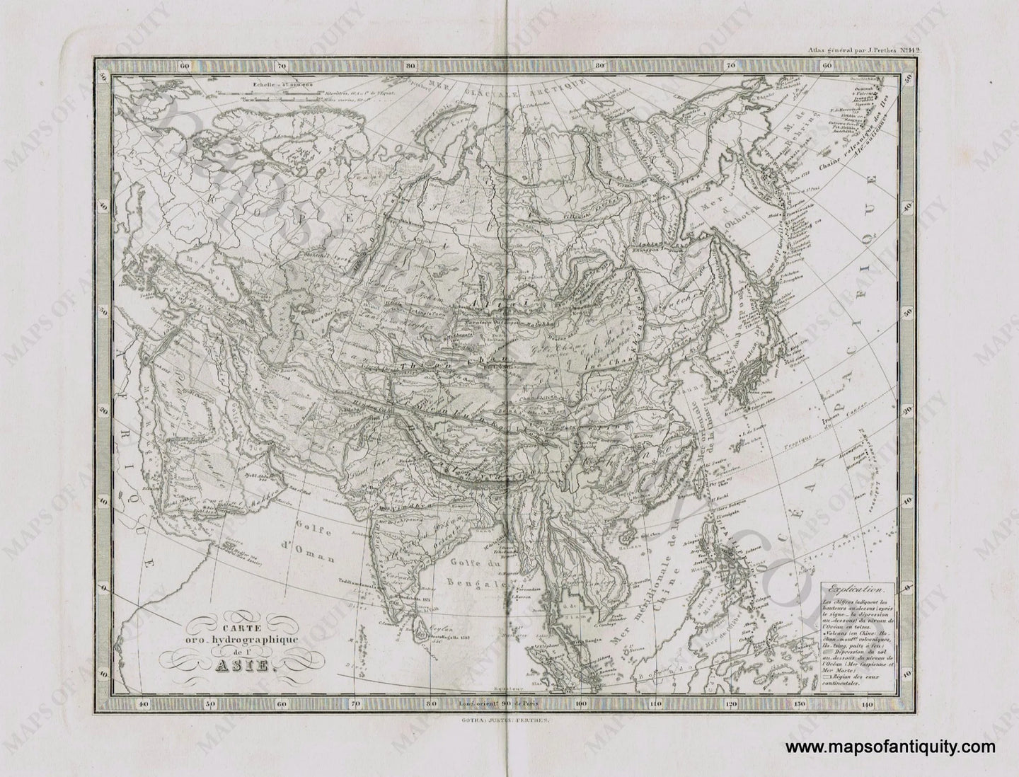 Antique engraved map of Asia from the 1871 Perthes Atlas Gà ©nà ©ral. In very good antique condition with some minor toning and foxing, fold at center as issued, measuring approximately 9.5 x 12.5 inches