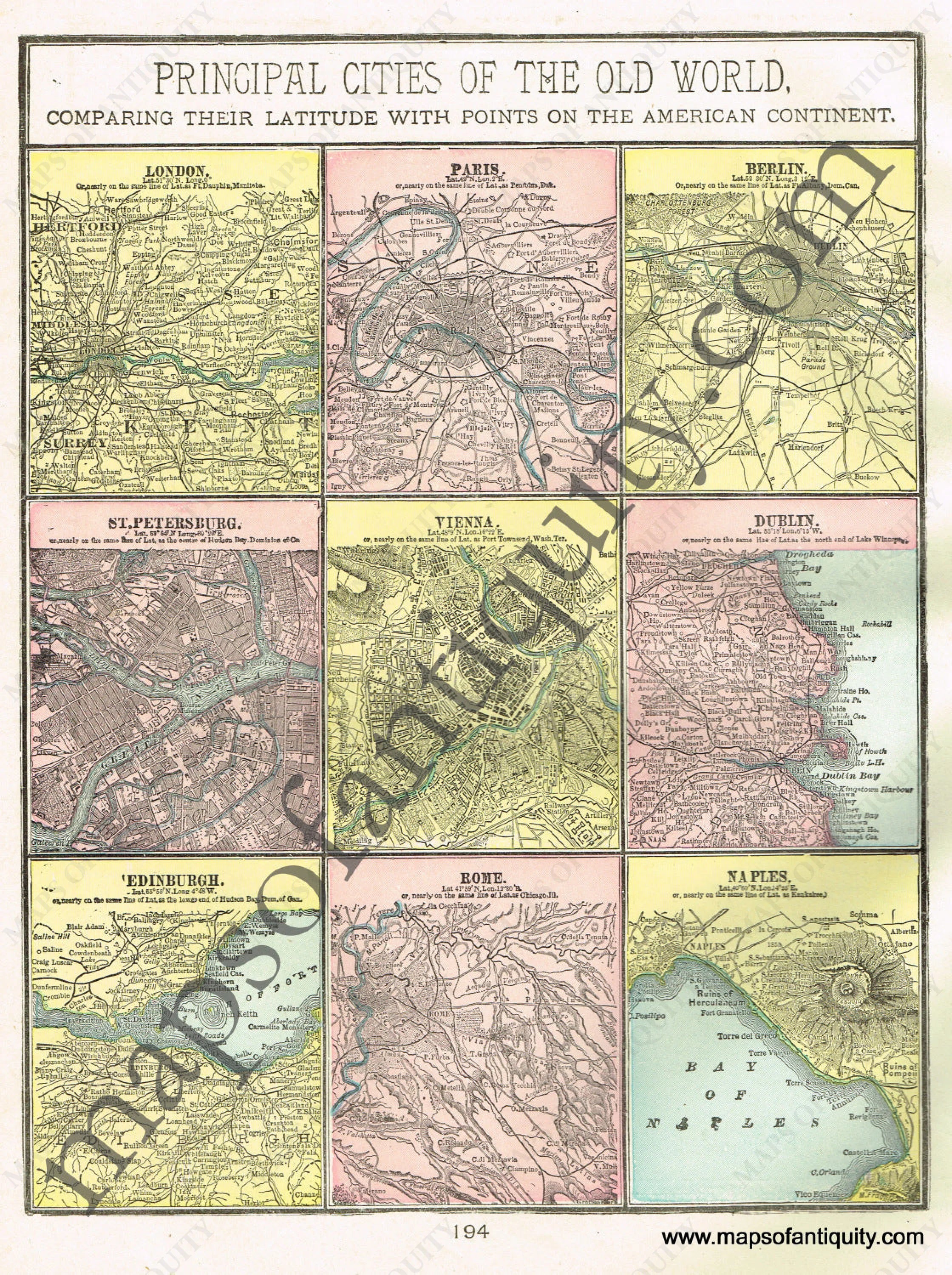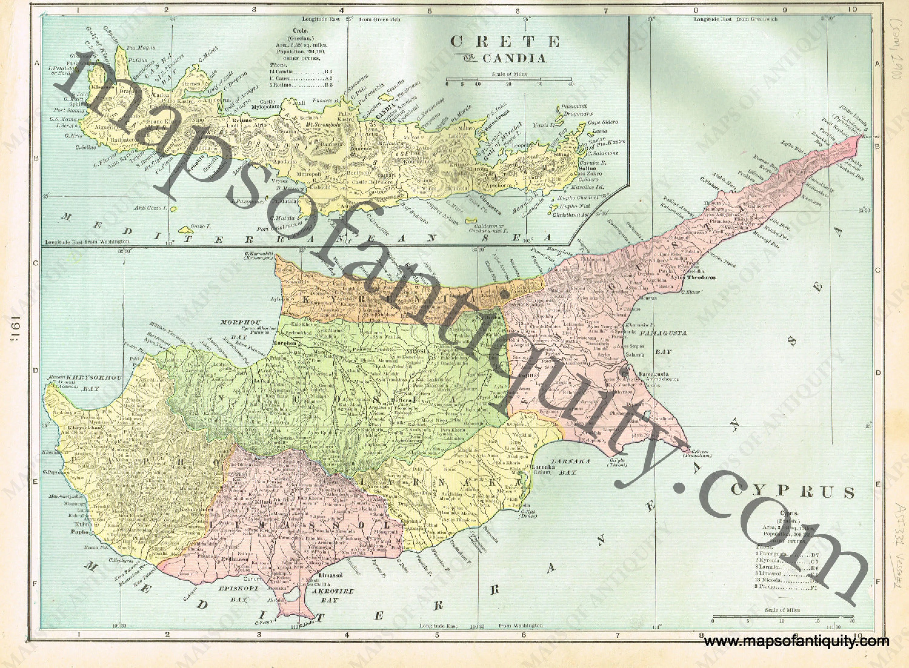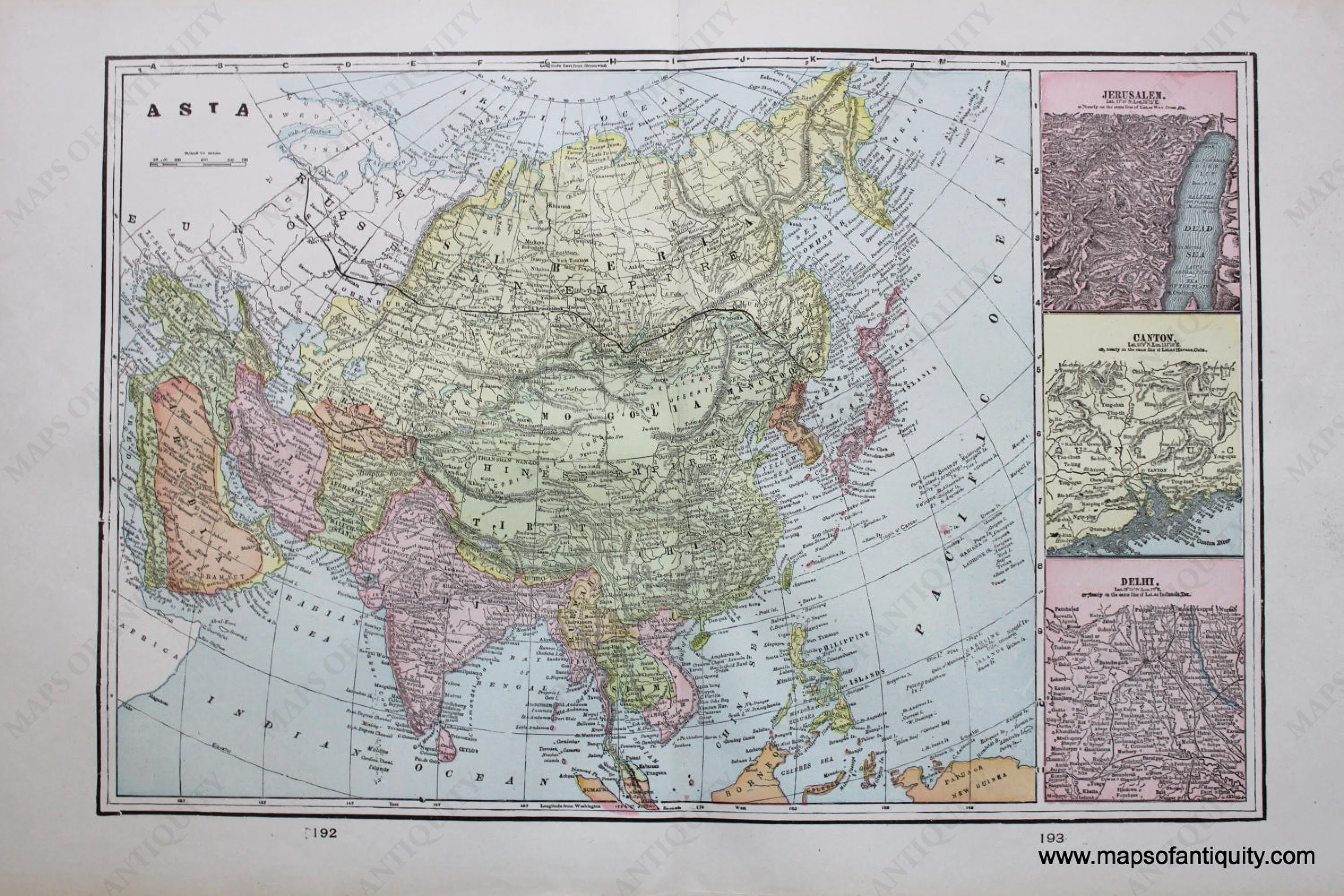 Antique printed color double-sided sheet of Asia (Recto, pages 192 and 193). Includes inset maps of Jerusalem, Canton, and Delhi. Verso: (Page 191) A map of Cyprus which includes an inset map of Crete. Also includes the area, population, and a list of chief cities for both islands. Verso: (Page 194) Maps of many principal cities of Europe- London, Paris, Berlin, St. Petersburg, Vienna, Dublin, Edinburgh, Rome, and Naples. Includes the latitude and longitude of each city. Very good condition with some slight toning at the edges of the pages. By Cram, in Cram's Universal Atlas Geographical, Astronomical and Historical, 1900. Recto map (Asia) measures approximately 11.75" x 17.5" to the neatline. Map of Cyprus measures approx. 10" x 13.5" to the neatline. Map of principal cities measures approx. 11.75" x 9" to the neatline. If you would like to purchase any of these maps separate from the others, please contact us.