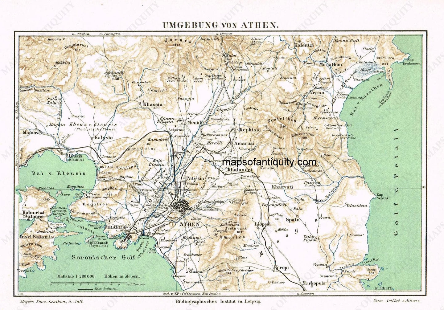 Antique color map of Athens, Egypt, showing much of Athenian penninsula, Aegean Sea, mountains and other topographical features , in German. Very good overall antique condition, approx. 8.5 x 5.5 inches.