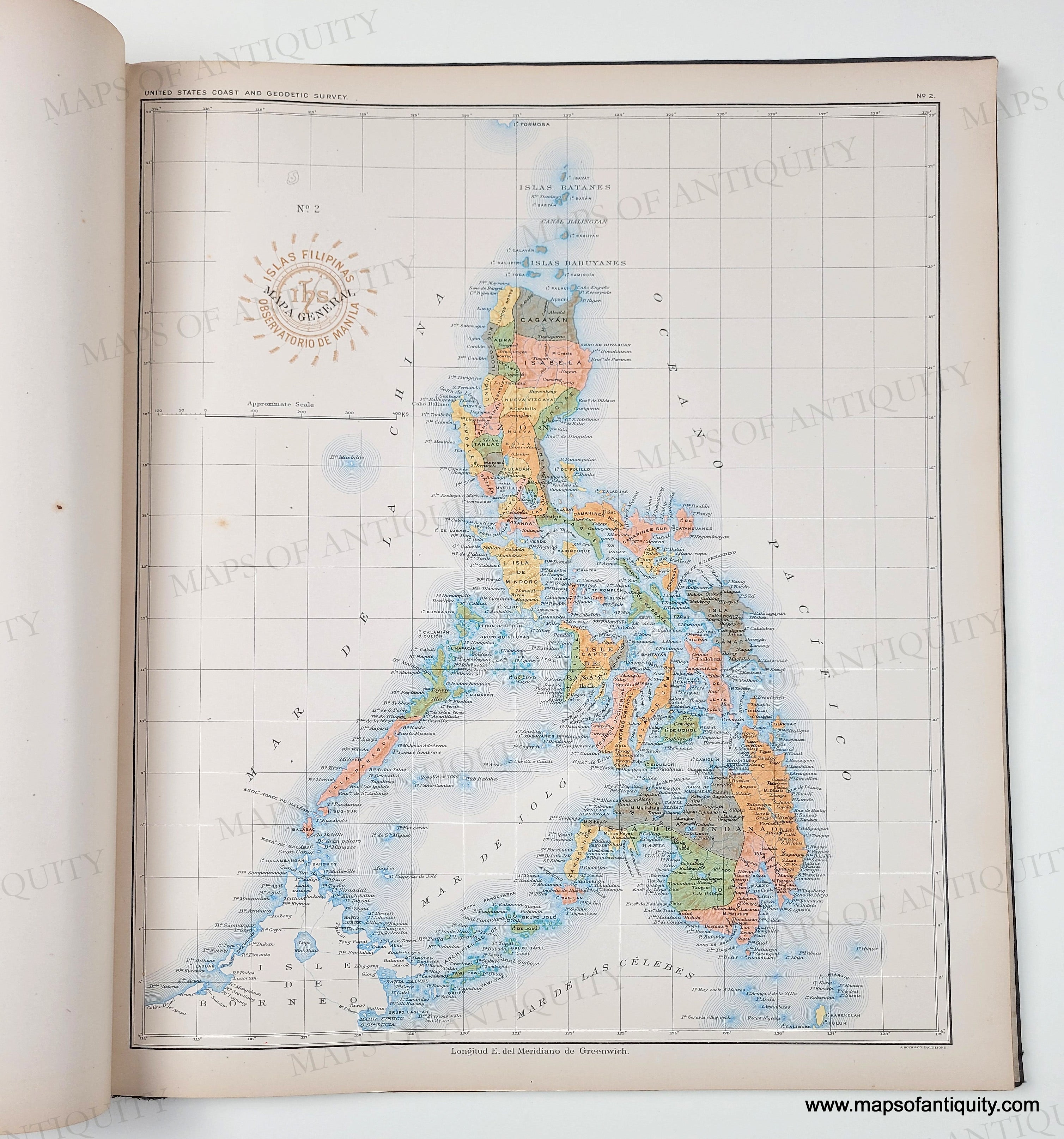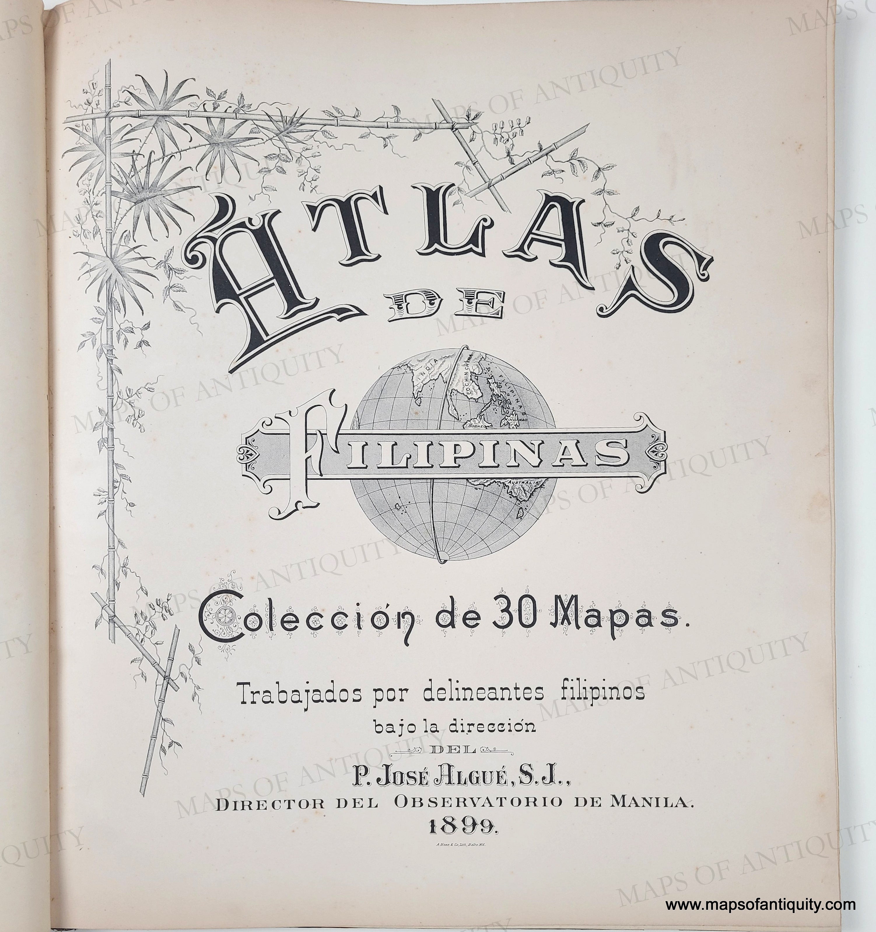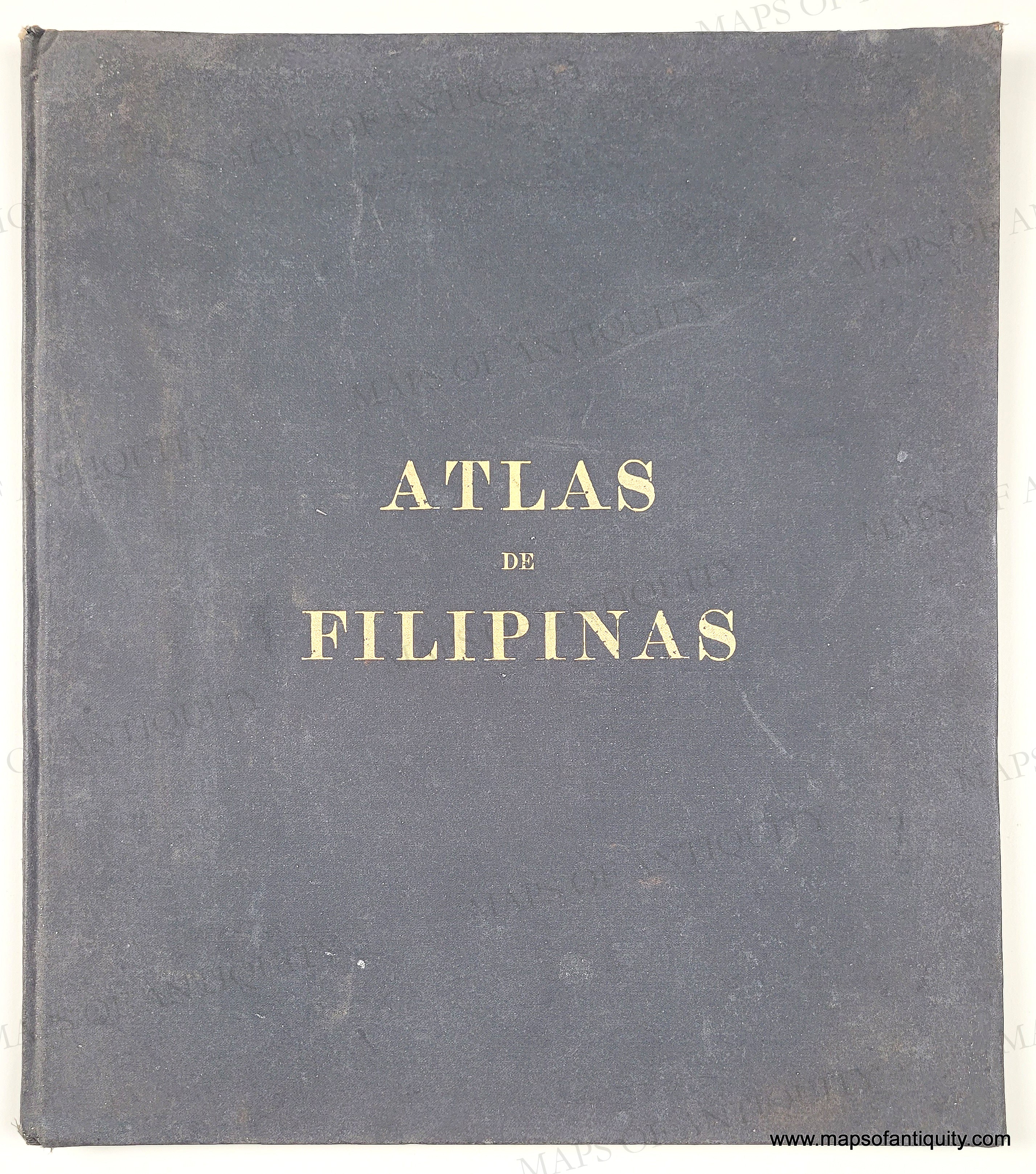 Antique printed color atlas of the Philippines published in 1900. The maps in the atlas were drafted by Philippine draftsmen under the direction of Rev. Jose Algue, S. J., director of the Manila Jesuit Observatory, and the atlas was published by the US Coast and Geodetic Survey. The story of how that came about is printed in the beginning of the atlas, after the two title pages- one in Spanish and one in English. The text on the maps is in Spanish. All maps are single sheet with nothing printed on the verso. The maps are in very good condition. The atlas cover is worn but solid. The binding is solid. The atlas size is approx. 15 x 13.25 inches.