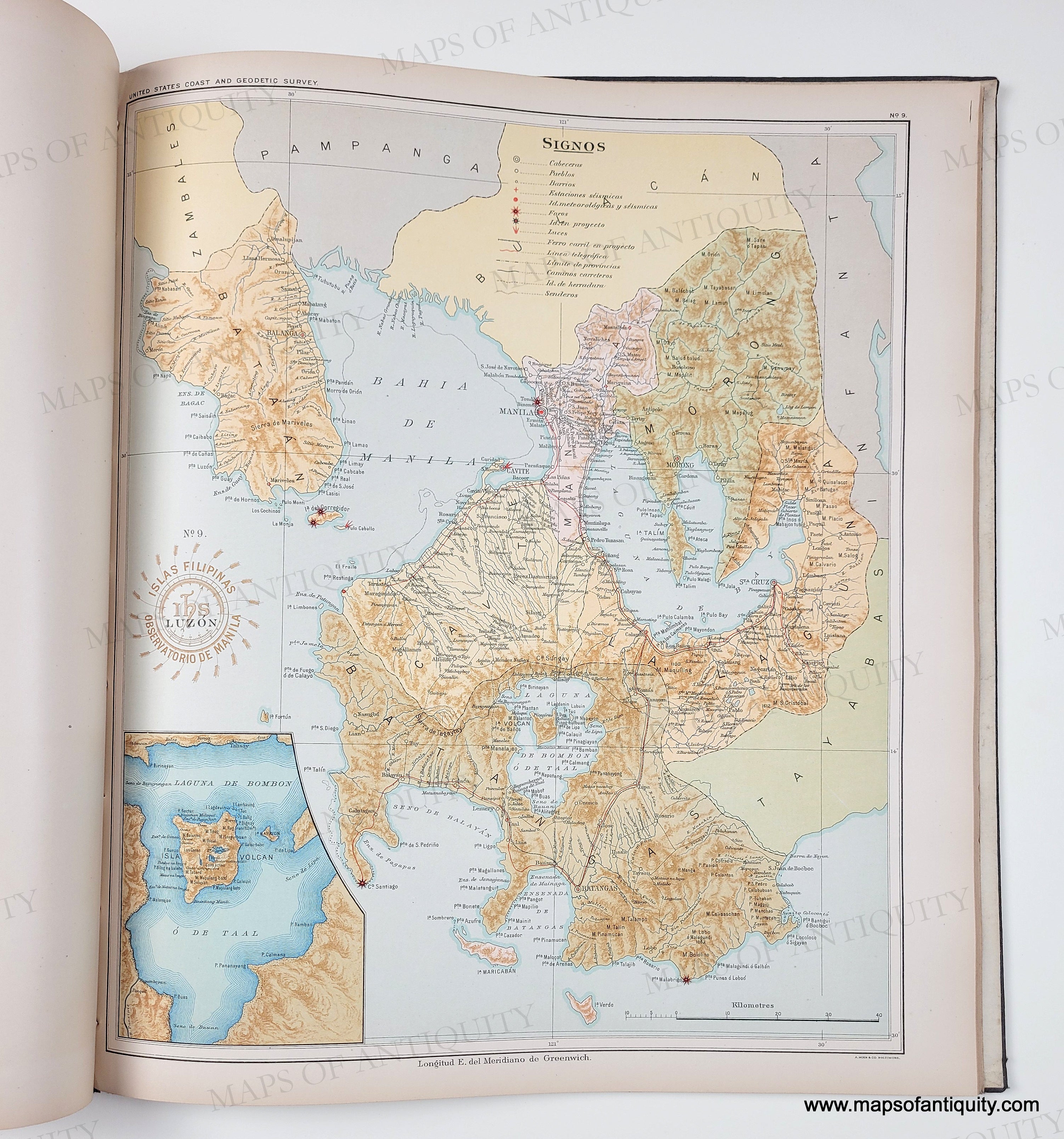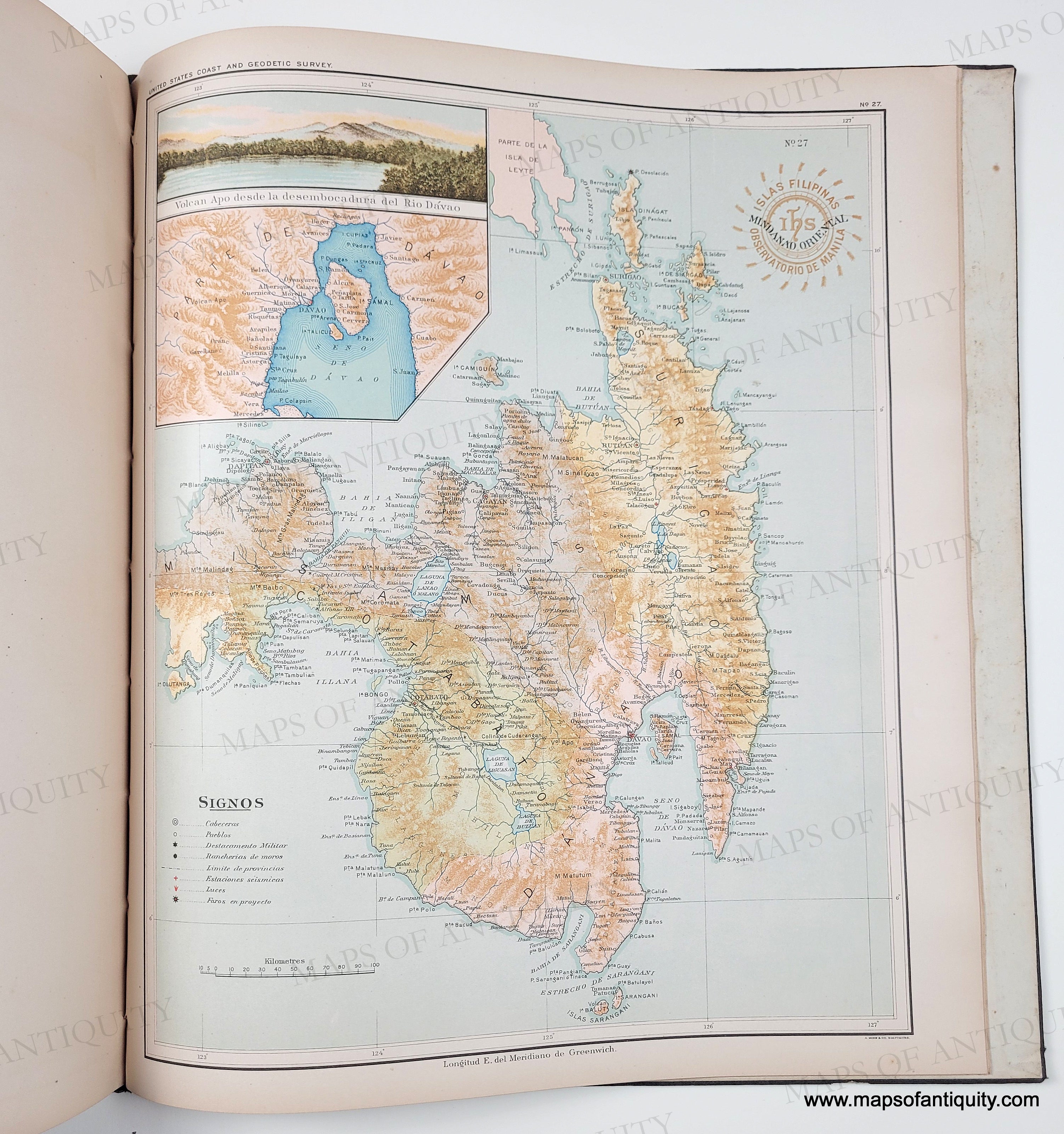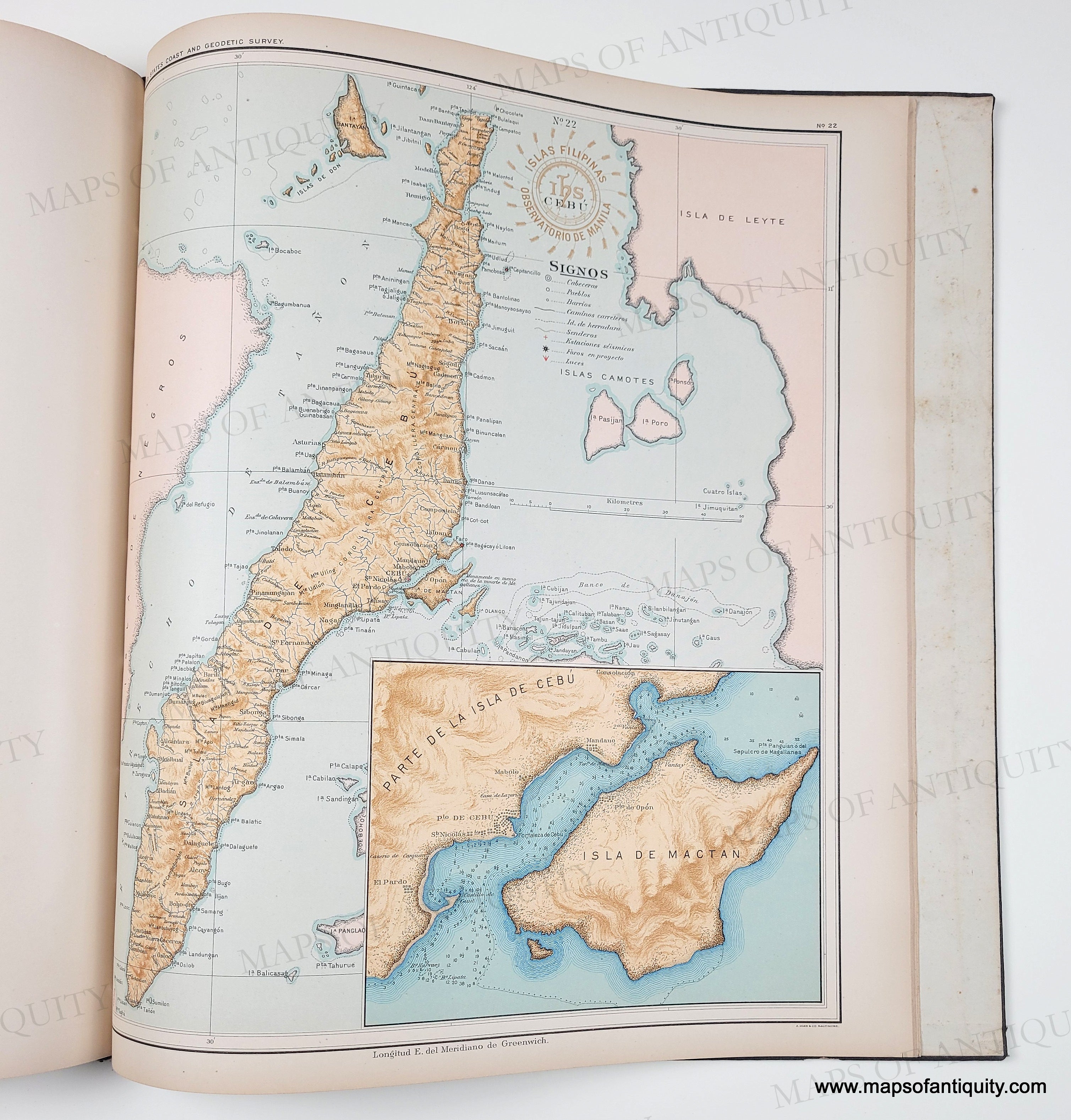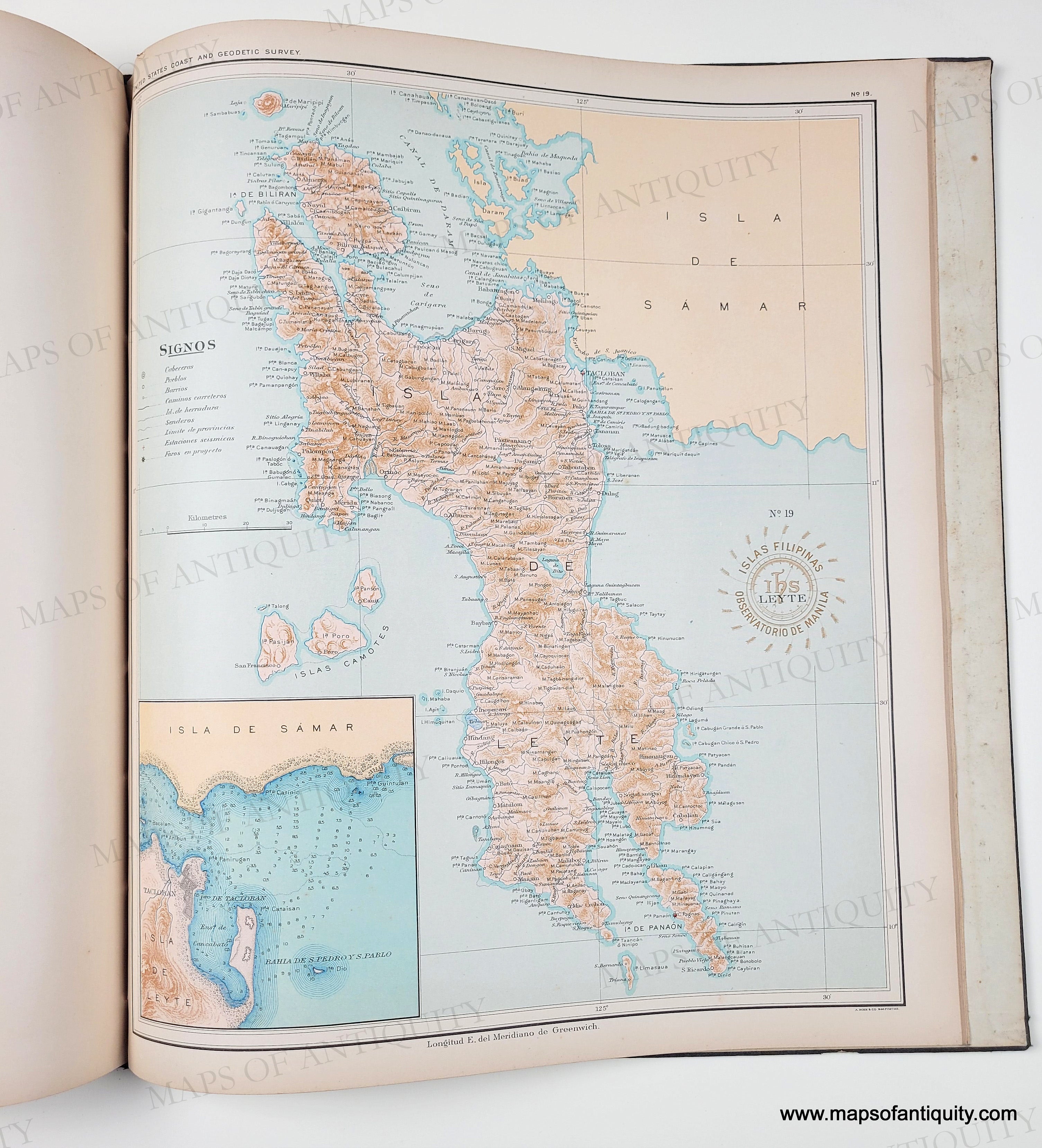 Antique printed color atlas of the Philippines published in 1900. The maps in the atlas were drafted by Philippine draftsmen under the direction of Rev. Jose Algue, S. J., director of the Manila Jesuit Observatory, and the atlas was published by the US Coast and Geodetic Survey. The story of how that came about is printed in the beginning of the atlas, after the two title pages- one in Spanish and one in English. The text on the maps is in Spanish. All maps are single sheet with nothing printed on the verso. The maps are in very good condition. The atlas cover is worn but solid. The binding is solid. The atlas size is approx. 15 x 13.25 inches.