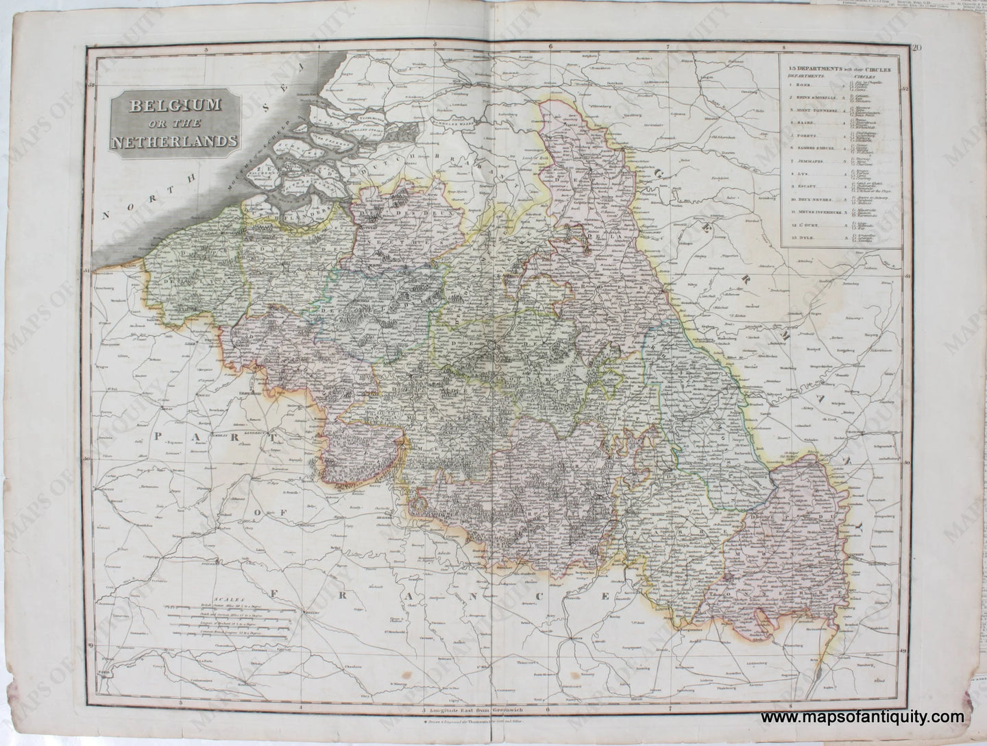 Antique hand colored map of the Netherlands, by Thomson, published in "Thomson's New General Atlas," 1817. Includes bodies of water, etc. Visible plate mark. With fold, as issued. Fair condition with toning throughout, areas of noticeable foxing, tearing/paper loss at the outer edges, and near total seam separation (which has been repaired using archival tape.) Measures approximately 19.25" x 24" to the neatline. Note: Priced "as is"