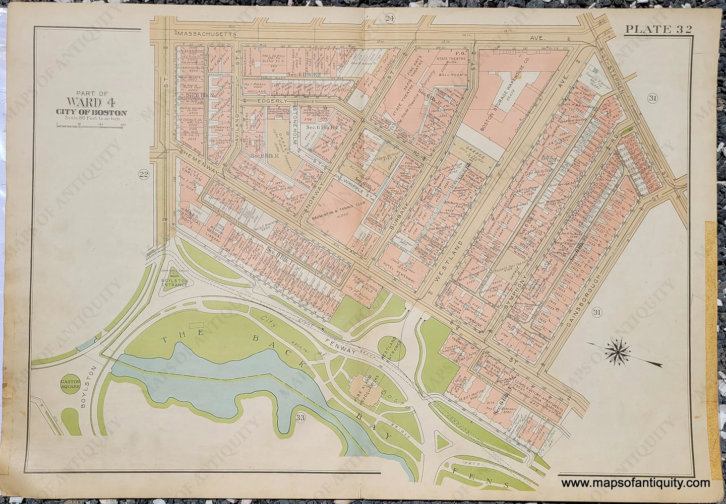 Antique map of part of Boston from the Atlas of the City of Boston, Boston Proper and Back Bay, by G.W. Bromley & Co. 1938. This map includes the area near Berklee (which was not founded until 1945- on this map the building is labeled Fritz-Carlton), the Back Bay Fens near Mothers Rest, Massachusetts Historical Society, Massachusetts Ave, Boyleston St, to Gainsborough St. With property owners names and vibrant original printed color to indicate the types of buildings for tax and insurance purposes (pink is brick, brown is stone, yellow is frame or wood, and blue is iron). Fair to good condition with wear at the edges of the paper, some mild staining, some wear along the fold. This map was backed on fabric after being printed, to make it sturdy. Should frame nicely and imperfections at edges can be hidden under a mat. Measures approx. 23 x 33 inches to the paper edges.