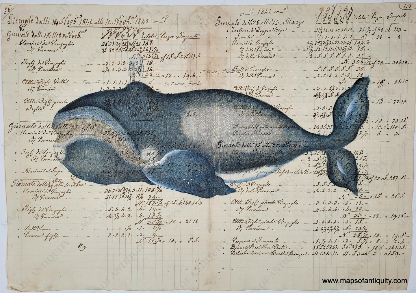 High-quality hand-printed and hand colored reproduction of an antique print of a Bowhead Whale. Printed on antique notebook/ledger paper. Made using a combination of modern technology and traditional methods, wherein an original is scanned, its likeness is digitally etched onto an engraving plate, then the plate is used to print the image in the traditional way, with a printing press, on antique paper. The print is then hand colored. Entire page measures approximately 14.5" x 20.5". For other reproductions made in this method, please see the left side bar category "Digitally Engraved Specialty Reproductions". ** Additional unique versions may be available, please contact us if you are interested.**