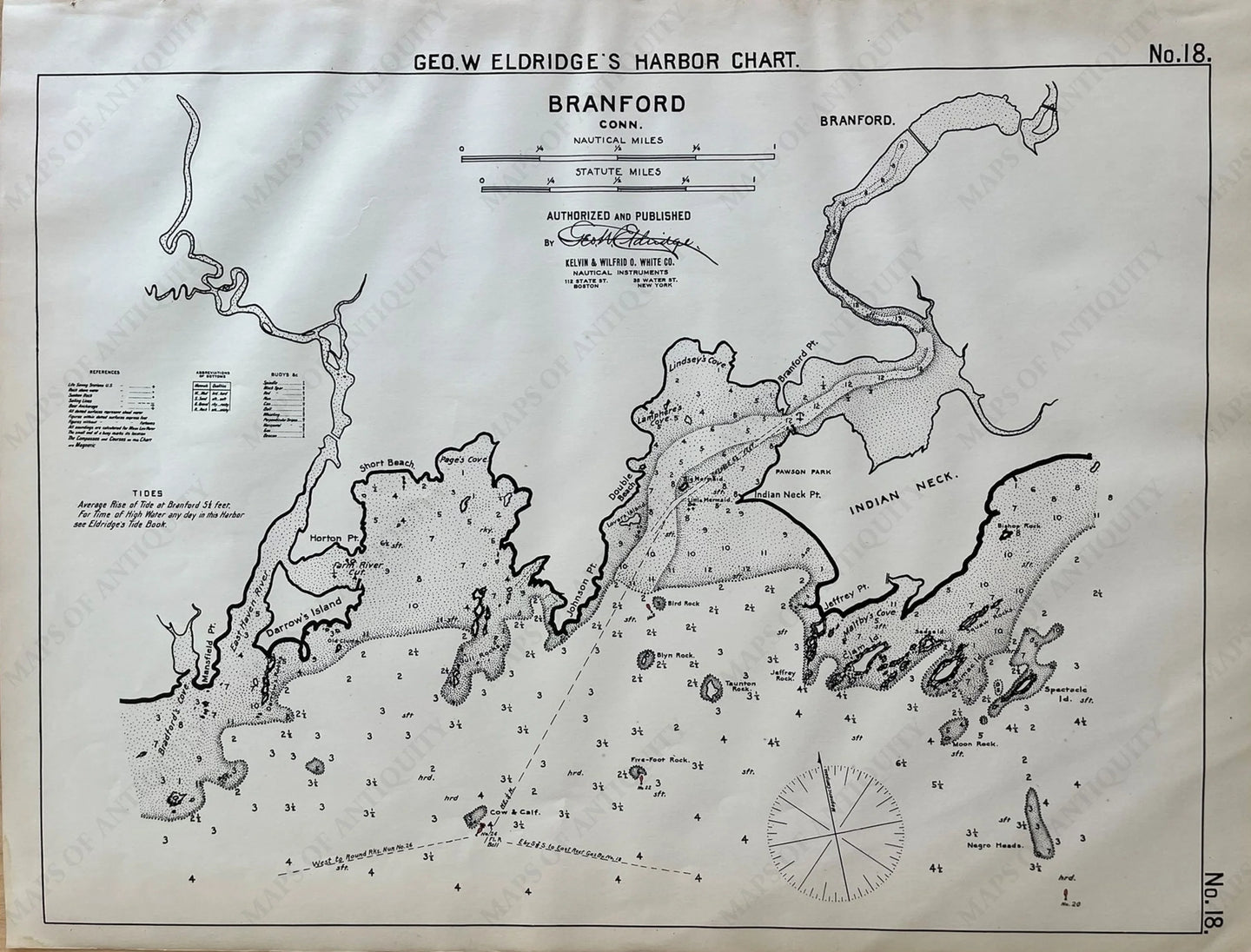 Black and white antique Nautical Chart of Branford, Conn., with Indian Neck, Darrow's Island, Bradford's Cove, East Haven River, and Jeffrey Pt., No. 18 by George W. Eldridge. Shows water depths, as well as key for location of Buoys, location of Rocks, Sunken Rocks, Life Saving Stations, Sailing Lines, Best Anchorage, etc. Very good overall antique condition, evenly toned, with some minor wrinkling of the antique paper. Measures approx. 19 x 14 inches.