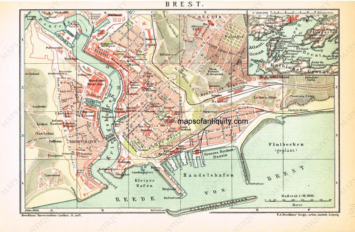 Antique color map of Brest, France, including River Penfeld, landmarks, street patterns, parks, wharves, in German. Very good overall antique condition, top margin reduced, approx. 5.5 x 8.5 inches.