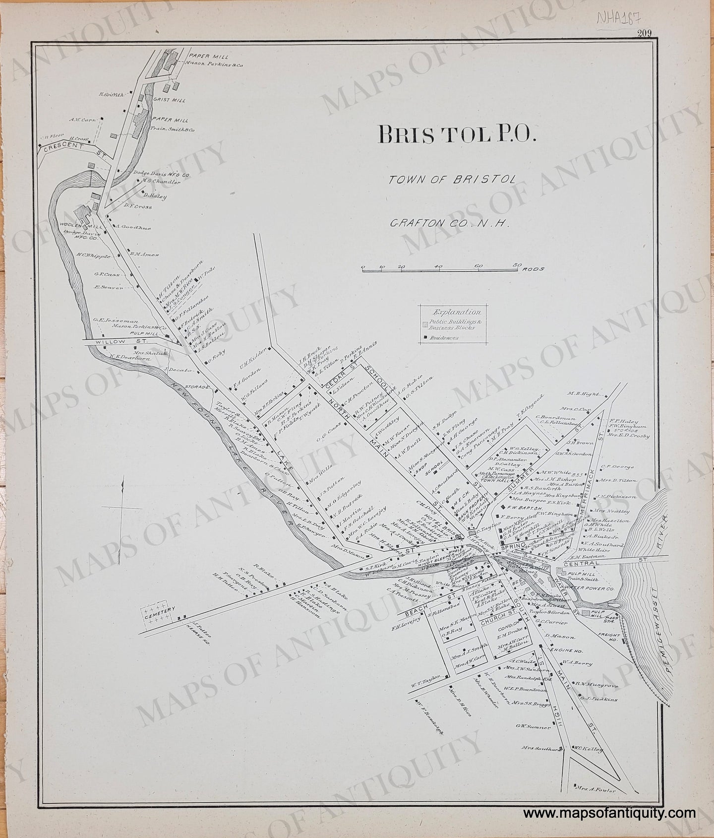 Antique black and white map of the vicinity of the Bristol Post Office in Bristol, New Hampshire. From the Town and City Atlas of the State of New Hampshire, by D.H. Hurd, 1892. Includes the names of property owners at the time of publication. Very good antique condition with some toning of the paper and a couple spots of very minor foxing/soiling, mainly outside the neatline. Measures approx. 13 x 17.25 inches.
